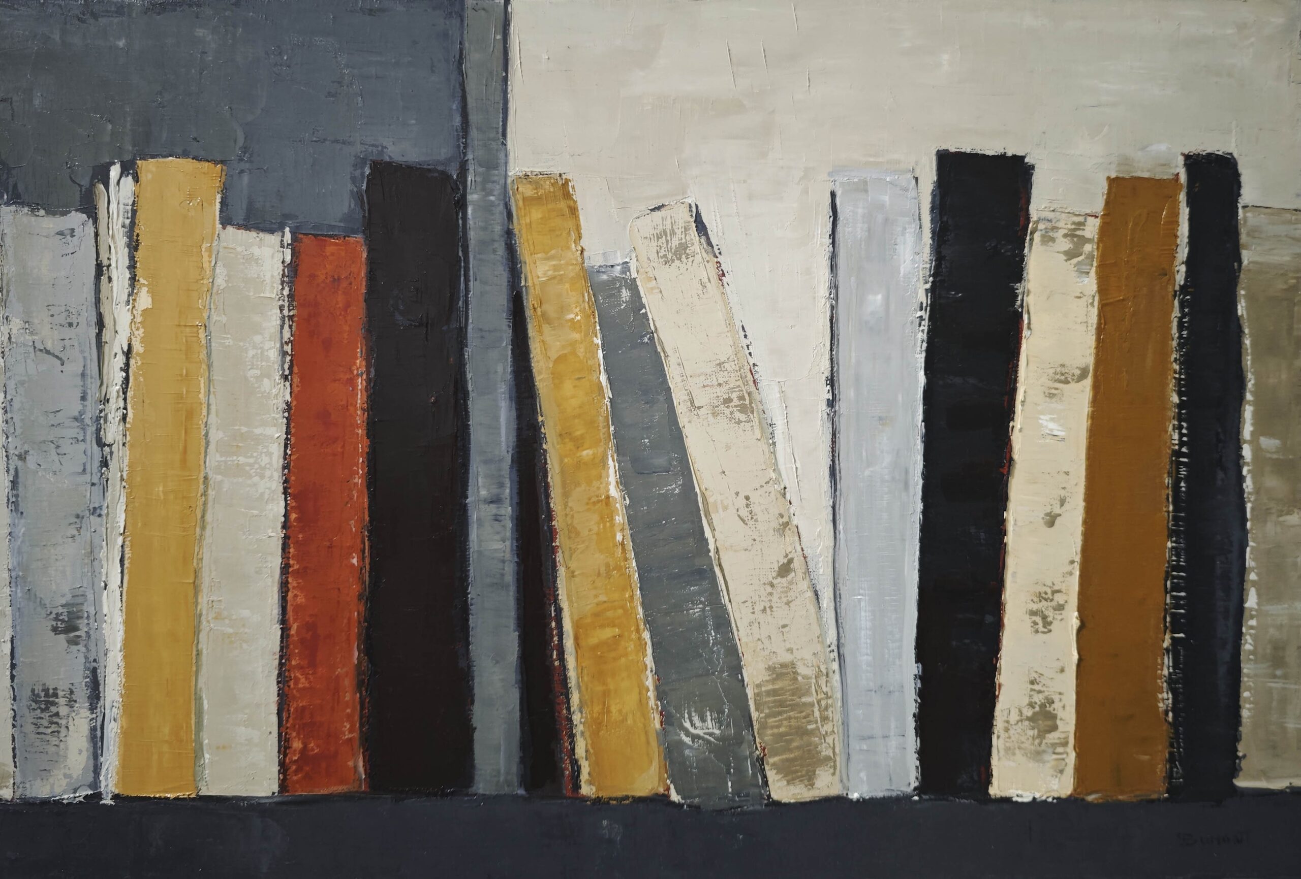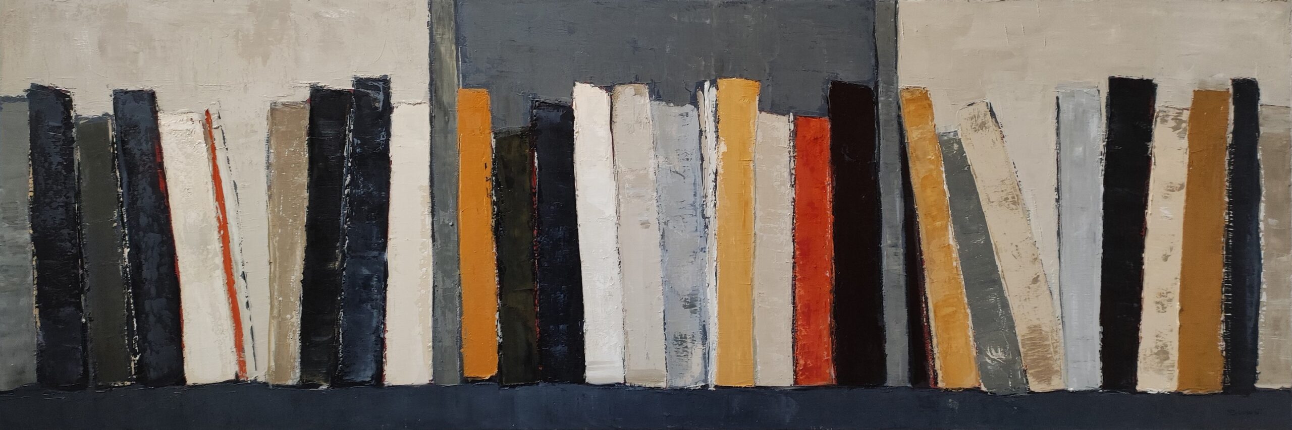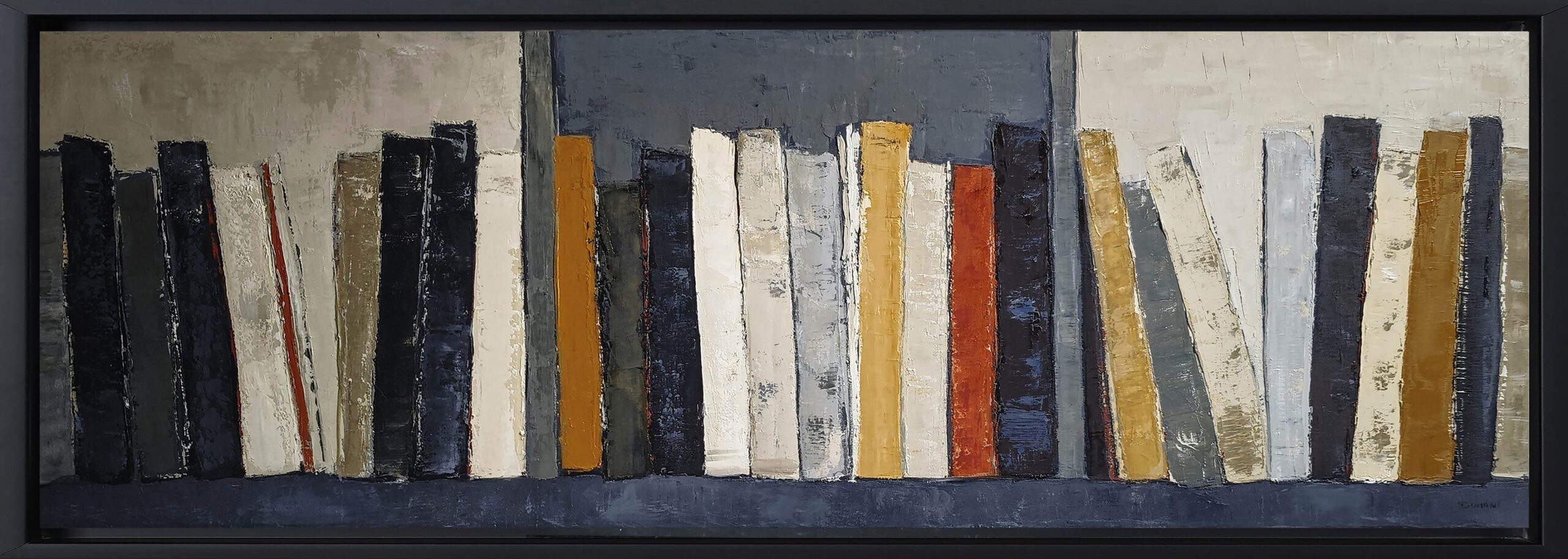 In Lignes de pensée, Sophie Dumont explores the world of the abstract library with rigor and sensitivity. Aligned like fragments of memory or mental layers, the book spines rise in a broad, rhythmic composition, both structured and vibrant.
