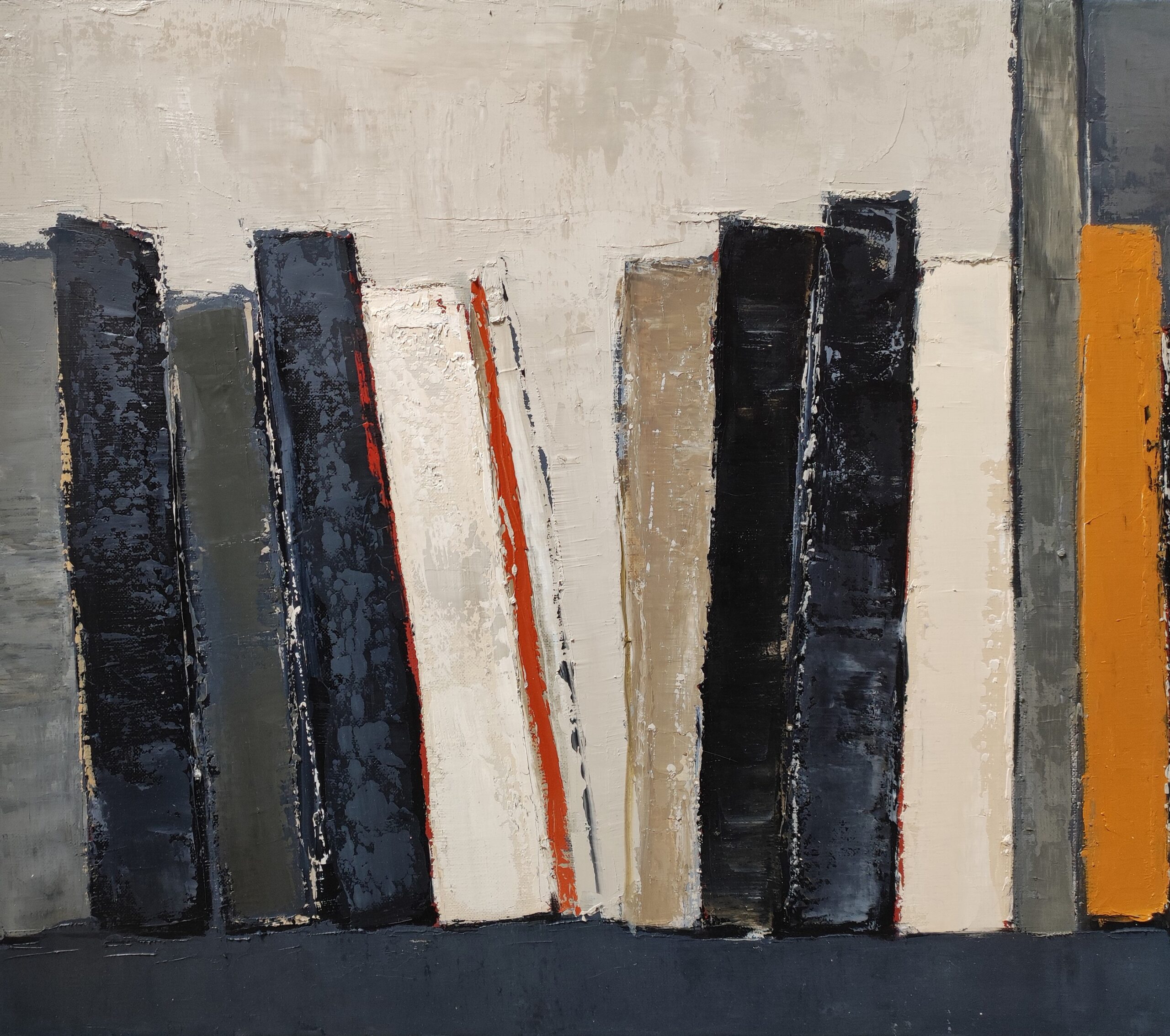 The verticality of the elements, placed against a sober background, evokes inner order, concentration, but also the stirrings of ongoing thought. The palette—muted, elegant—mixes blacks, deep grays, off-whites, golden browns, and oxidized reds. Each slice seems to carry a silence, a trace, or a tension.