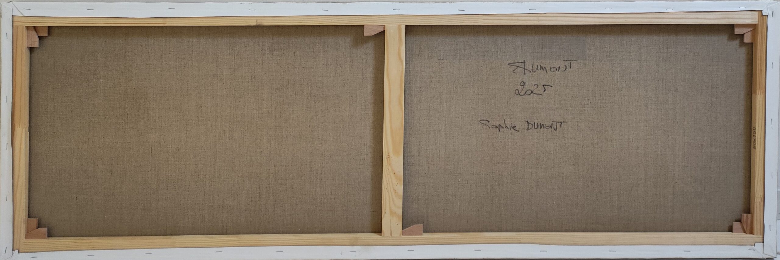 The panoramic format accentuates this impression of a horizontal reading of a mental landscape, as if each segment opened onto an inner narrative. It is a painting that speaks of memory, of knowledge, but above all of the space they occupy within us—vertically, internally.