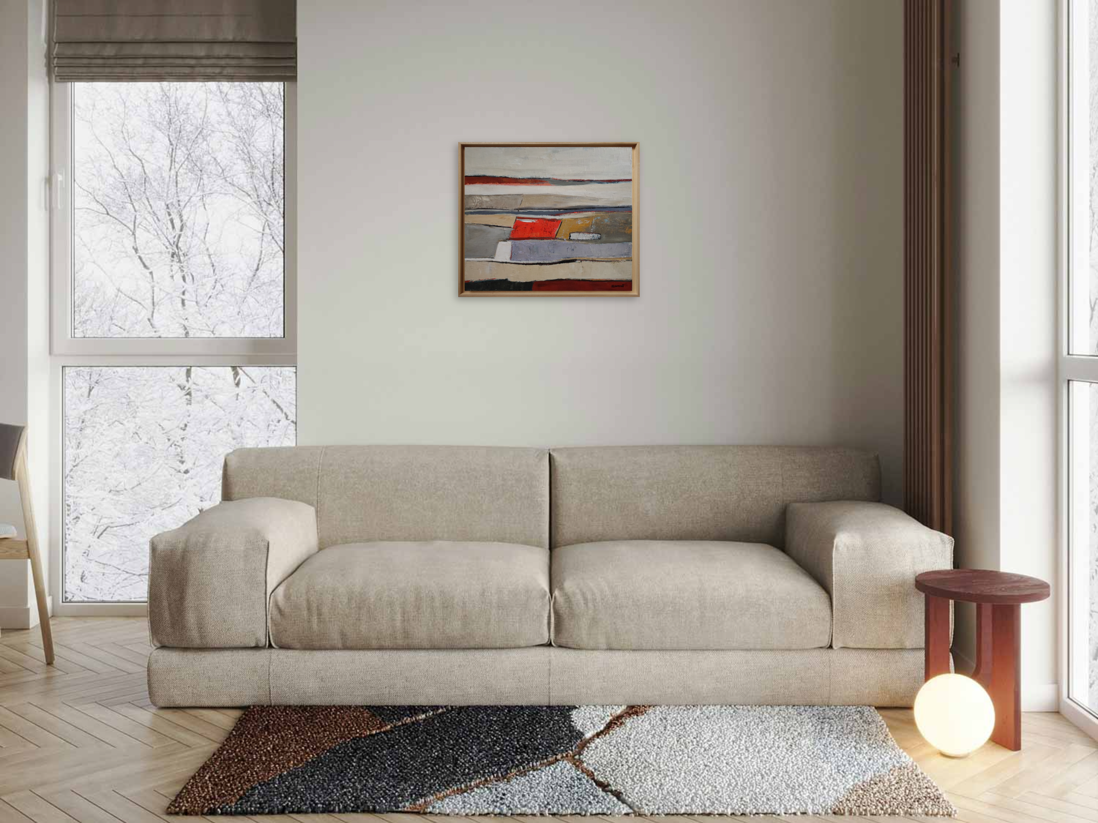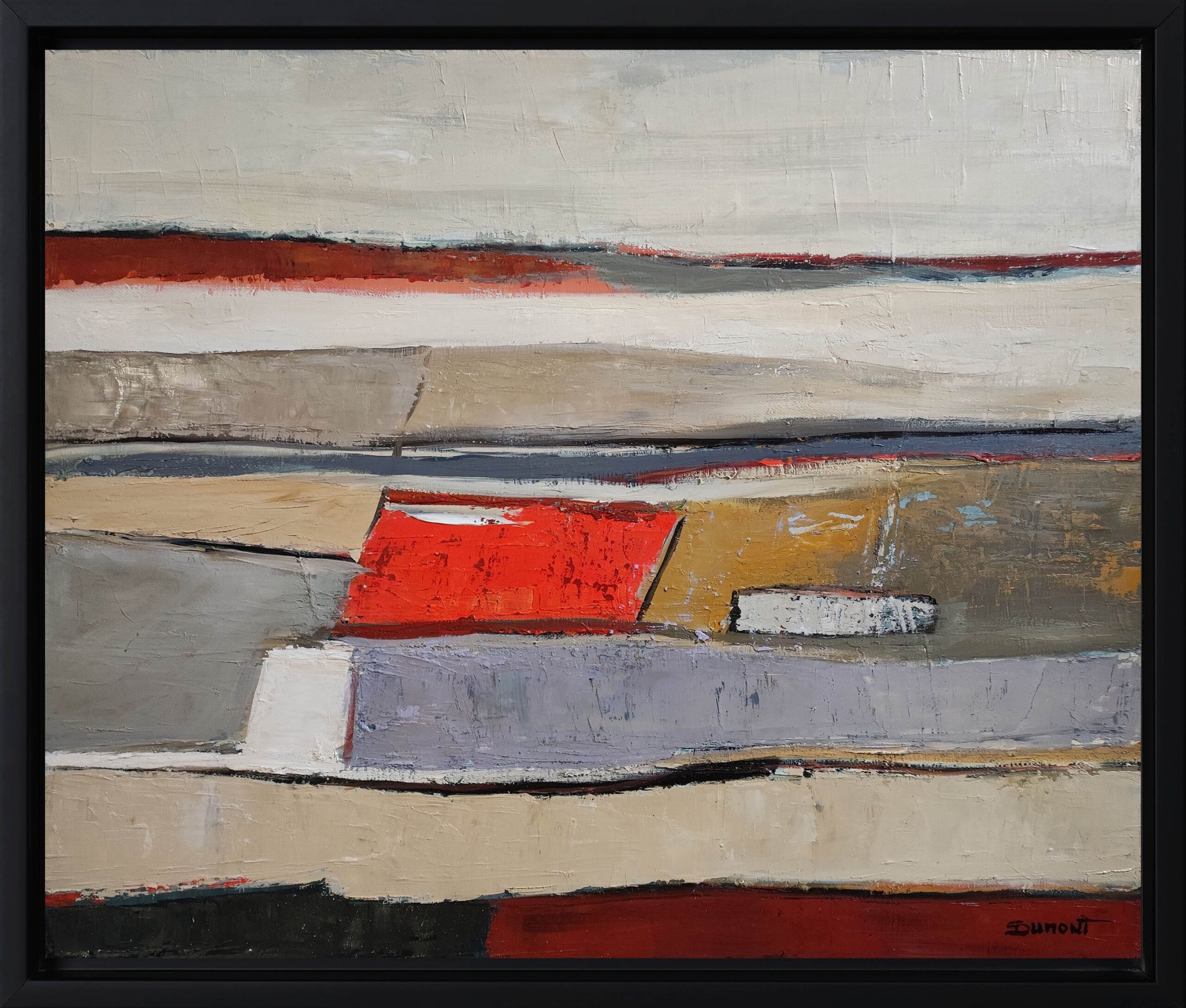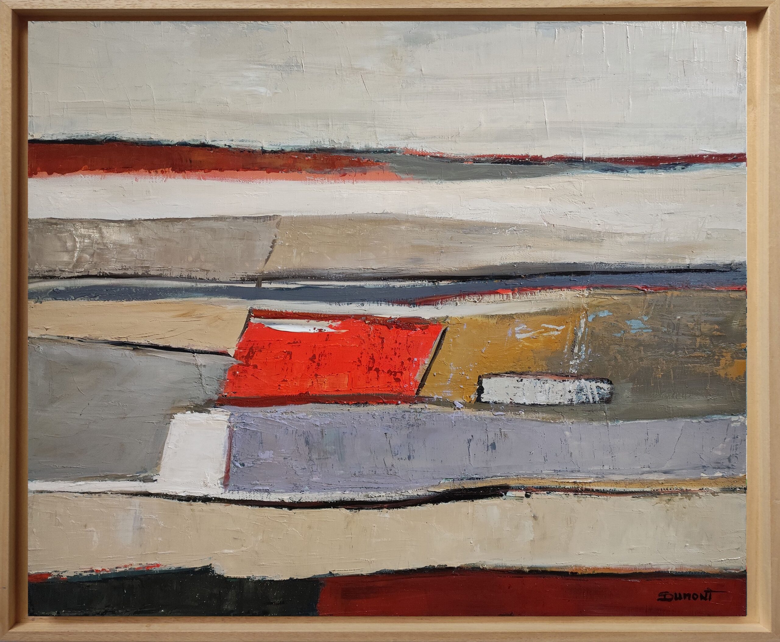 The composition rests on a subtle balance between structure and effacement. The lines remain present without ever becoming rigid, while the colored areas—beiges, muted grays, patinated ochres, and deep reds—are organized within a deliberately restrained palette. Each color seems applied with deliberate restraint, as if inscribed within a larger memory built from accumulated layers and time.