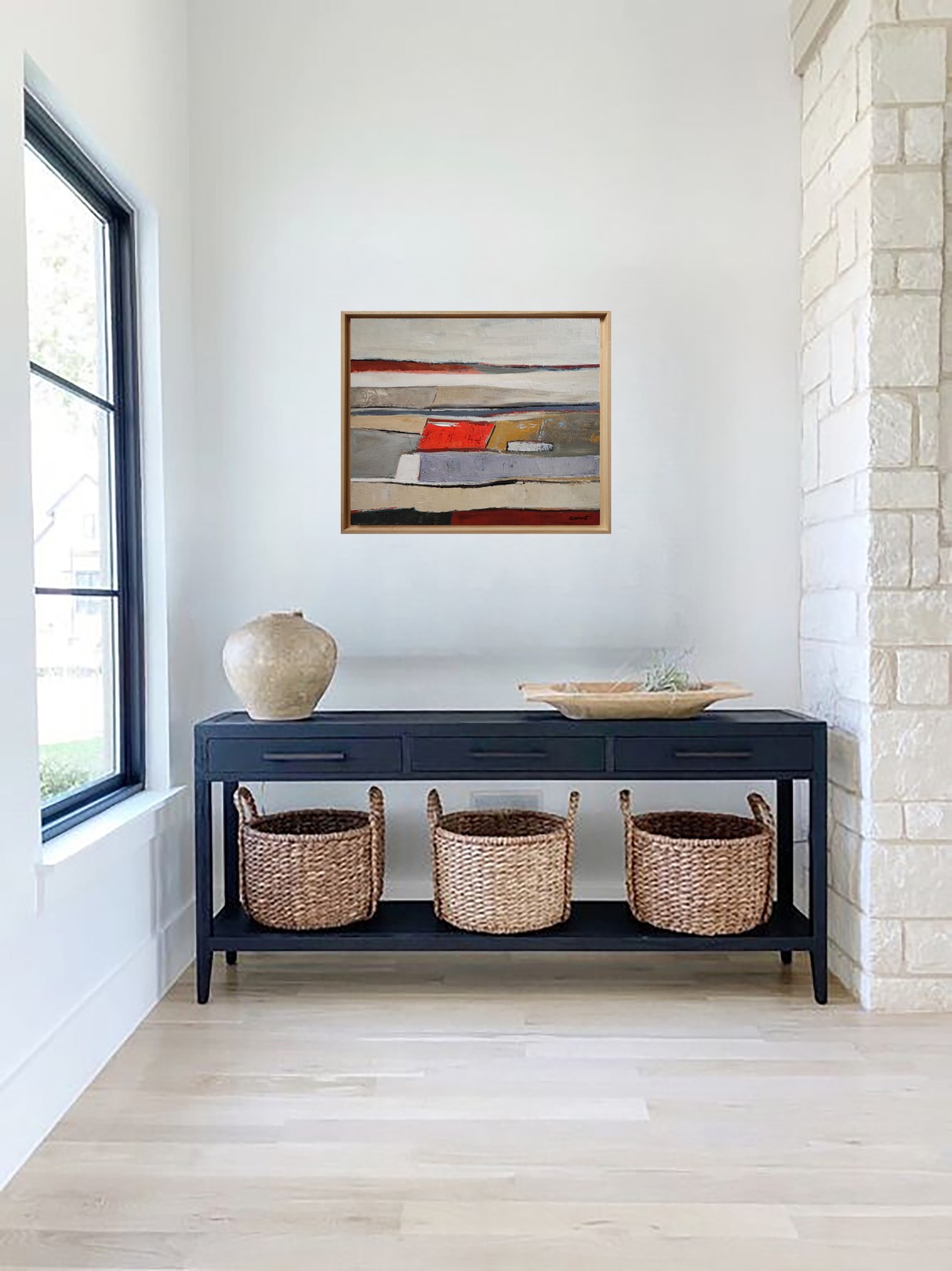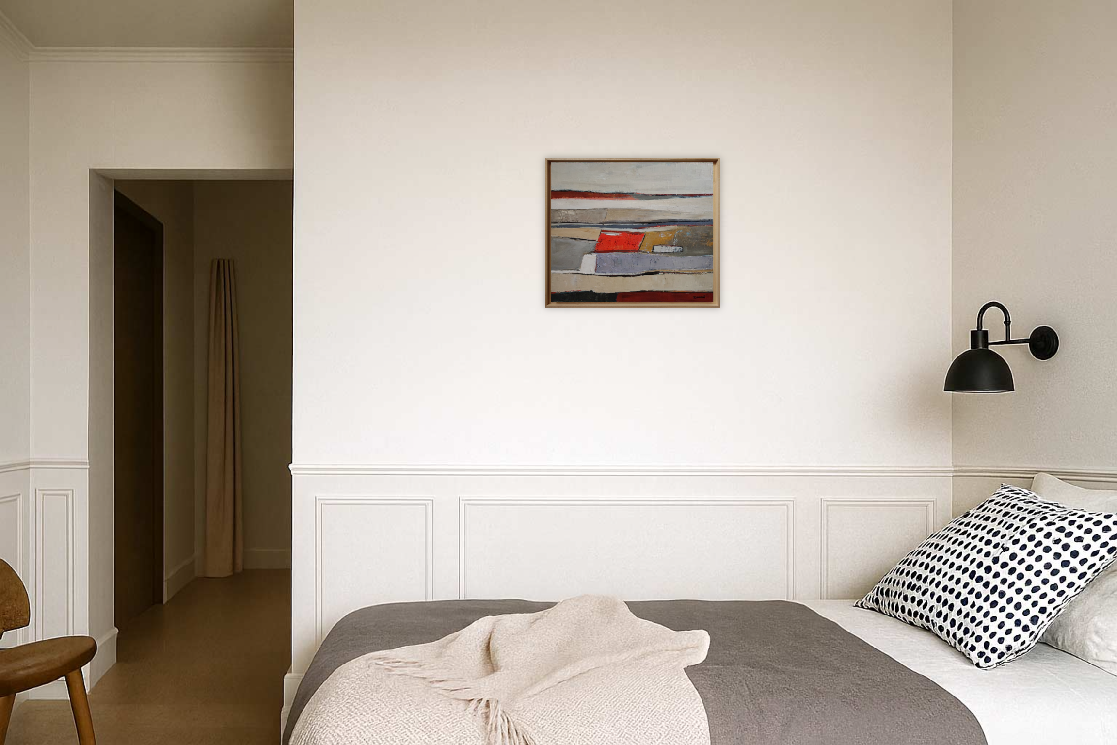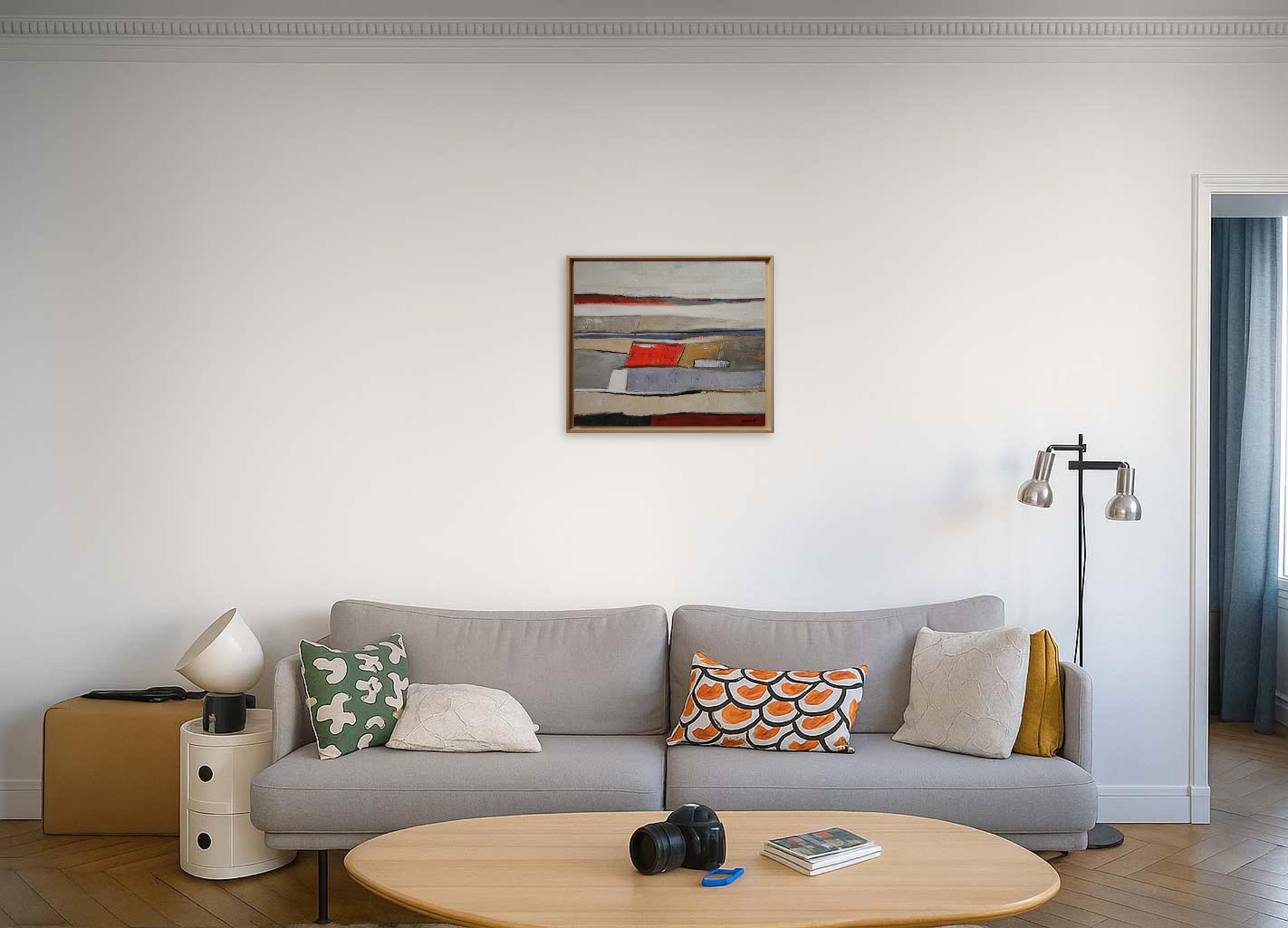 The composition rests on a subtle balance between structure and effacement. The lines remain present without ever becoming rigid, while the colored areas—beiges, muted grays, patinated ochres, and deep reds—are organized within a deliberately restrained palette. Each color seems applied with deliberate restraint, as if inscribed within a larger memory built from accumulated layers and time.