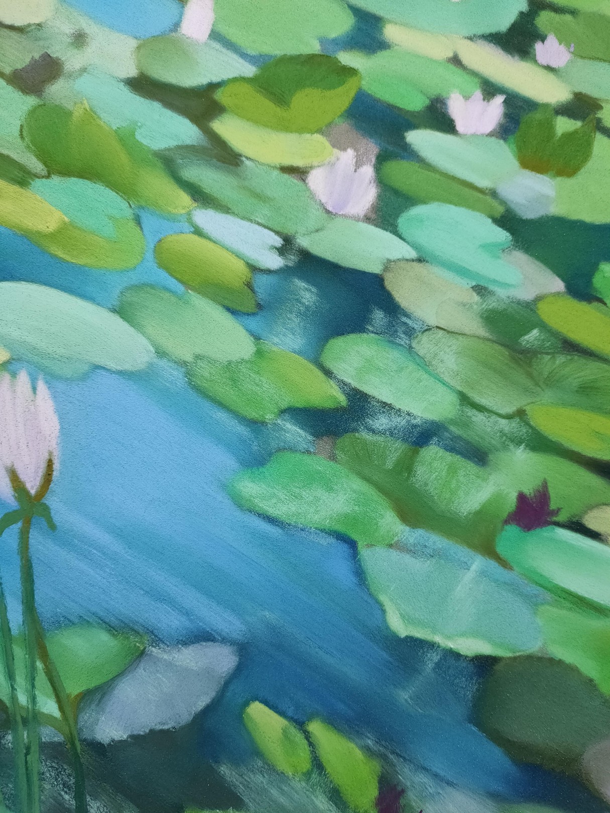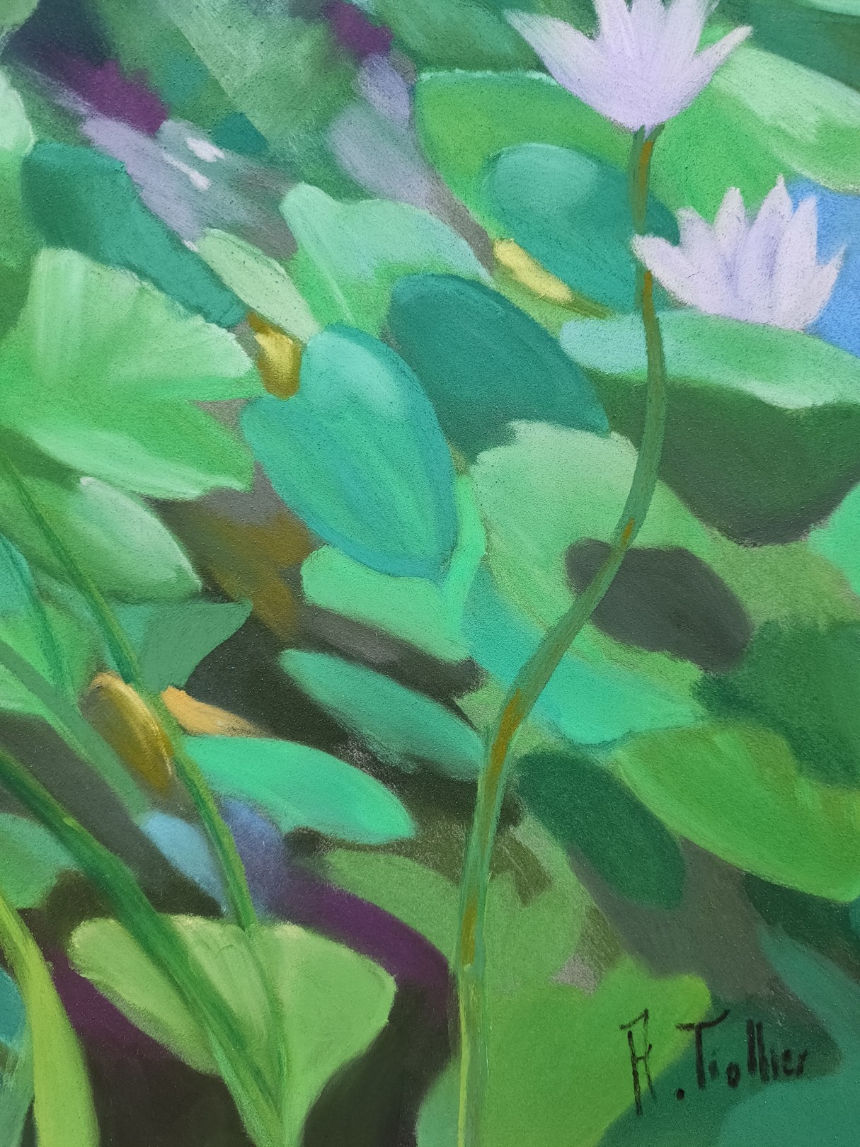 This captivating artwork depicts a pond covered in water lilies, bathed in soft, soothing light. Shades of vibrant green and serene blue blend harmoniously, creating a calm and dreamy atmosphere. The delicate water lily blossoms, resting on the surface, add touches of white and pale pink, accentuating the freshness and purity of the aquatic scene. The beautifully detailed leaves display a diversity of shapes and hues, bringing depth and dynamism to the composition. The artist masterfully captures the subtle interplay of light and shadow, evoking both the movement of the water and the tranquility of a summer morning. This work transports the viewer to an enchanting and harmonious natural world, where every element invites contemplation and escape.