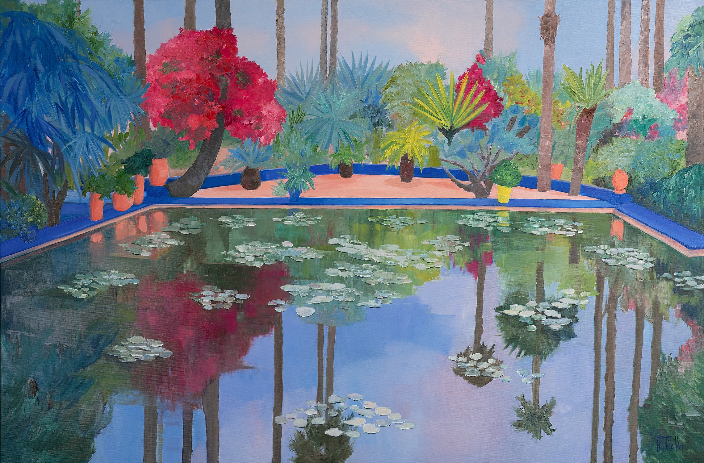 This large format work will transport you to a mythical garden that is the Jardin Majorelle in Morocco, with exotic colors. The red of Bougainvillea rubs shoulders with yellow, blue, ocher, green, all in perfect harmony, without forgetting the blue-green shades of Mediterranean plants.