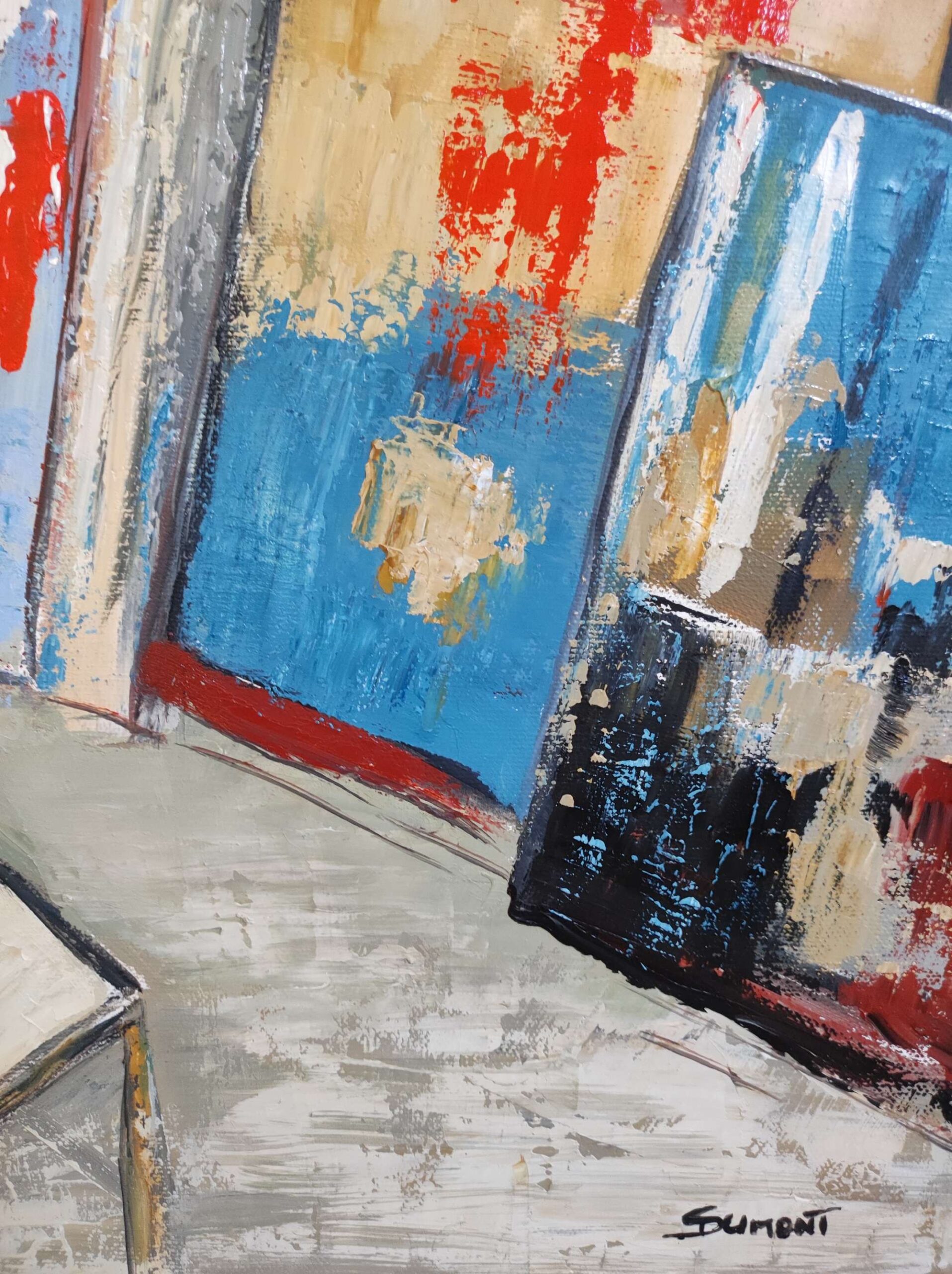 Artist’s studio in orange hues with an ever-present material and hues that vibrate with the succession of layers on the canvas. The canvases are scattered on the floor or on an easel, just like in the artist’s studio, which plunges us into his universe.