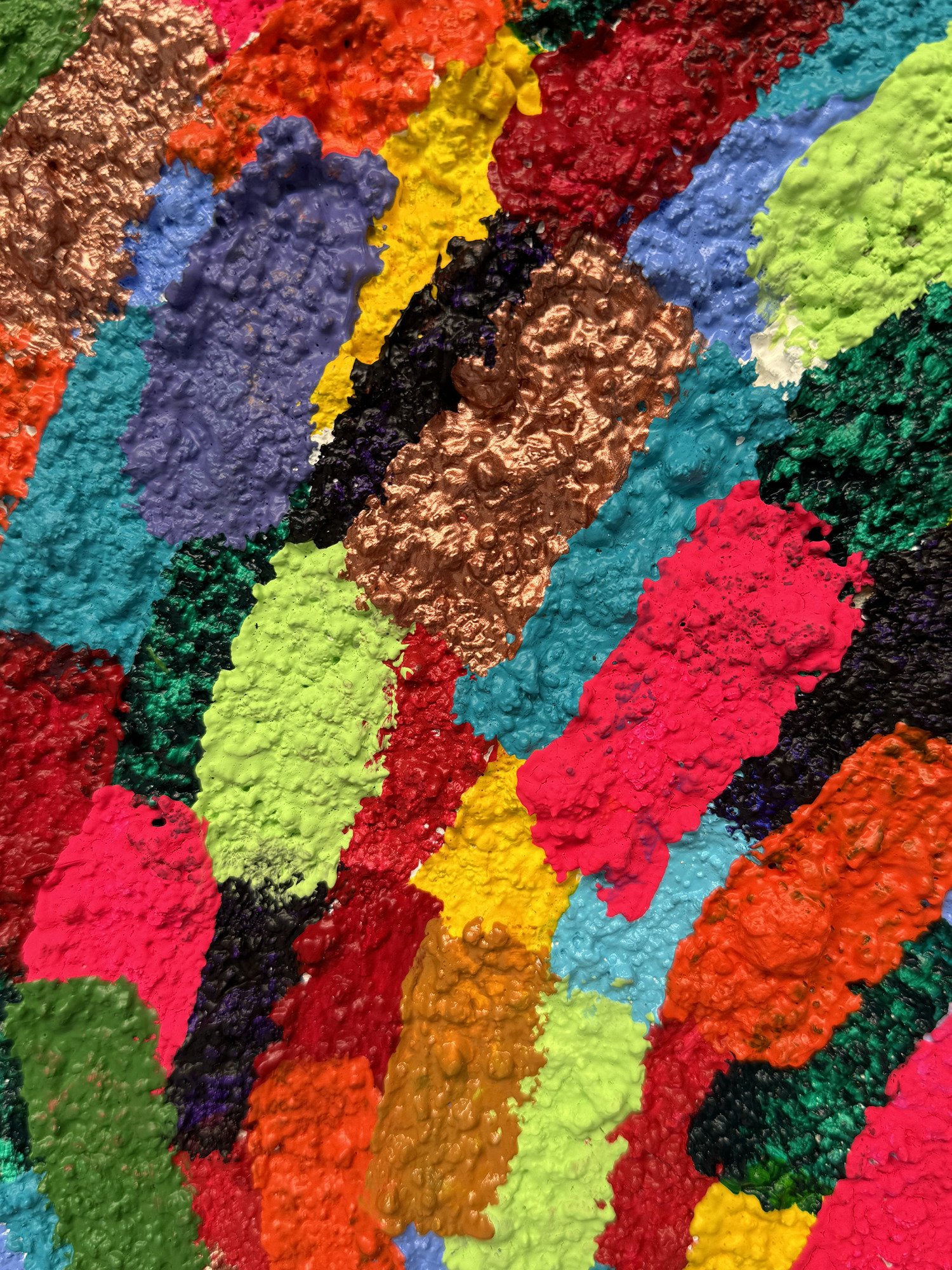 This is a dizzying harmony of brilliant colors and dynamic movements so masterfully combined as to arrest the viewer’s attention and keep him in its thrall. The work is a tapestry of strokes, each carefully placed to create a whirling rhythmic pattern. The palette is complex and diverse, ranging in vivid spectrum from reds to blues and greens, yellows, and purples in an interplay that is harmonious. What is particularly unique in this work is the implicit suggestion of movement and energy through an apparently chaotic but effectively structured composition. The artist paints thickly with a textured, almost tangible quality to the surface. The swaths of color seem to pulse and undulate; the eye is drawn toward the fluid pathways forged by the brushstrokes. What makes this particularly striking, of course, is the color contrast: the juxtaposition of bold, strong hues against much softer, complementary tones creates an underscoring of depth and vivacity. Such clever usage of color theory not only serves to heighten the dynamism of the piece but even infuses a sense of cohesion and harmony into that which otherwise has the potential to be random. Essentially, this is a color in motion performance, an homage to the artist’s skill in taming paint and hypnotizing the viewer. Its unmistakable blend of structure and spontaneity makes the observer swoon into the density of its details and revel in its vibrant energy.
