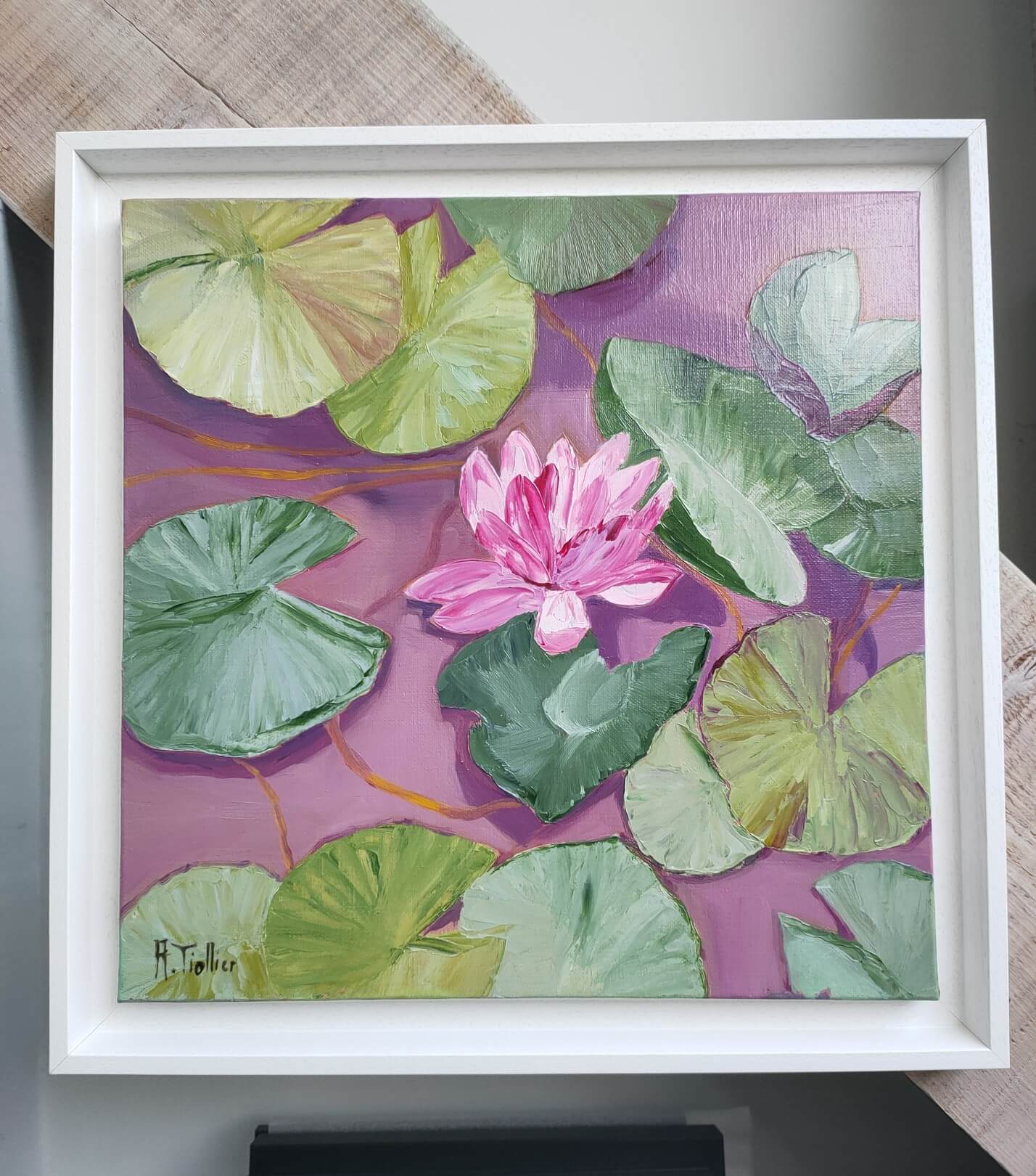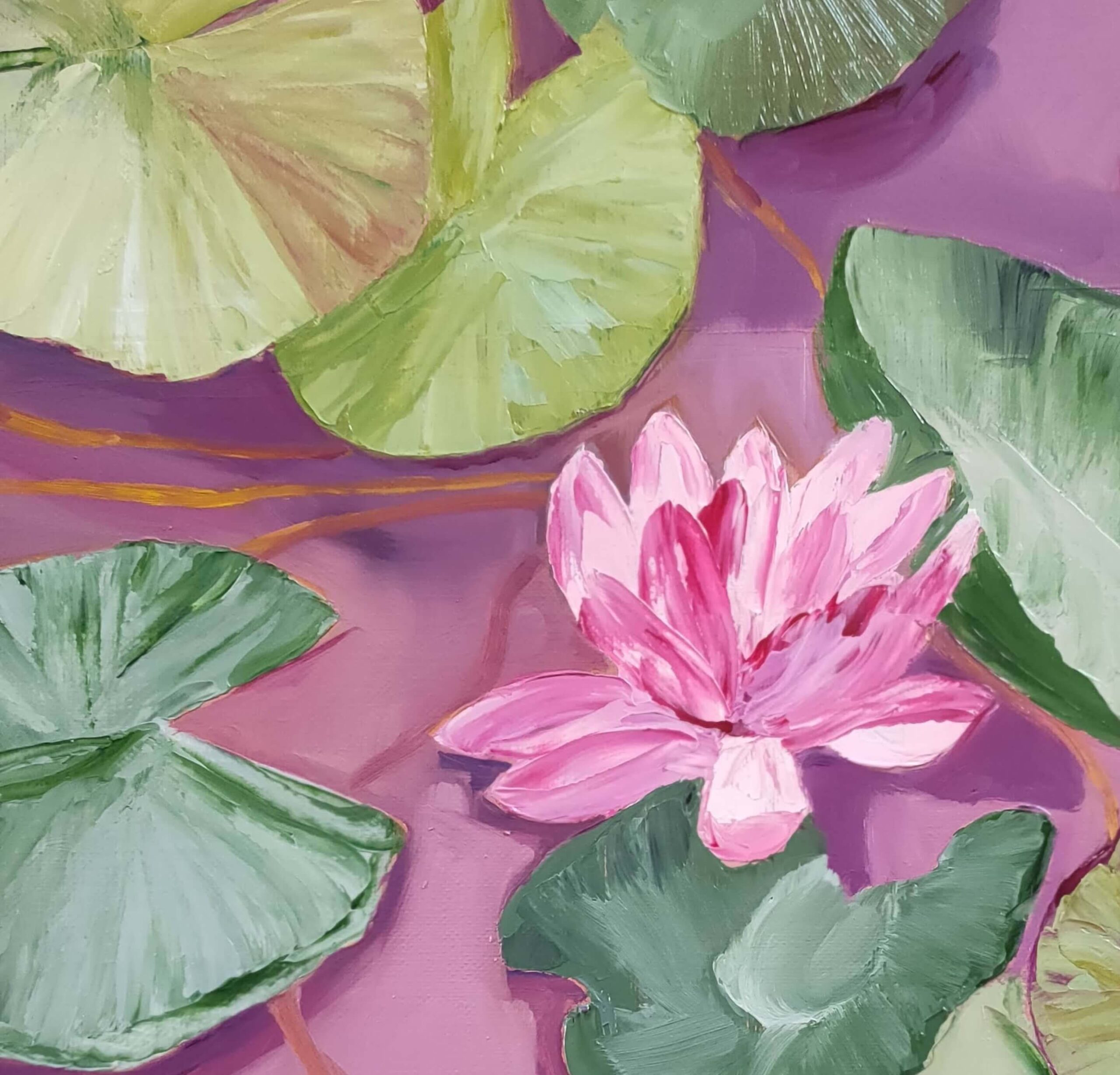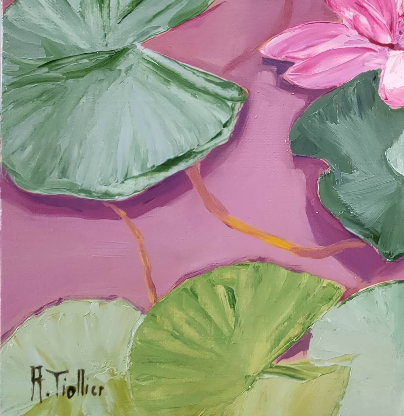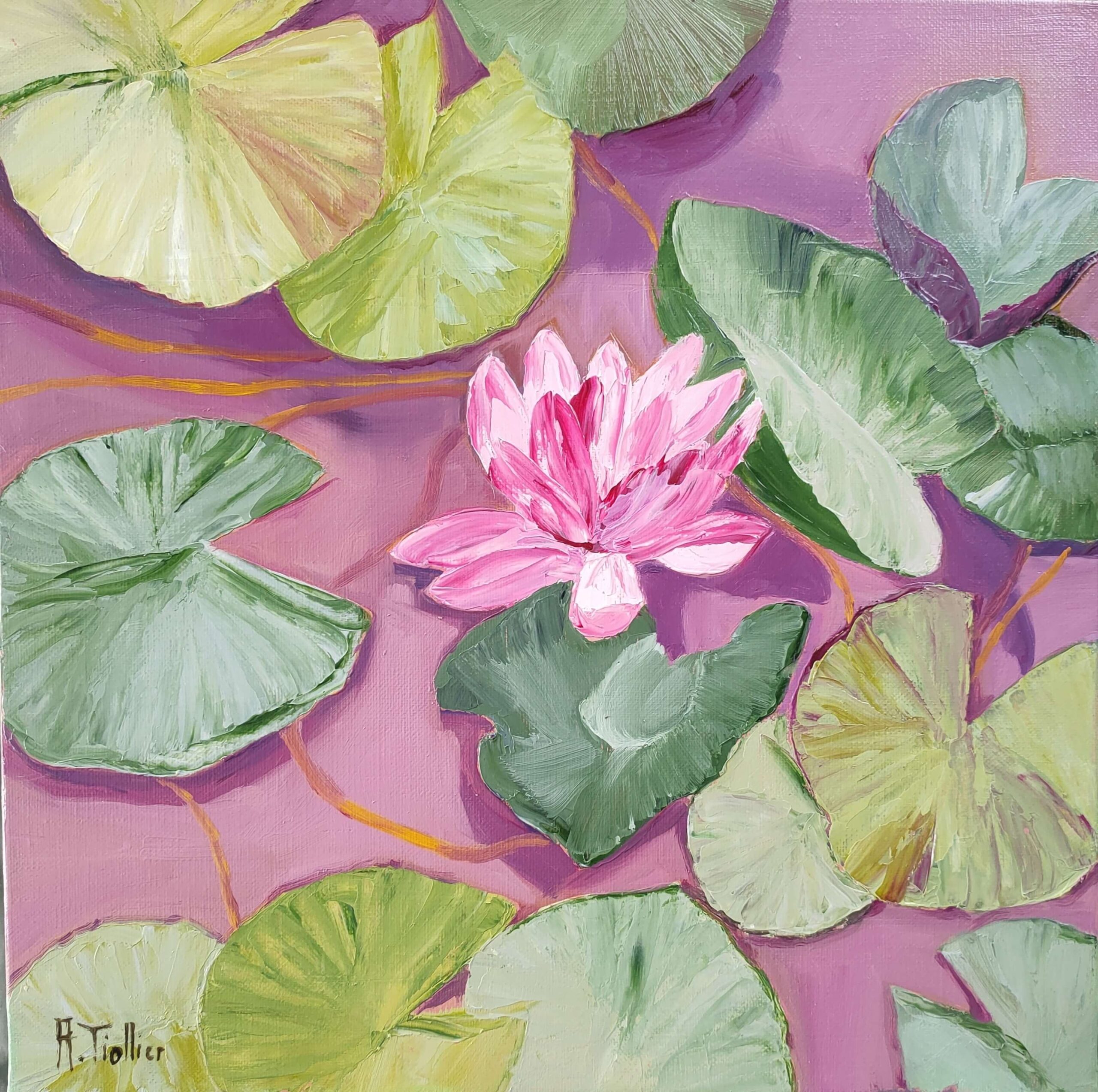 This work features a beautiful blooming pink lotus surrounded by large water lily leaves in varying shades of green. The pastel purple background creates a striking contrast, highlighting each element of the composition. The leaf vein details demonstrate remarkable finesse, adding depth and texture. The harmonious arrangement of the leaves and the central position of the flower immediately focus on the lotus, a symbol of purity and rebirth. The pastel tones used accentuate the tranquility and serenity of the scene, evoking a peaceful water garden. This painting perfectly captures the moment when nature reveals its timeless beauty and tranquility.