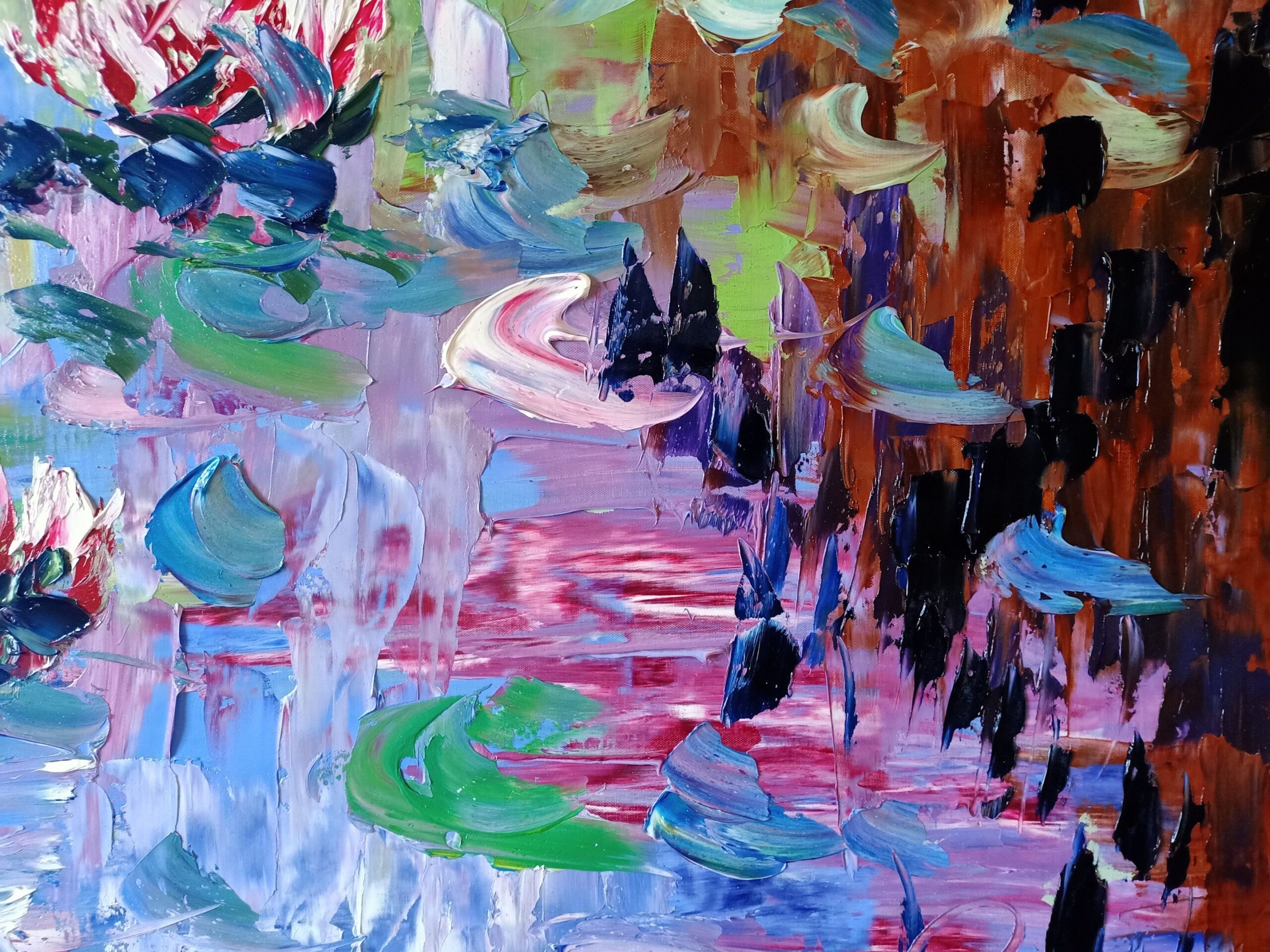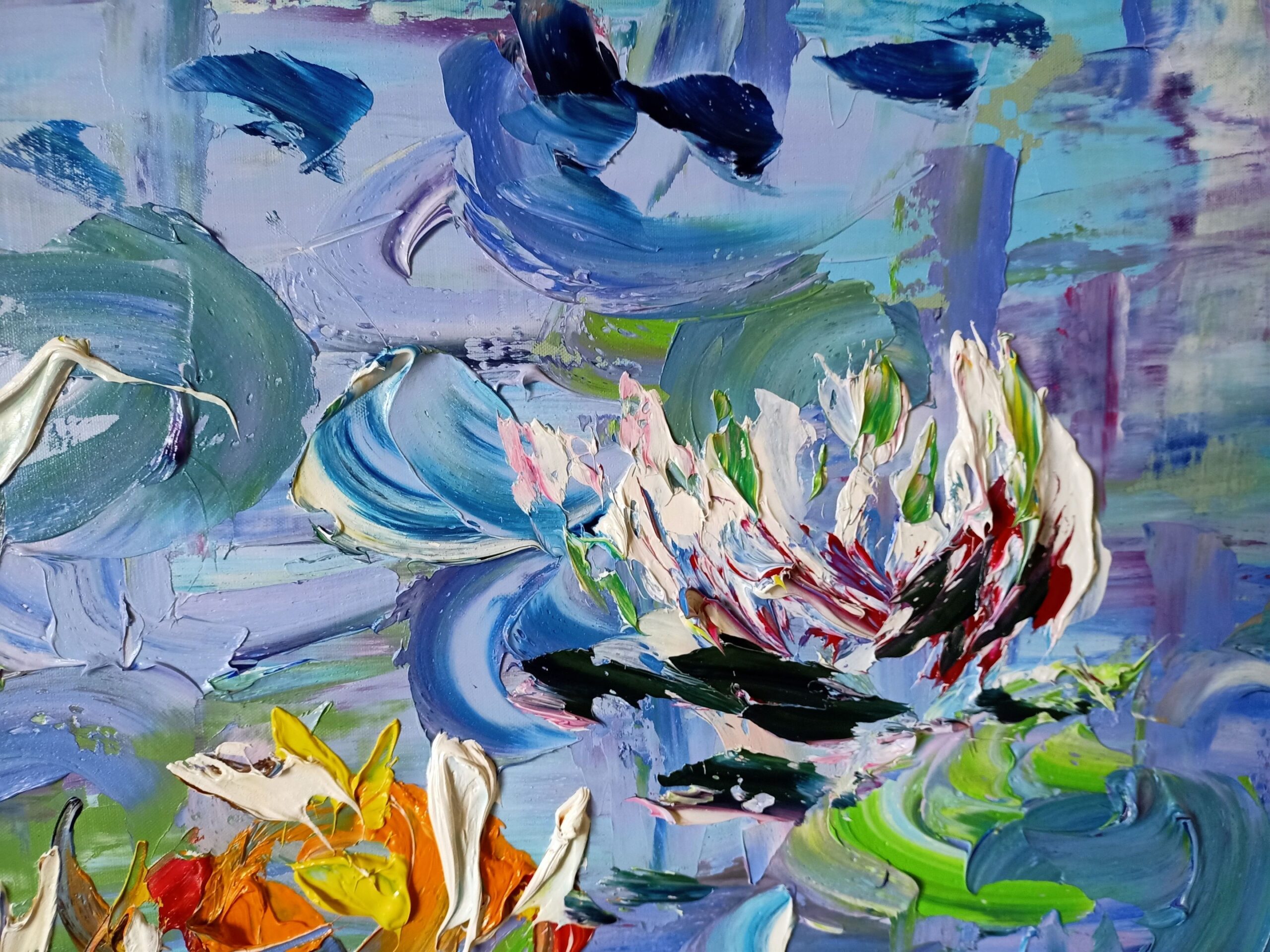 Ninfe Riflessi is a vibrant celebration of water, light, and movement, reimagined through Antonino Puliafico’s unmistakable palette-knife technique. The lake surface becomes a living mosaic of shifting blues, pinks, greens, and golds, while the water lilies rise like luminous accents suspended between reality and abstraction.