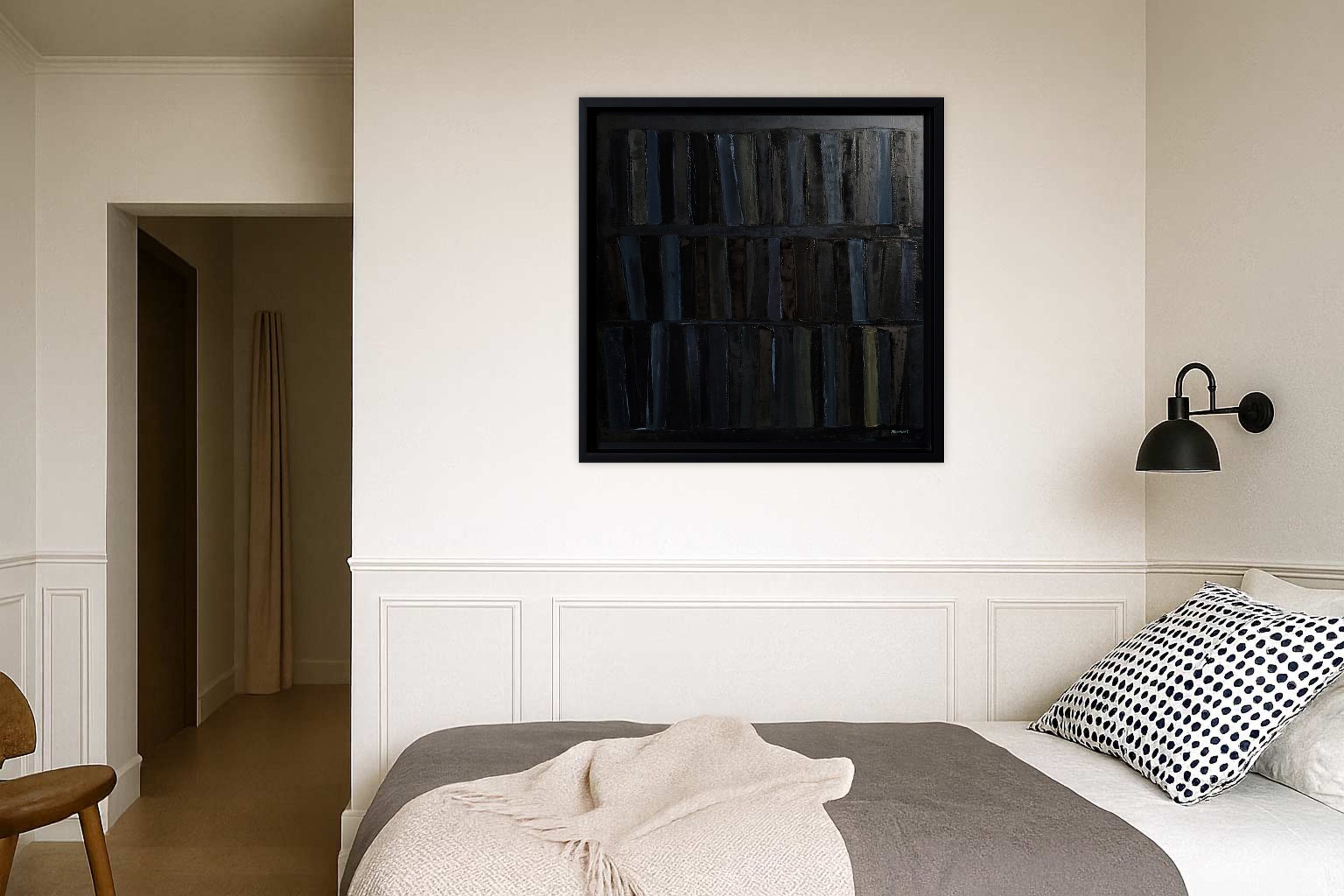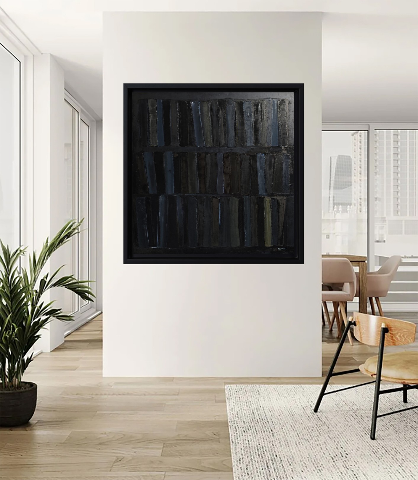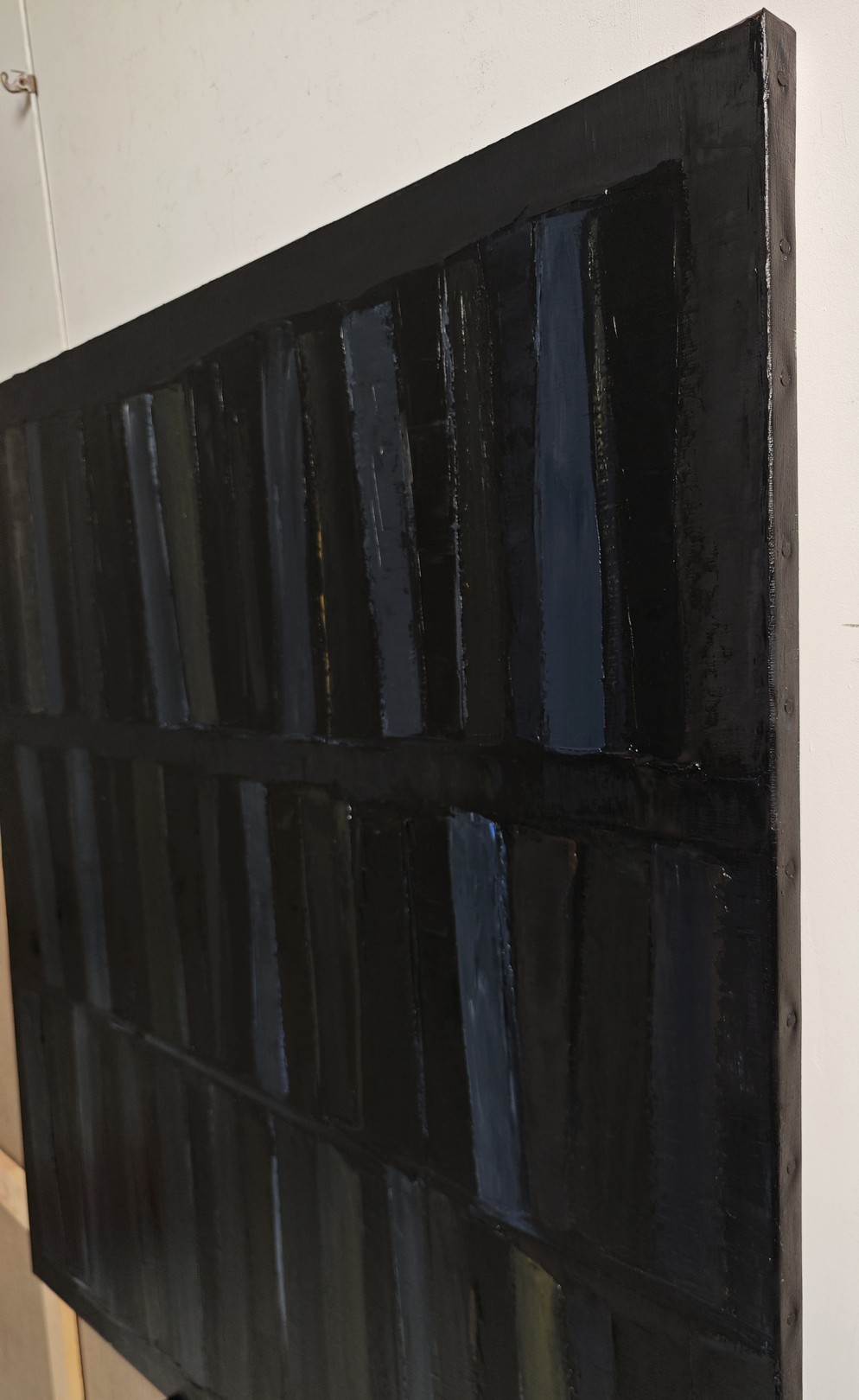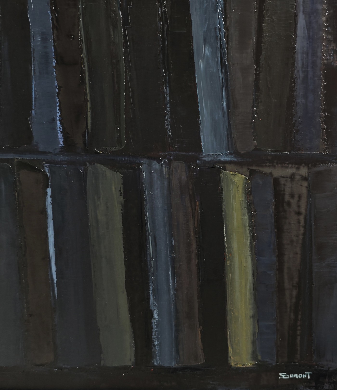 With Palimpeste, Sophie Dumont offers a pictorial meditation on the theme of trace and memory. This abstract canvas, structured in dark horizontal layers, reveals unsuspected nuances in the light—as if ancient texts were attempting to reappear beneath the layers of oil.