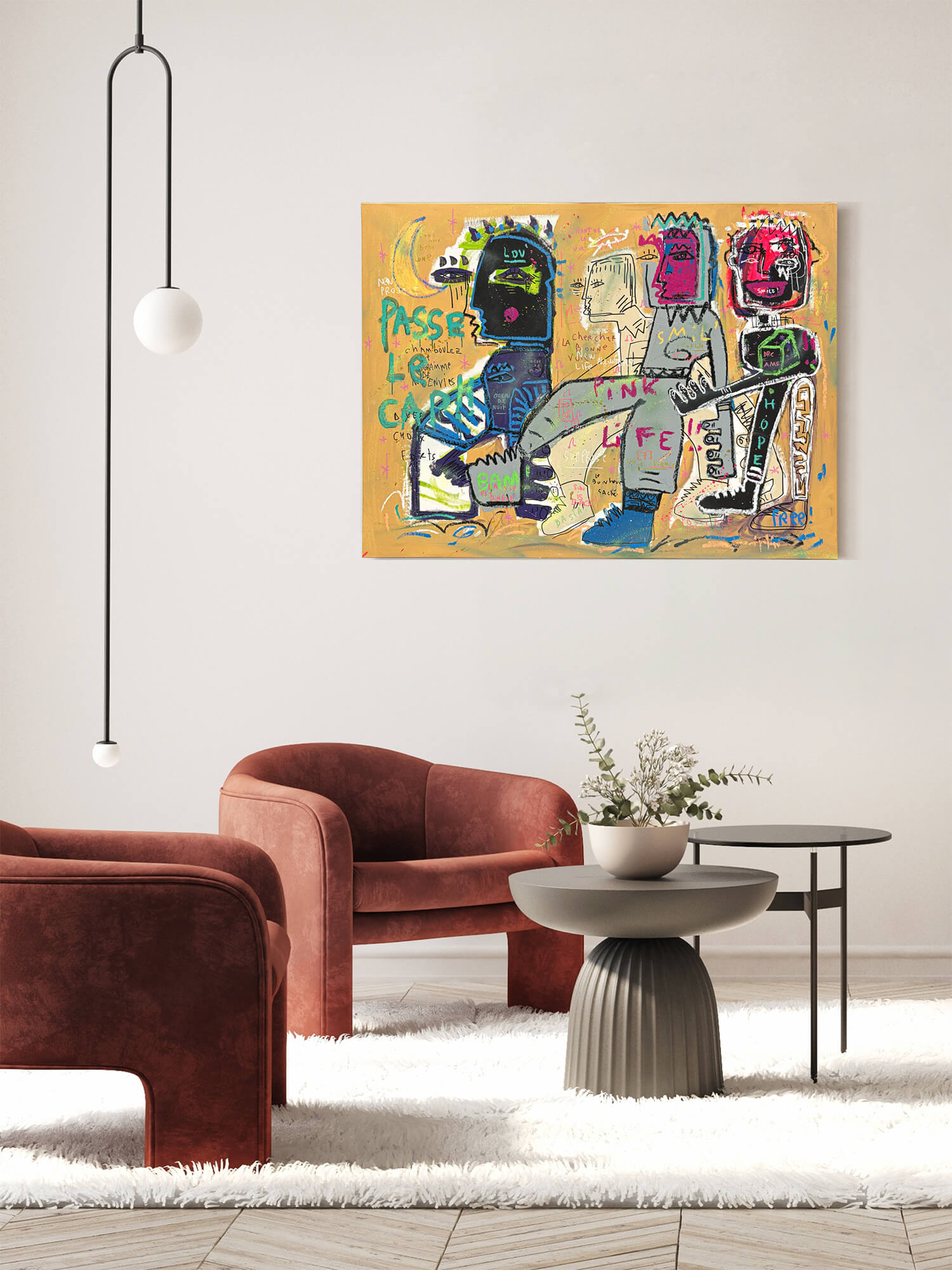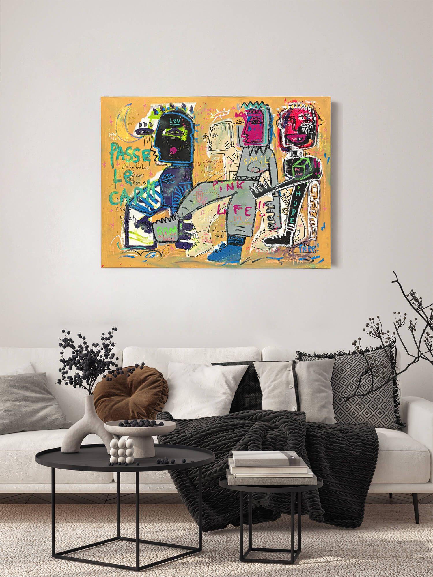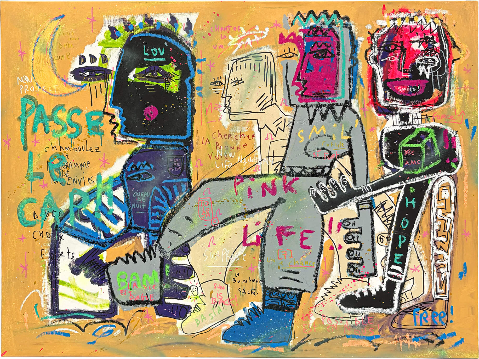 This artwork is an explosive fusion of color and form, reminiscent of street art and neo-expressionism. The canvas is dominated by bold, abstract figures outlined with dynamic, jagged lines. The color palette is vibrant yet chaotic, employing vivid reds, blues, and yellows that clash and meld into each other, creating an intense visual energy. Text elements like “PASSER LE CAP” and “PINK LIFE” punctuate the scene, adding layers of meaning and inviting interpretation. Words such as “HOPE” and “LOW” suggest an underlying narrative or commentary on human emotion and experience. The figures’ exaggerated features and unconventional proportions convey a sense of movement and urgency. This piece stands out for its raw and unpolished aesthetic, invoking a visceral reaction from the viewer. It challenges traditional artistic norms while conveying a sense of immediacy and emotional intensity.