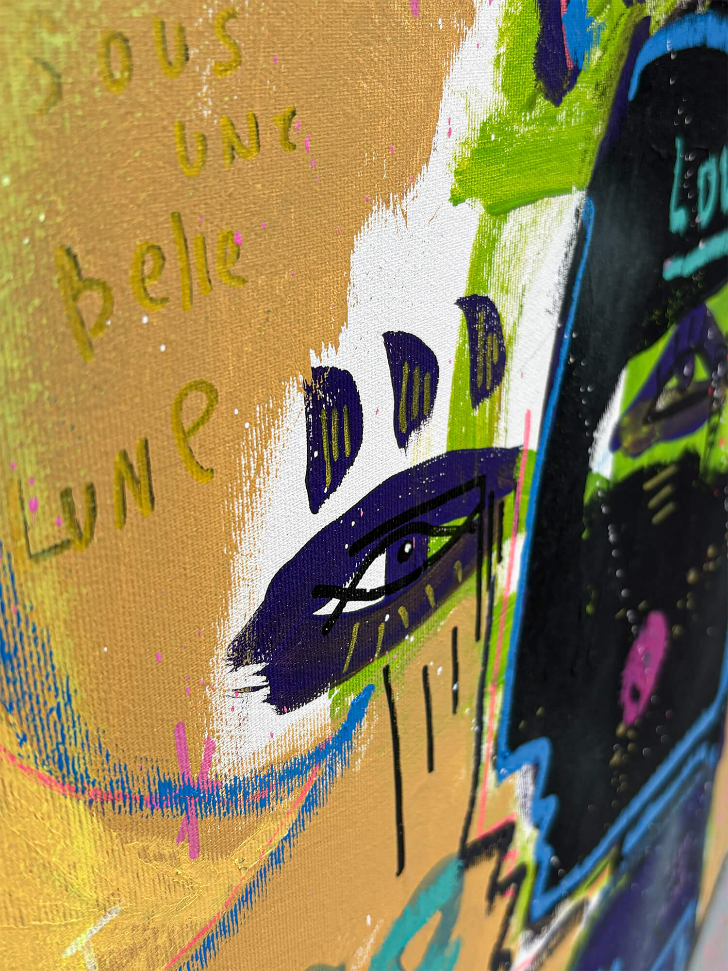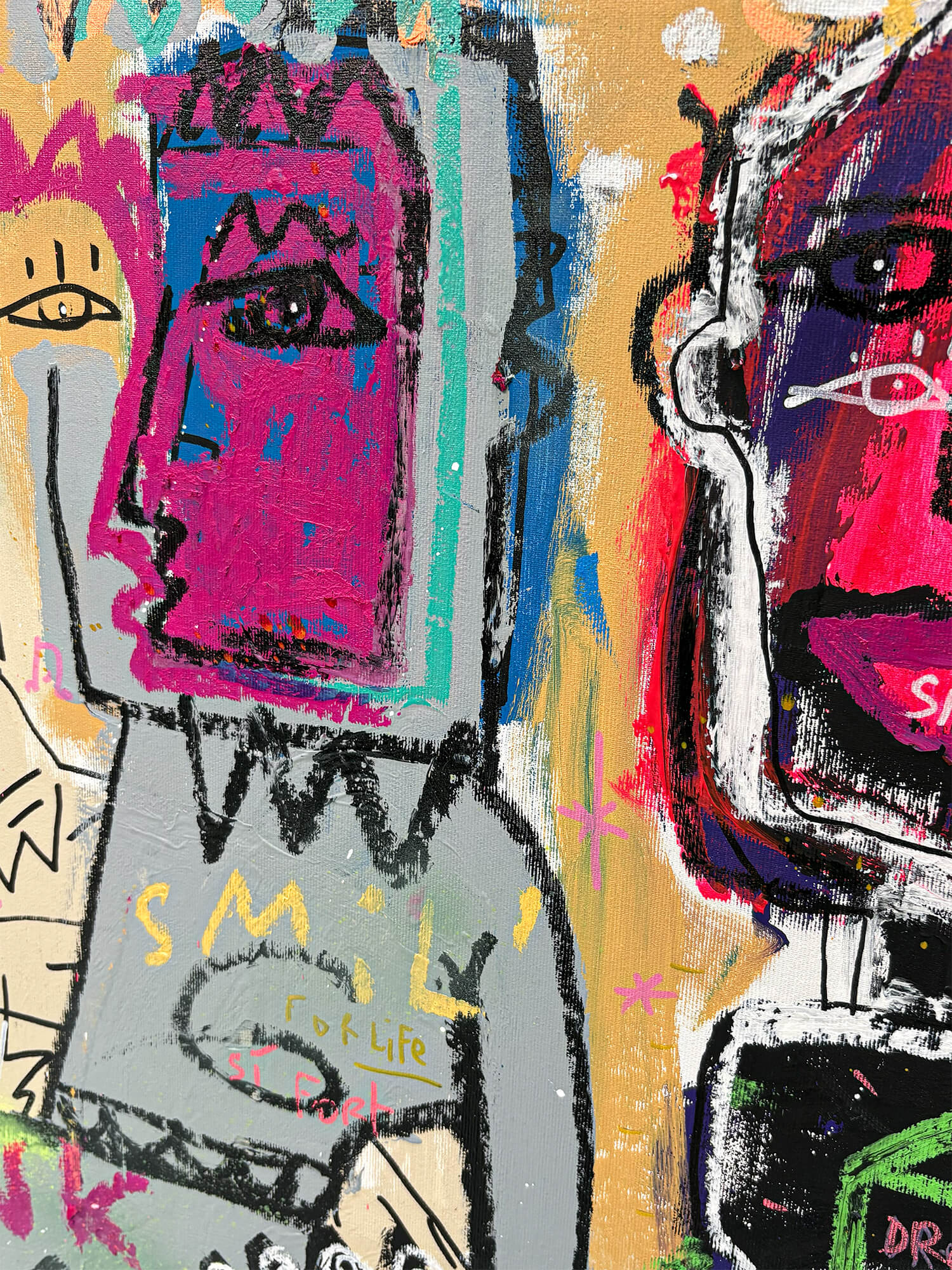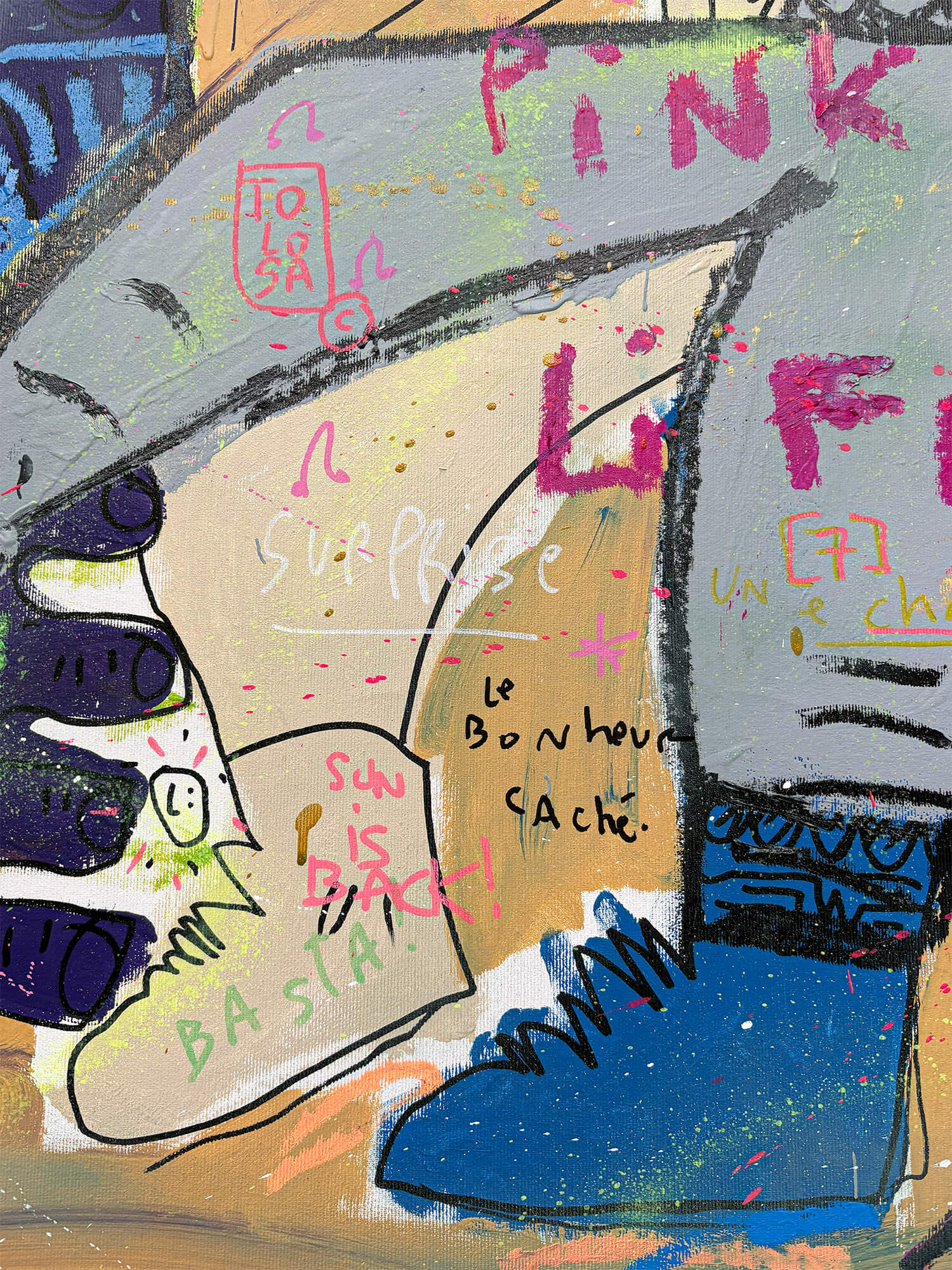 This artwork is an explosive fusion of color and form, reminiscent of street art and neo-expressionism. The canvas is dominated by bold, abstract figures outlined with dynamic, jagged lines. The color palette is vibrant yet chaotic, employing vivid reds, blues, and yellows that clash and meld into each other, creating an intense visual energy. Text elements like “PASSER LE CAP” and “PINK LIFE” punctuate the scene, adding layers of meaning and inviting interpretation. Words such as “HOPE” and “LOW” suggest an underlying narrative or commentary on human emotion and experience. The figures’ exaggerated features and unconventional proportions convey a sense of movement and urgency. This piece stands out for its raw and unpolished aesthetic, invoking a visceral reaction from the viewer. It challenges traditional artistic norms while conveying a sense of immediacy and emotional intensity.