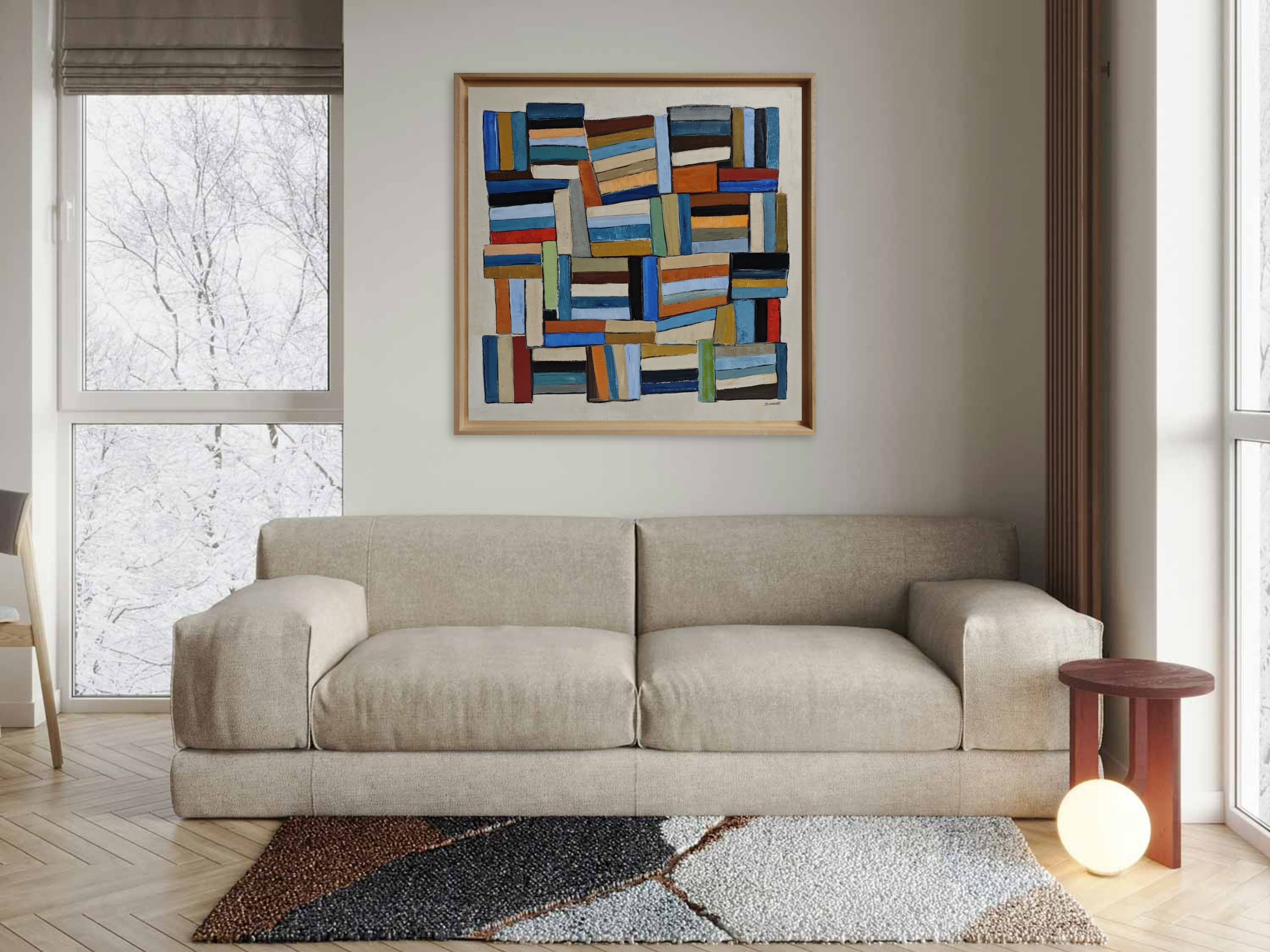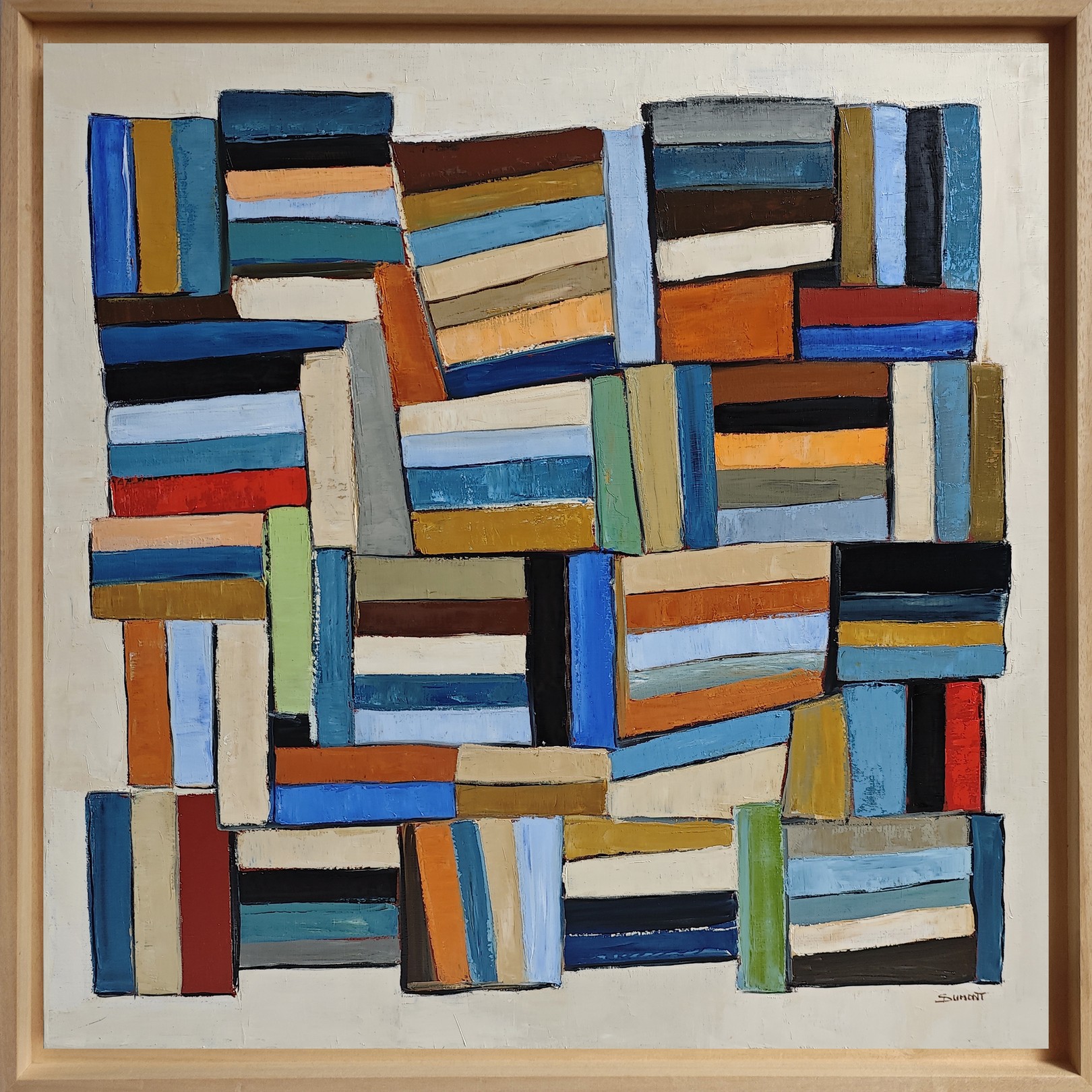 In Intertwined Thoughts, Sophie Dumont explores the inner dimension of thought through a composition inspired by the abstract libraries that have become her signature. Books and chromatic fragments are woven together here like the threads of an inner dialogue.