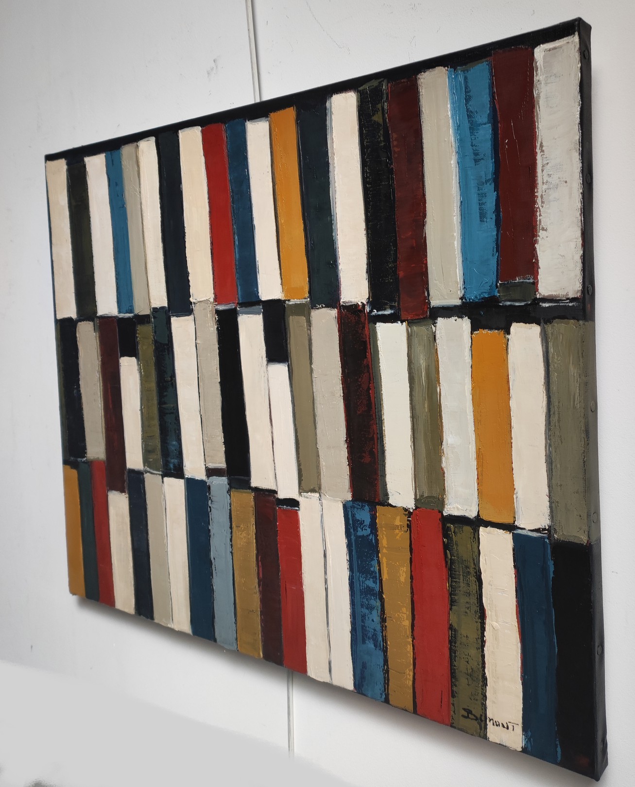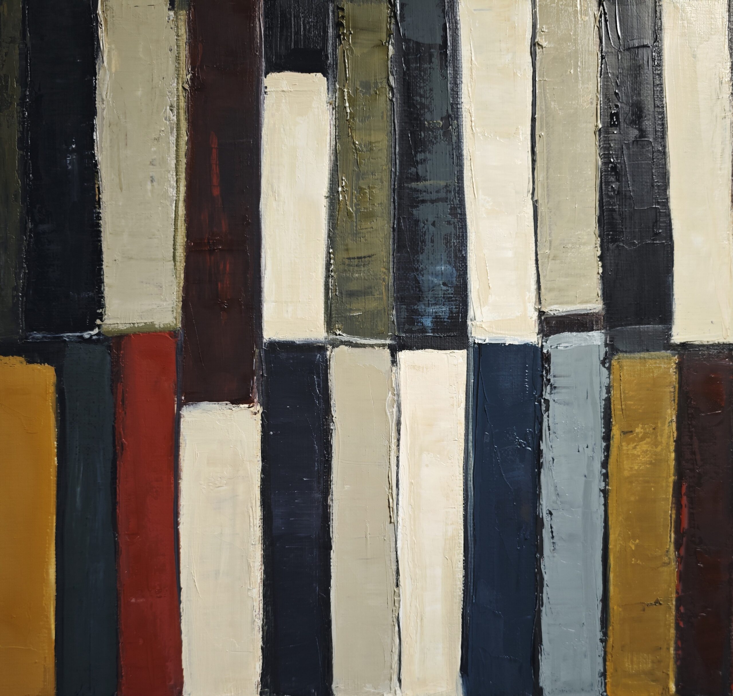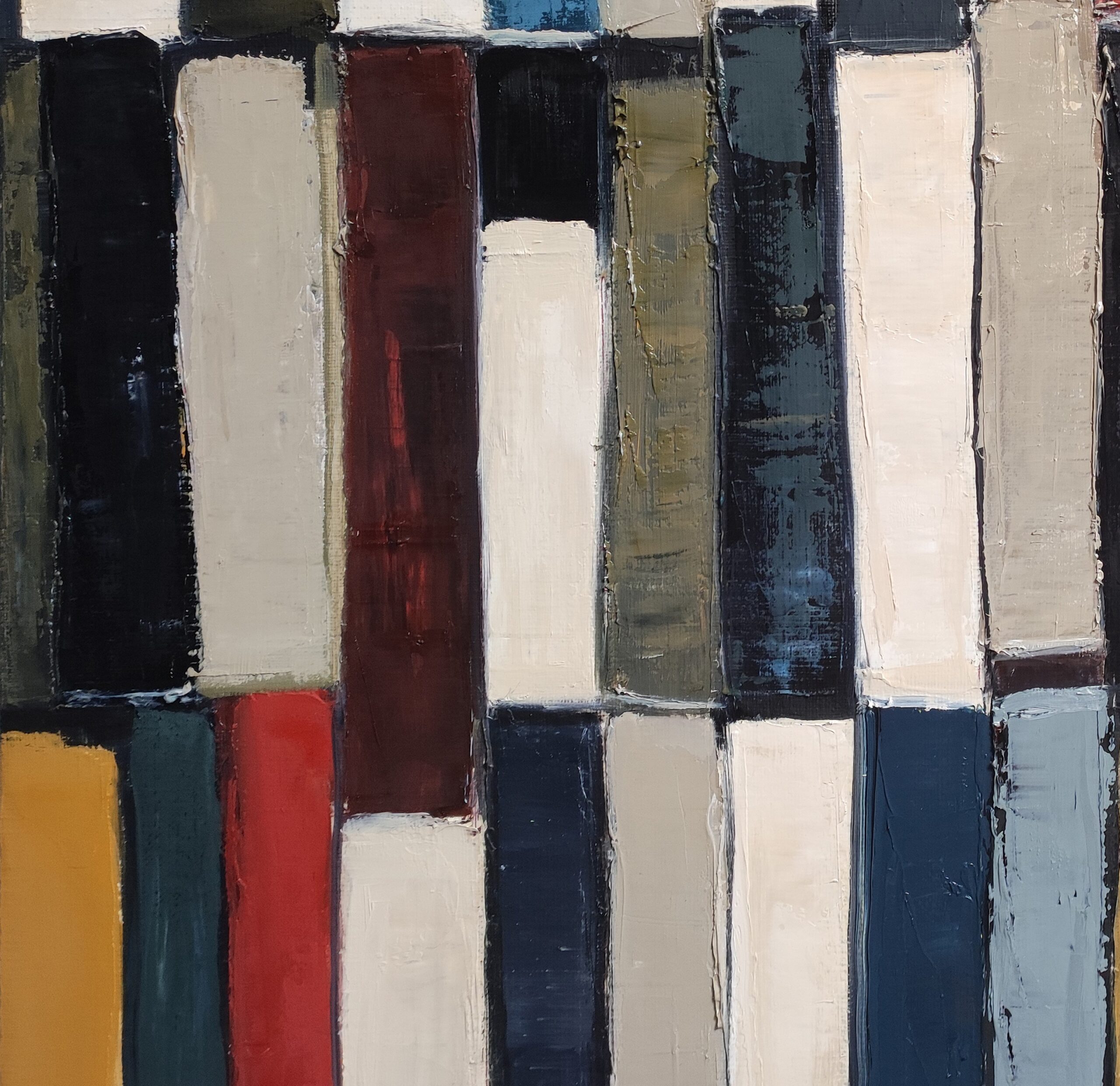 “Polyphony of Books” is a work in which Sophie Dumont explores verticality and visual rhythm through her stylized bookshelves. Each volume becomes a note, each color a vibration: ochre, deep red, blue, and ivory respond to one another as in a silent score. The composition, both structured and vibrant, suggests the rigor of knowledge as much as the freedom of the imagination. The generous application of paint, worked in superimposed layers, lends the whole a tactile and luminous depth. A painting that evokes the book as a living space of memory and transmission.