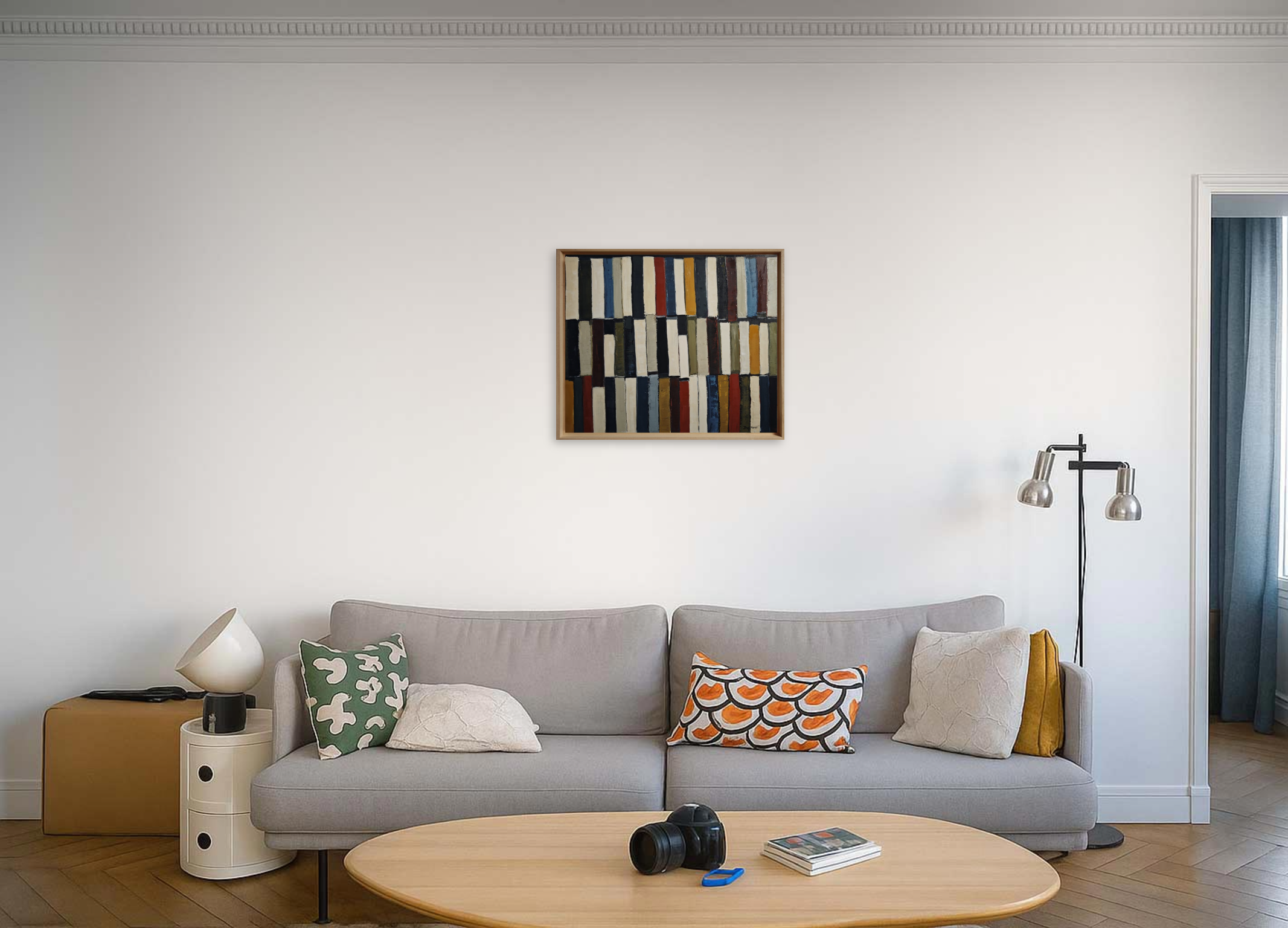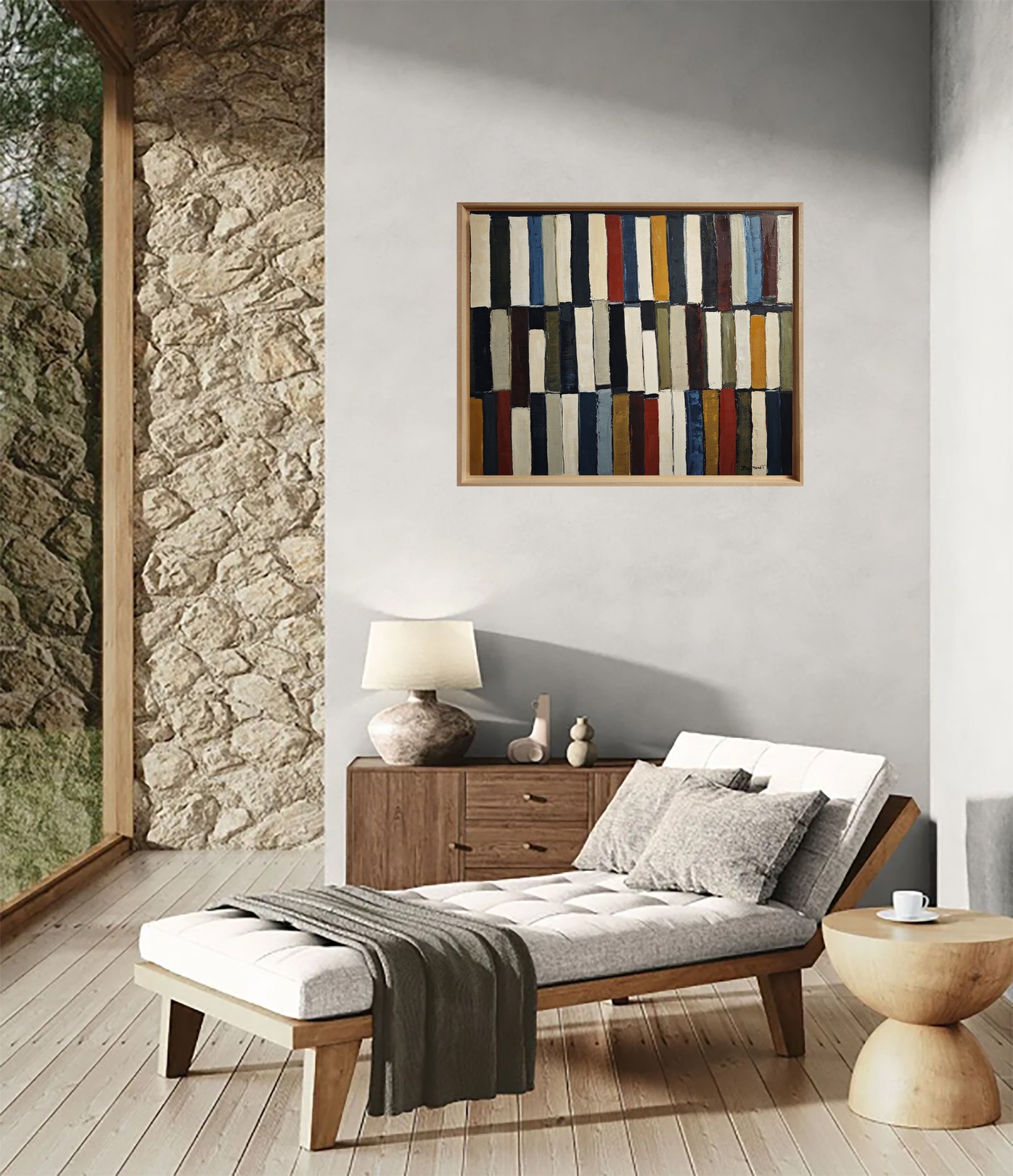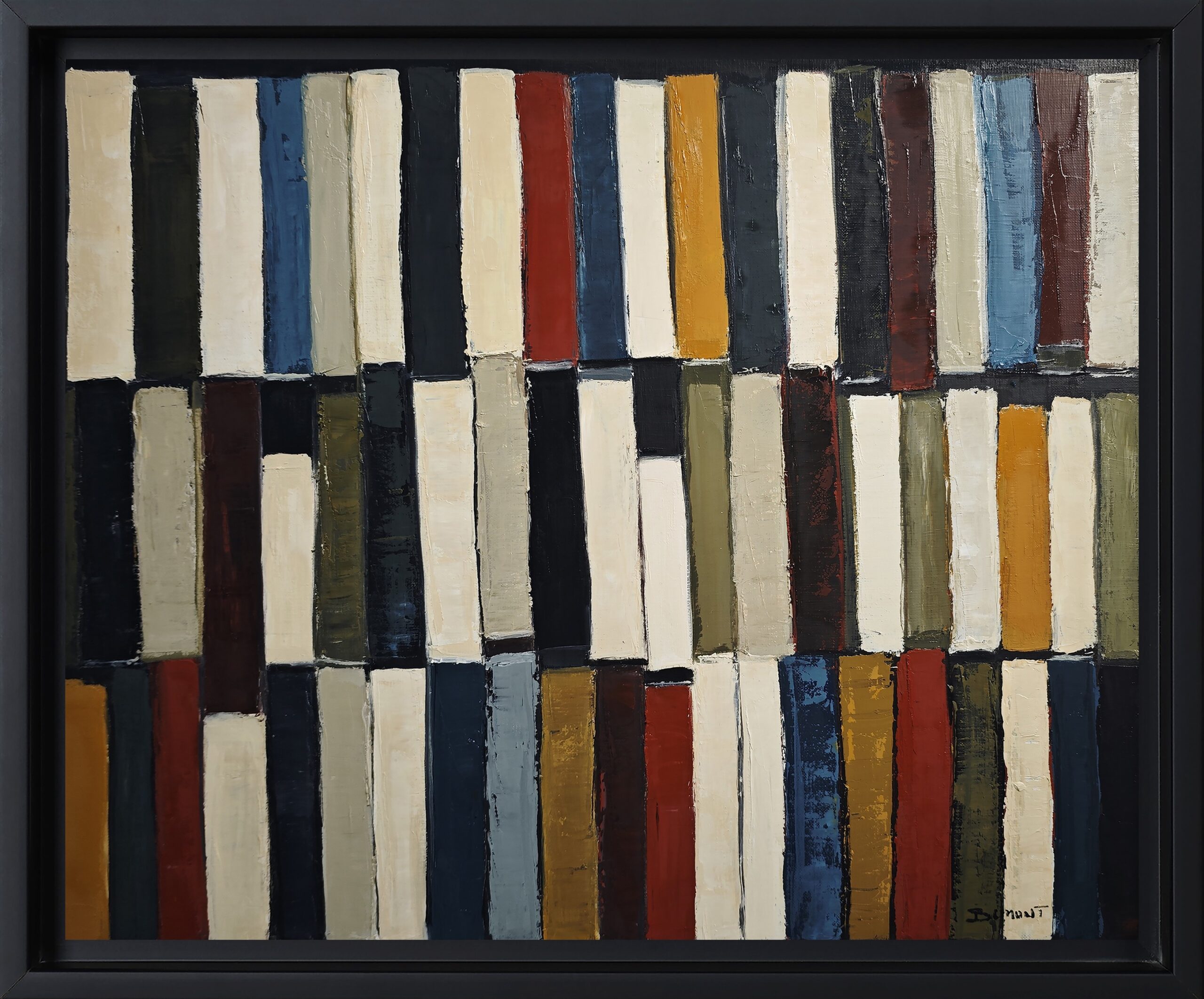 “Polyphony of Books” is a work in which Sophie Dumont explores verticality and visual rhythm through her stylized bookshelves. Each volume becomes a note, each color a vibration: ochre, deep red, blue, and ivory respond to one another as in a silent score. The composition, both structured and vibrant, suggests the rigor of knowledge as much as the freedom of the imagination. The generous application of paint, worked in superimposed layers, lends the whole a tactile and luminous depth. A painting that evokes the book as a living space of memory and transmission.