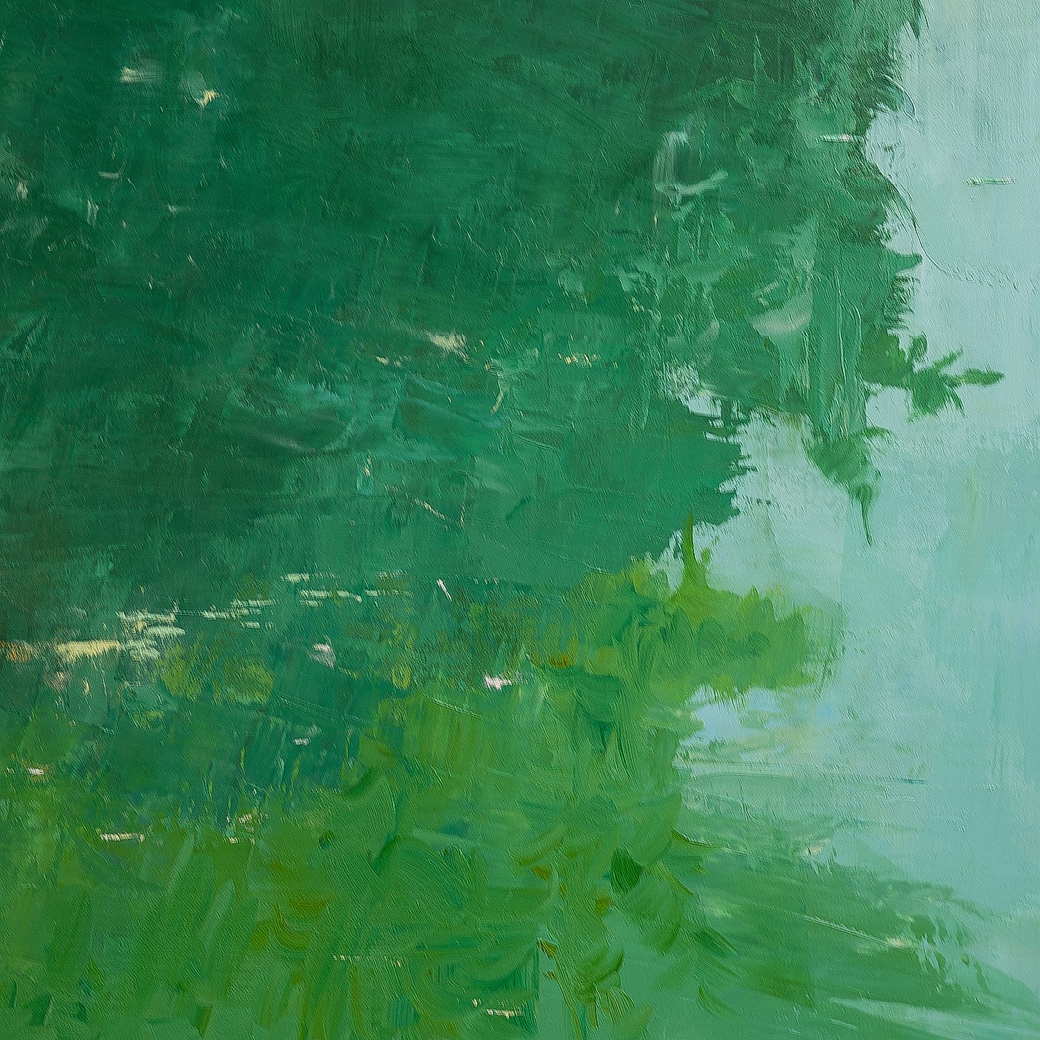 This artwork is a masterful depiction of a lake landscape bathed in light. The scene is dominated by lush hues of green, creating a calming and harmonious impression. The trees, with their dense foliage, stand proudly in the background, their silhouettes subtly turning away from the calm water of the lake. A lesson in light, the sources of light filter through the branches, creating delicate shadows on the surface of the water. The artist uses a palette of graduated greens and blues to accurately capture the tranquility of the place, each nuance adding to the serenity of the landscape. The island of greenery in the foreground is a remarkably executed detail, appearing to float gracefully in the water. The tall grasses balance gently with the breeze, their reflections punctuating the limpidity of the water. This painting is distinguished by its ability to evoke an atmosphere of calm and contemplation, immersing the viewer in an untouched and restful nature. The artist demonstrates a technical mastery and aesthetic sensitivity that transforms this simple scene into a captivating visual experience.