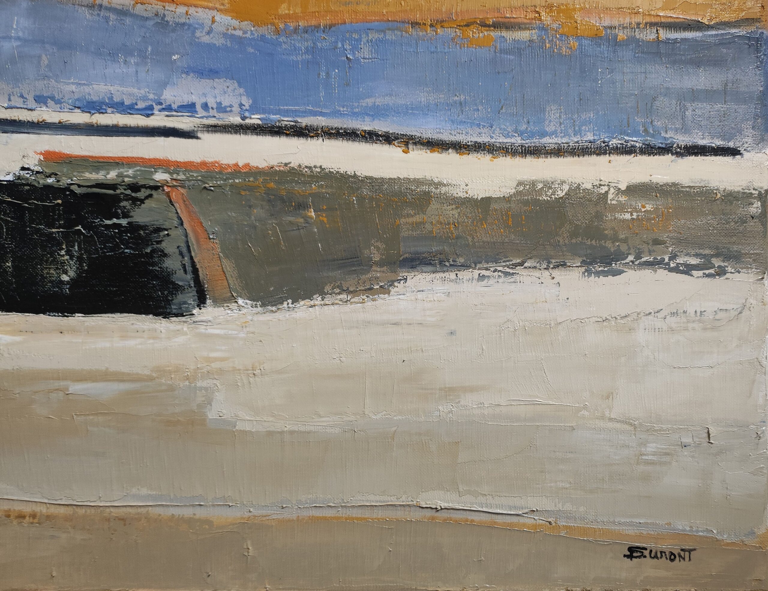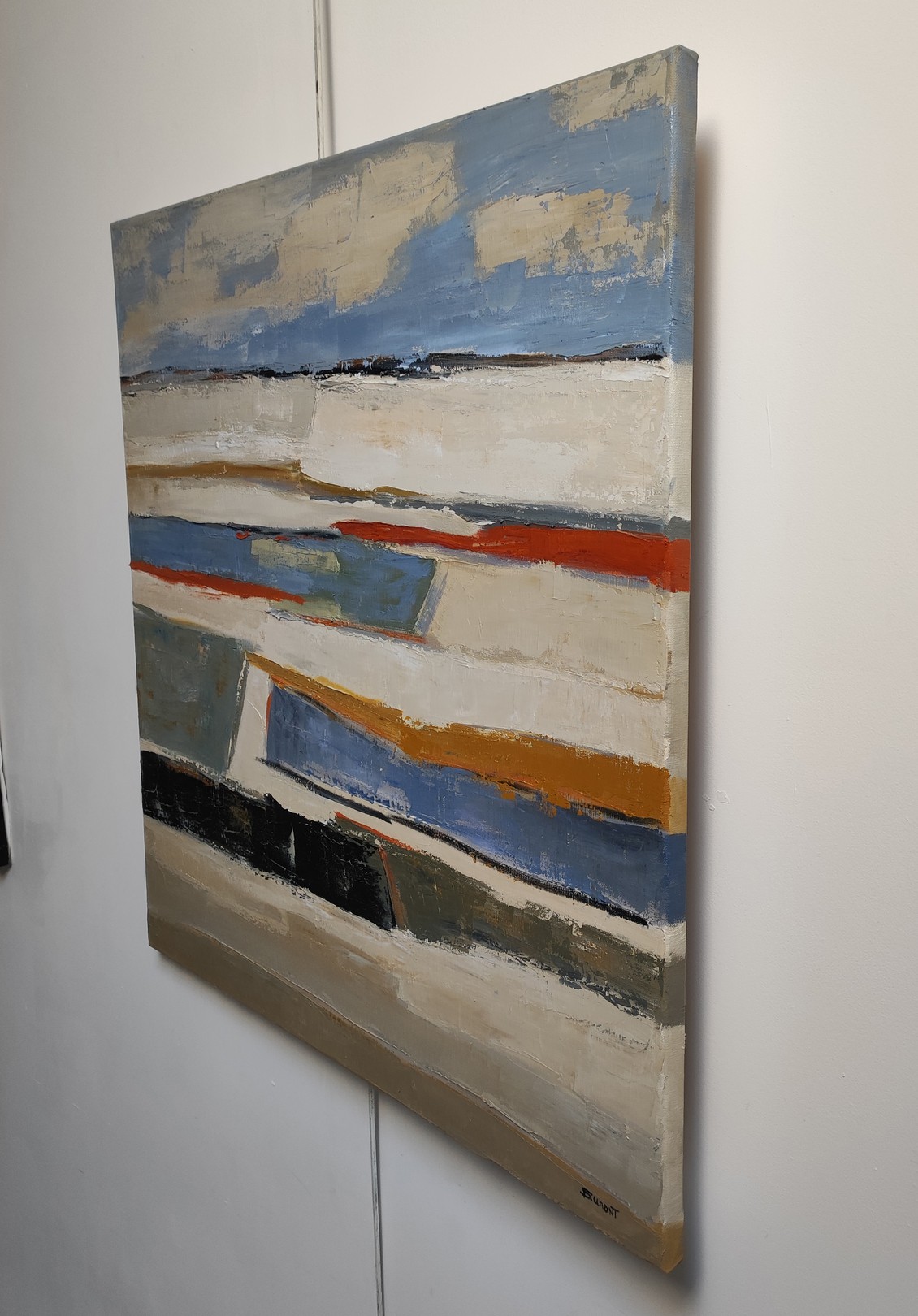 Reflets d’Ailleurs is a profound work where the artist Sophie Dumont expresses an abstract language to evoke an imaginary landscape. This painting is a bold exploration of shapes and colors, where horizontal planes intertwine with a fluidity that creates a remarkable visual dynamic. The blocks of colors – dominated by shades of blue, ochre, and black – coexist in a subtle harmony, while maintaining a certain autonomy, like fragments of distant territories gathered on the same canvas.