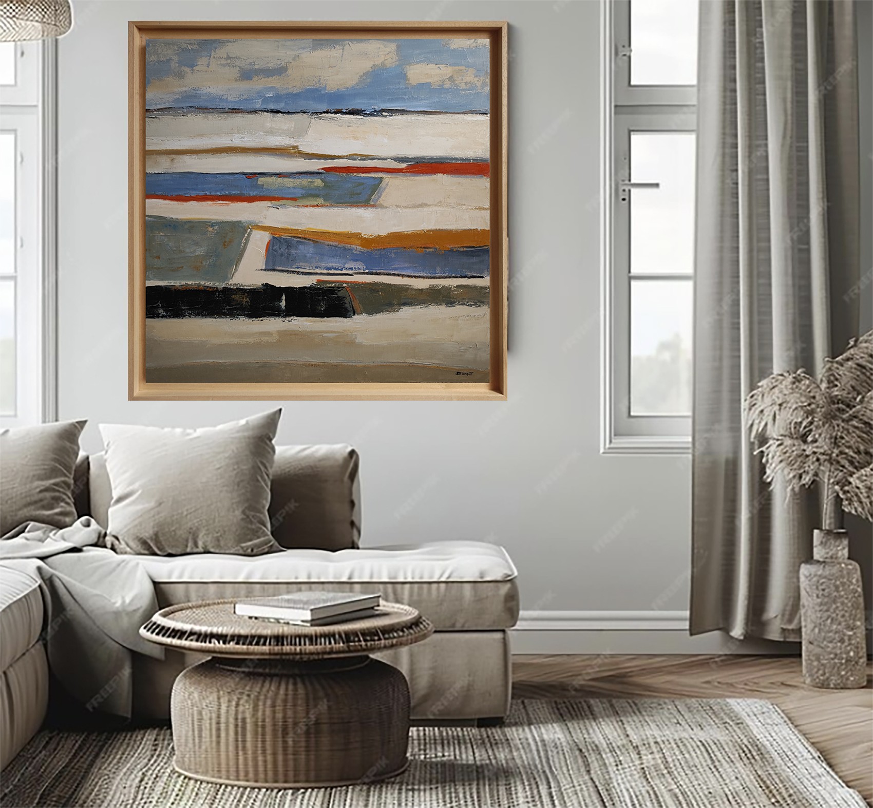 Reflets d’Ailleurs transports the viewer into a world where boundaries are intentionally blurred, where sky and earth merge, inviting a multitude of interpretations. This work is distinguished by its balance between structural rigor and spontaneous freedom, capturing the essence of a reinvented landscape, which oscillates between the known and the unknown. A piece that calls for introspection and the discovery of unexplored horizons.