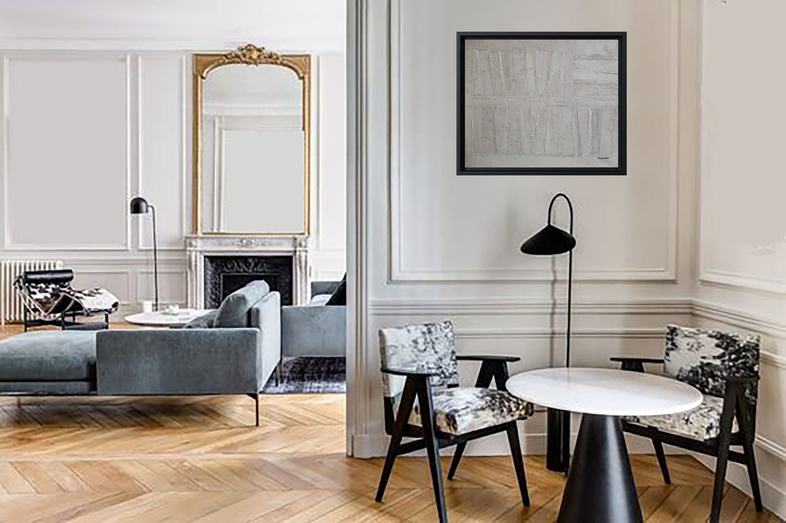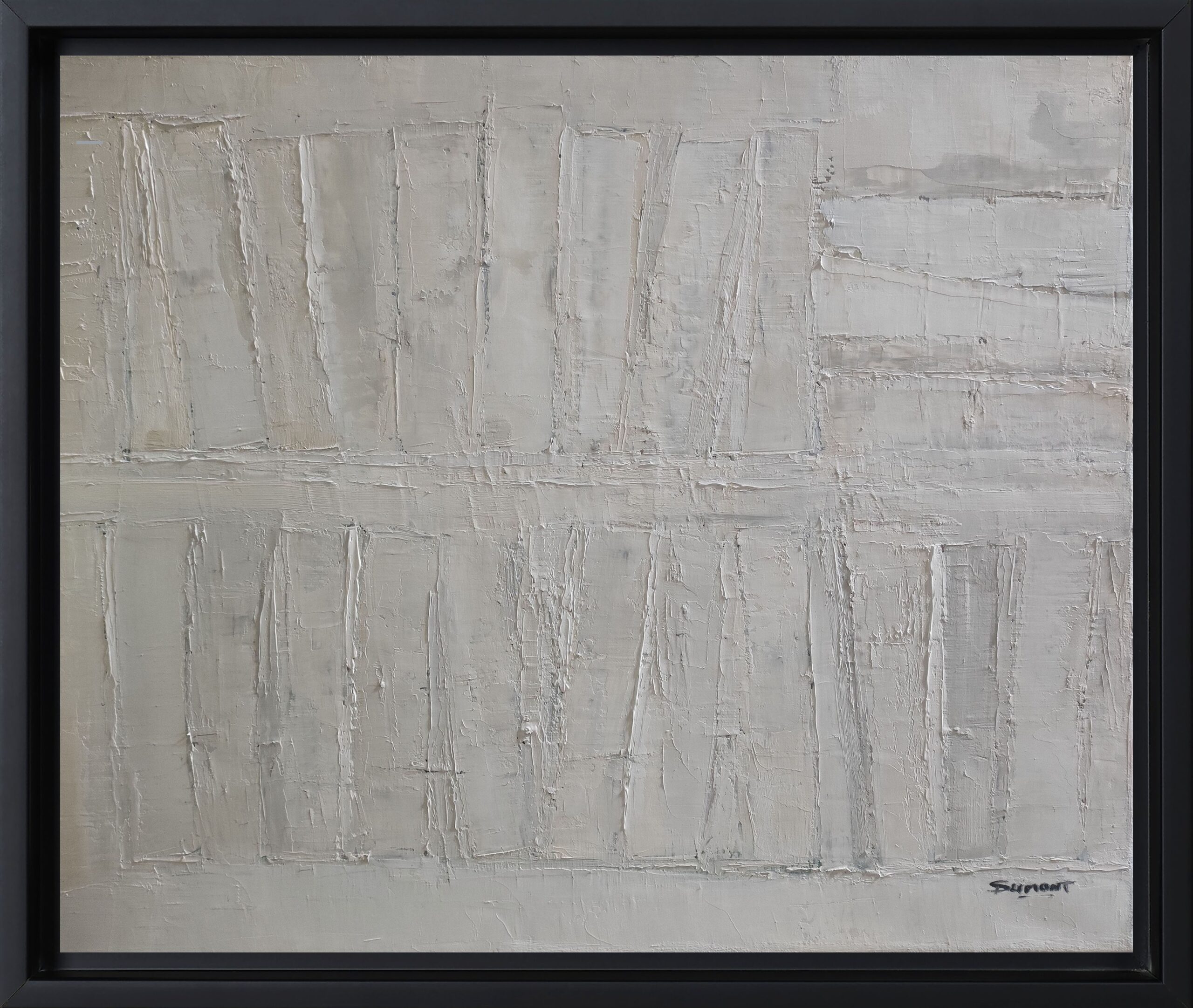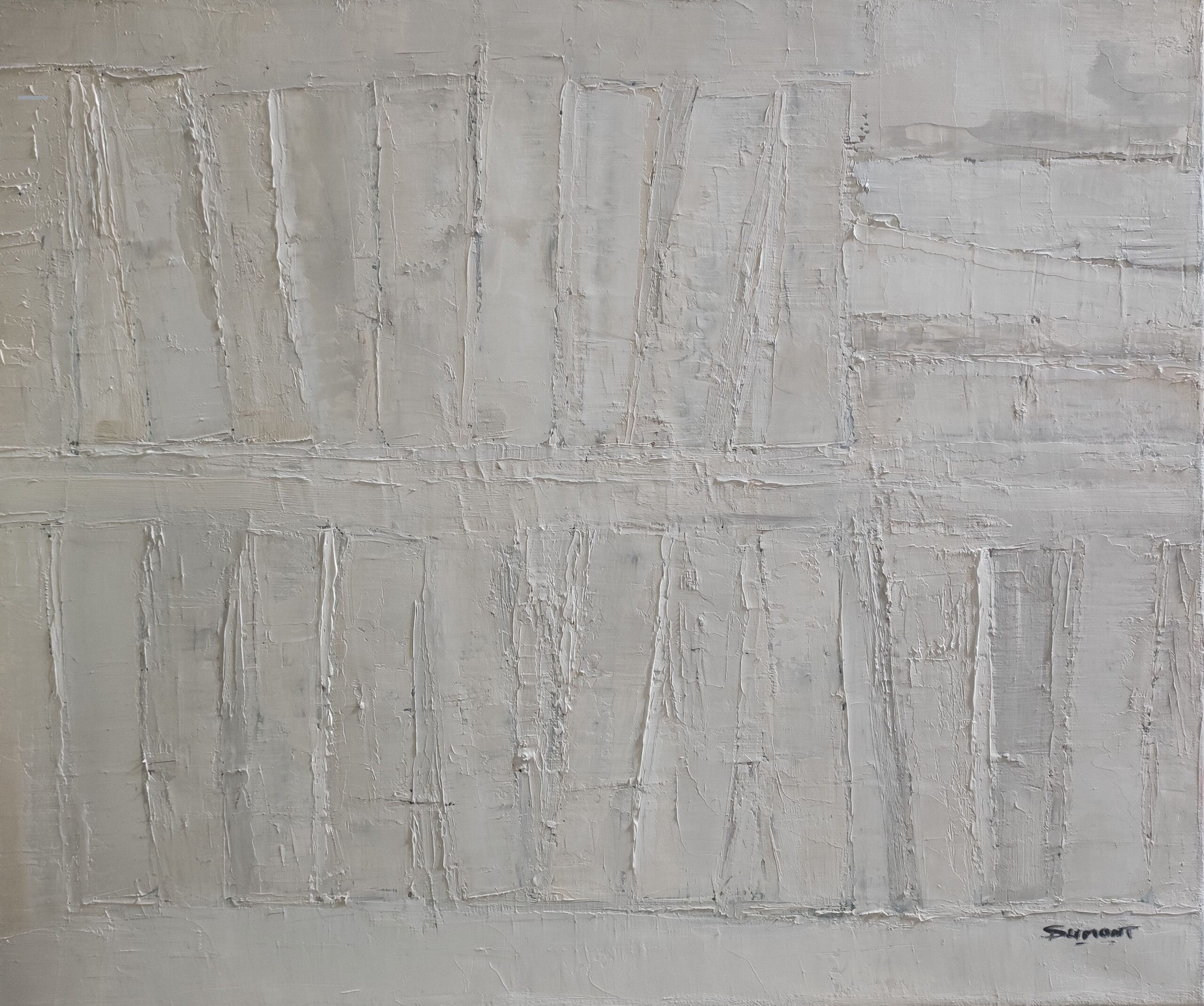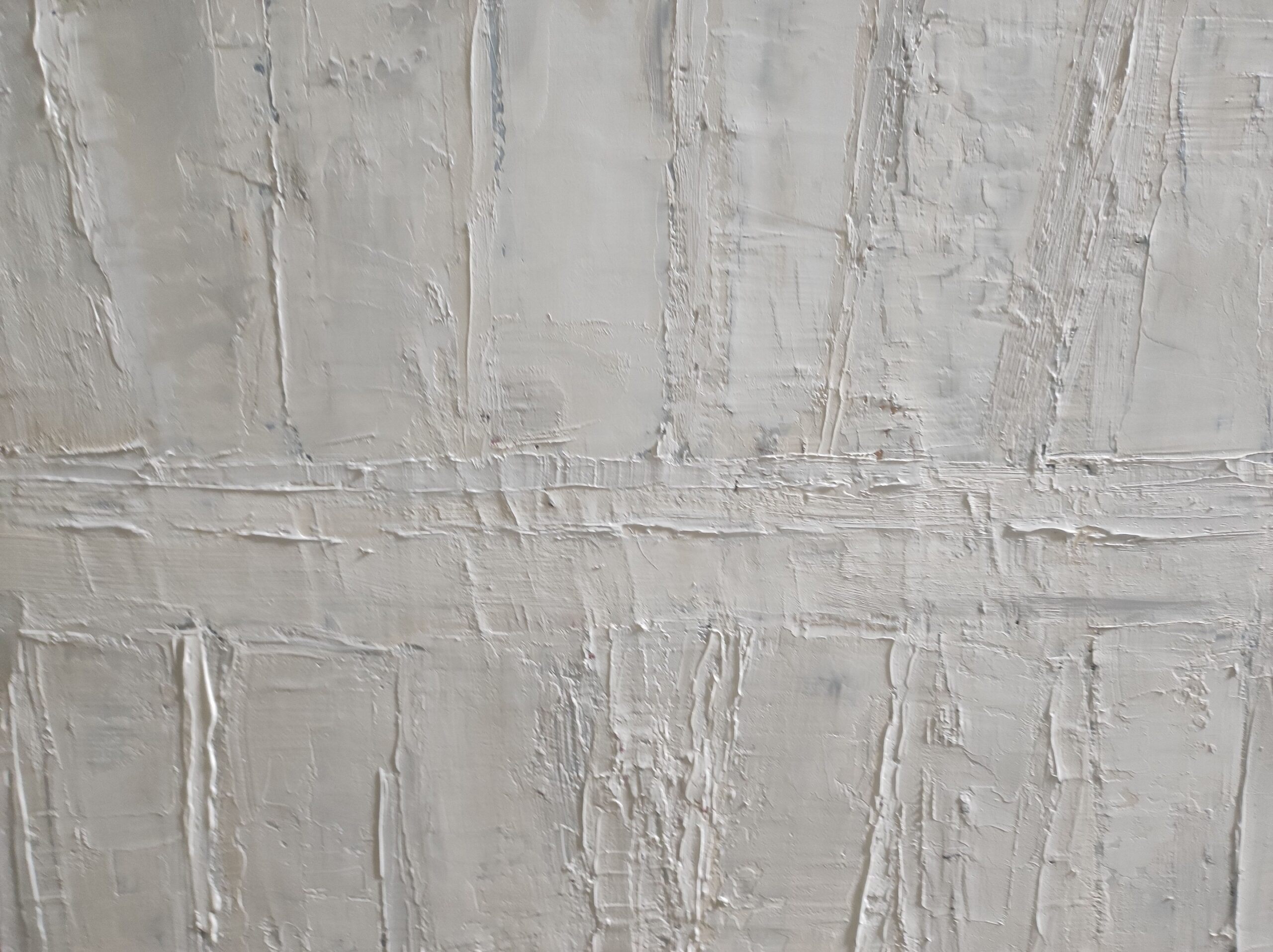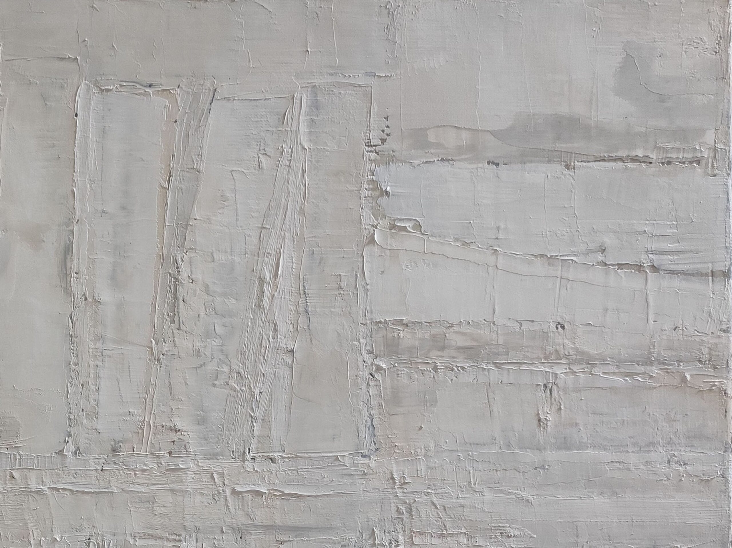 The use of the palette knife gives the canvas a vibrant texture, where each layer of paint seems to both reveal and conceal. The color range, dominated by off-whites and soft grays, accentuates this impression of faded memory, as if the works had faded over time, leaving only their essence.