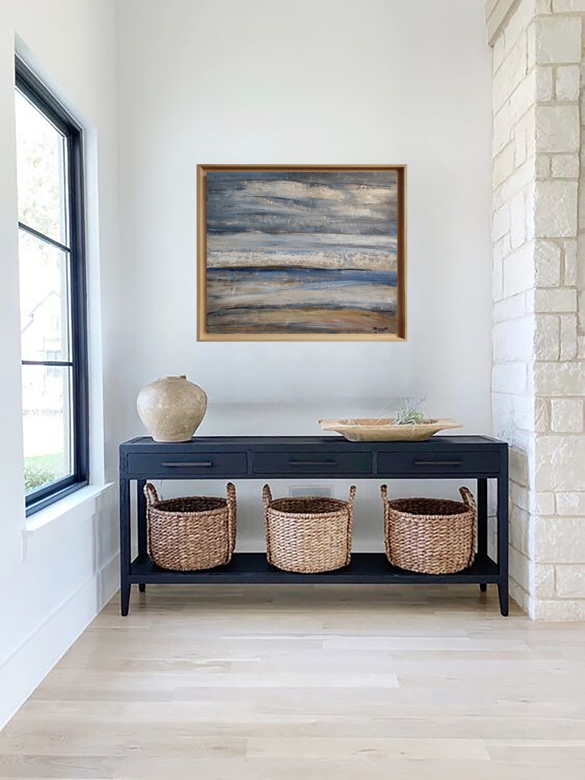 This painting does not just represent a place, but it captures an atmosphere. The absence of precise figurative details allows the viewer’s imagination to wander, to resonate with the immensity of the landscape. “Seascape” is an invitation to contemplation, a visual pause that evokes the calm after a storm or the silence before a rising tide.
