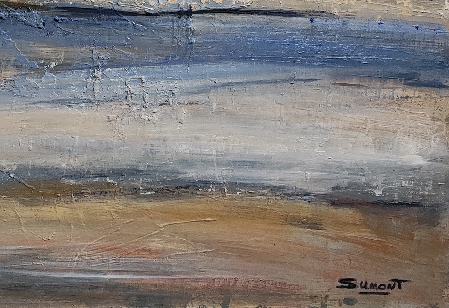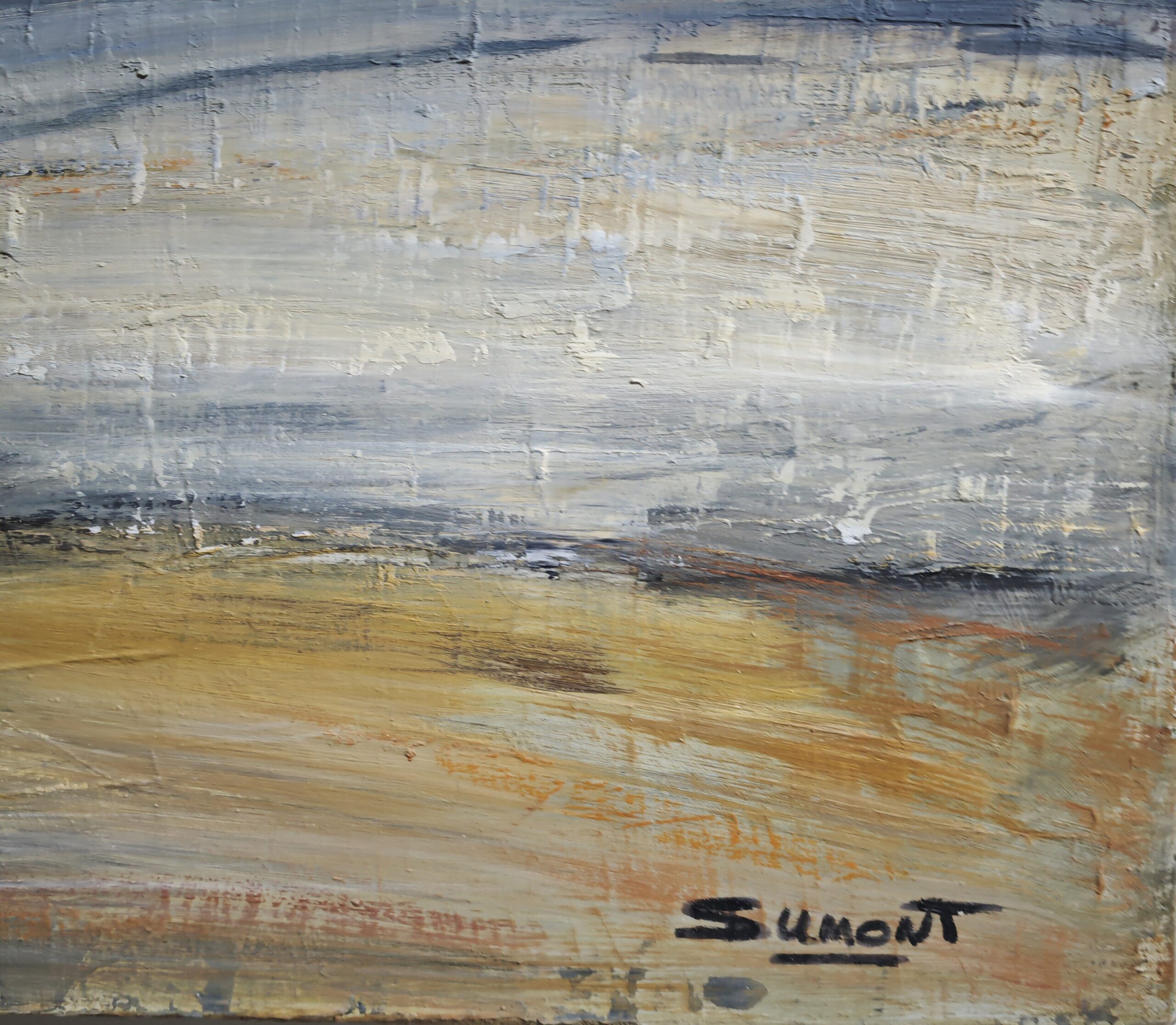 In “Seascape”, Sophie Dumont captures the essence of Normandy’s beaches with a remarkable mastery of textures and nuances. This 54 x 65 cm oil on canvas immerses us in a timeless seascape, where the sky and the sea merge in an almost abstract harmony.
