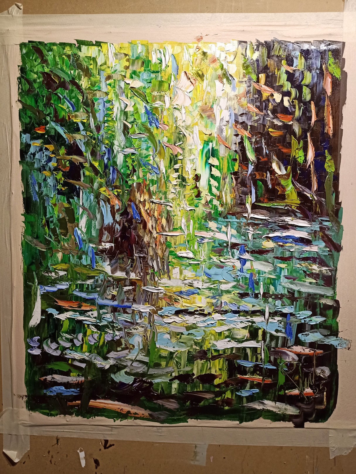 A luminous hush settles over a lily-covered pond. Puliafico sculpts light with the palette knife, layering malachite, viridian and cobalt into vertical veils that read as trees and their mirrored reflections. Knife-laid pads flicker like silver scales; a shaft of honeyed light opens the surface and draws the eye inward, from foliage to water to pure abstraction. The tactile impasto catches ambient light, making the image gently shimmer—ideal for biophilic, design-forward interiors, boutique hotels or corporate collections. Echoes of Monet’s Giverny meet contemporary gestural painting, yet the voice is unmistakably Puliafico: Mediterranean in chroma, modern in rhythm, deeply immersive