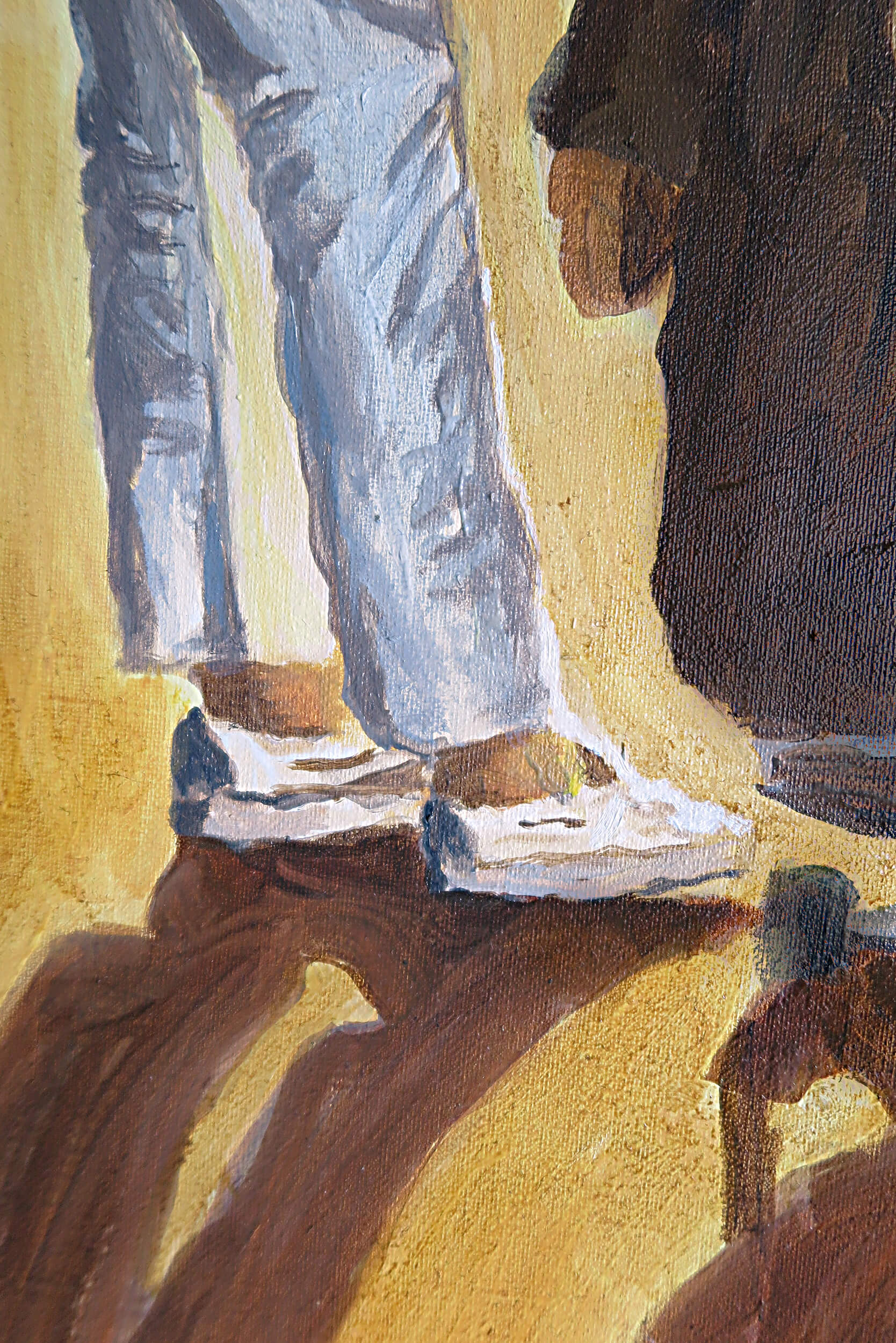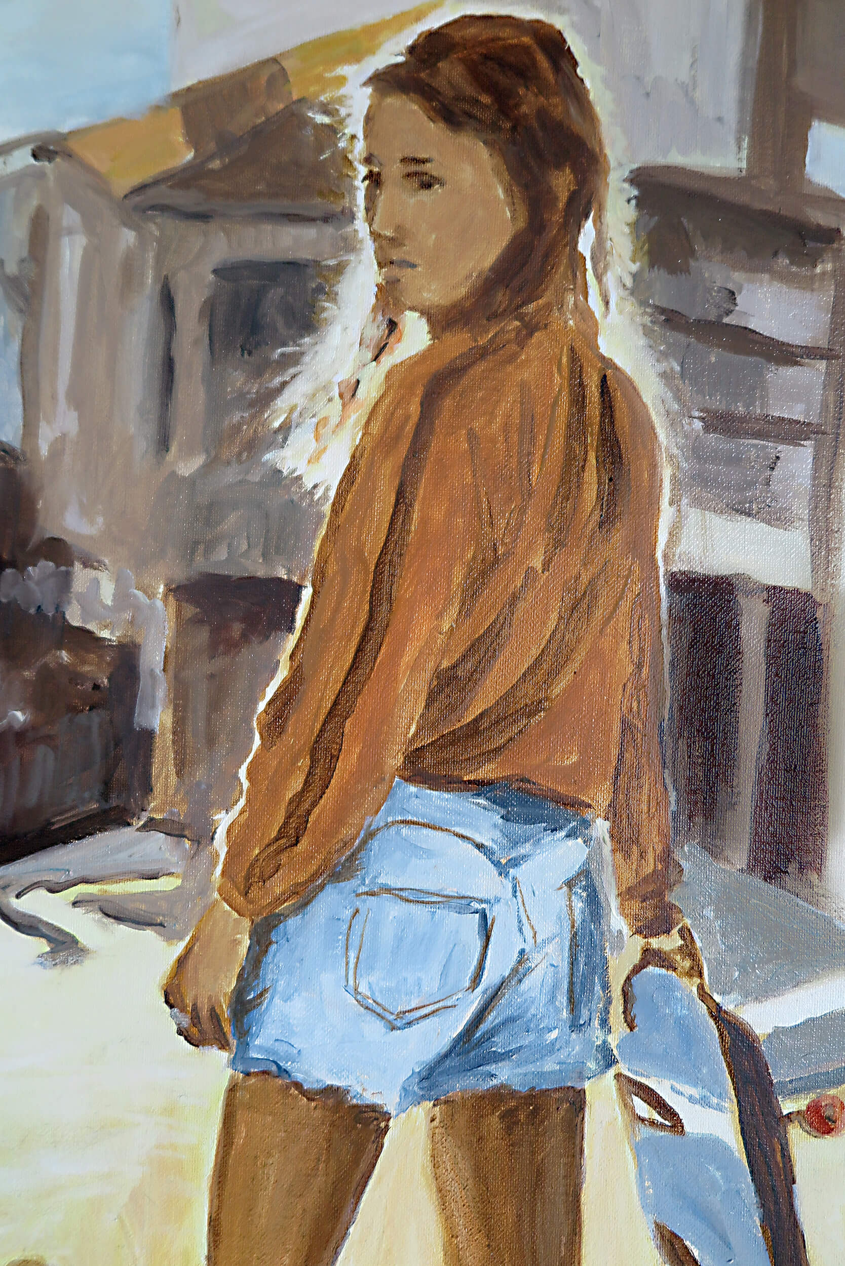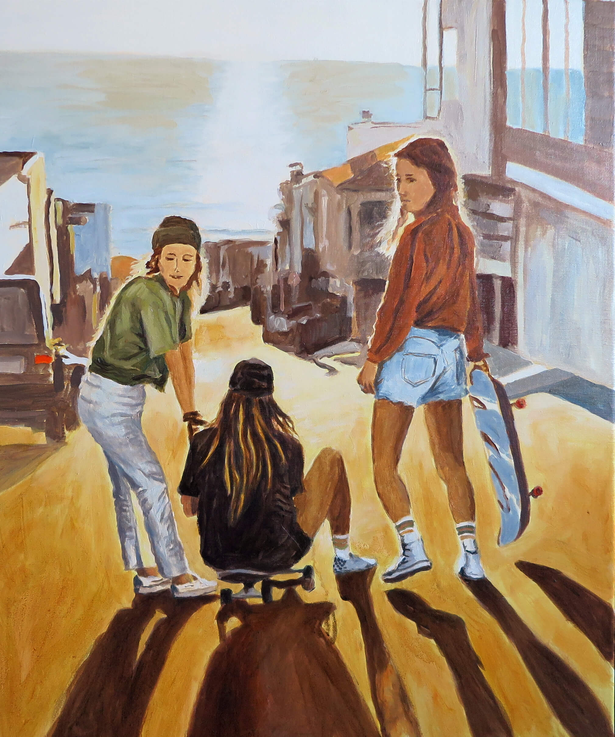 This artwork captures a nostalgic coastal scene with three young women basking in the golden glow of the setting sun. They stand confidently on a sunlit street, their elongated shadows stretching behind them, conveying a sense of carefree youth and camaraderie. The colors are warm and inviting, with a blend of ochre and orange hues that enhance the atmosphere of late afternoon tranquility. One woman holds a skateboard, symbolizing adventure and freedom, while casual attire and relaxed postures underline a laid-back vibe. The perspective allows viewers to gaze towards the shimmering sea in the background, gracefully framed by distant buildings. The composition skillfully balances light and shadow, creating depth and perspective, drawing viewers into this serene, yet lively moment frozen in time. This piece speaks volumes about friendship, exploration, and the beauty of simple pleasures.