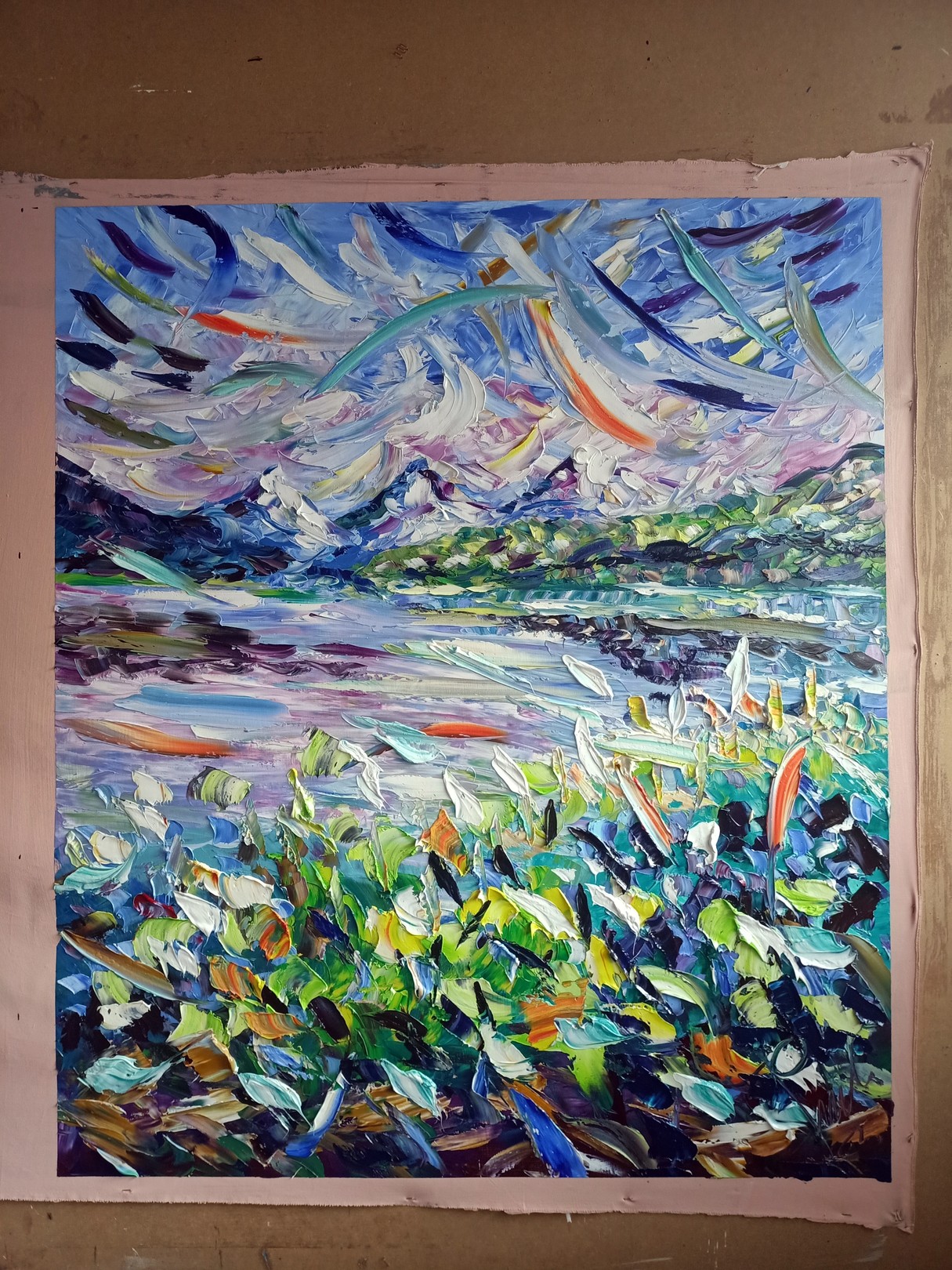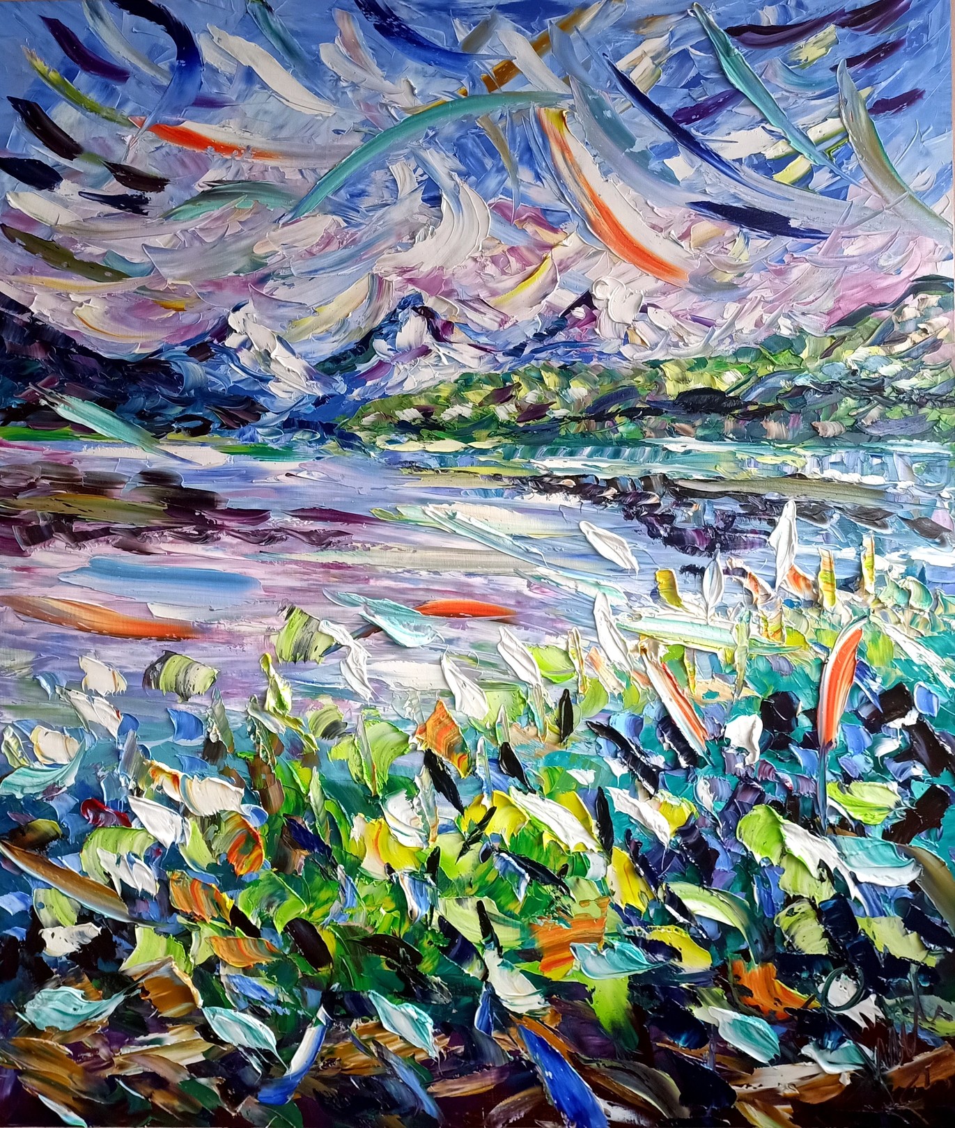A breeze of colour sweeps across lake and sky: lilac shadows, emerald reeds and shards of aquamarine fuse in Puliafico’s vigorous knife work. The surface is sculpted, not painted—creamy ridges catch light like petals in motion—so the scene oscillates between landscape and abstract music. A luminous band of water anchors the composition while airborne arcs suggest clouds, fragrance, memory. This is Mediterranean lyricism distilled into a contemporary language, ideal for design-forward interiors needing a vibrant focal point.