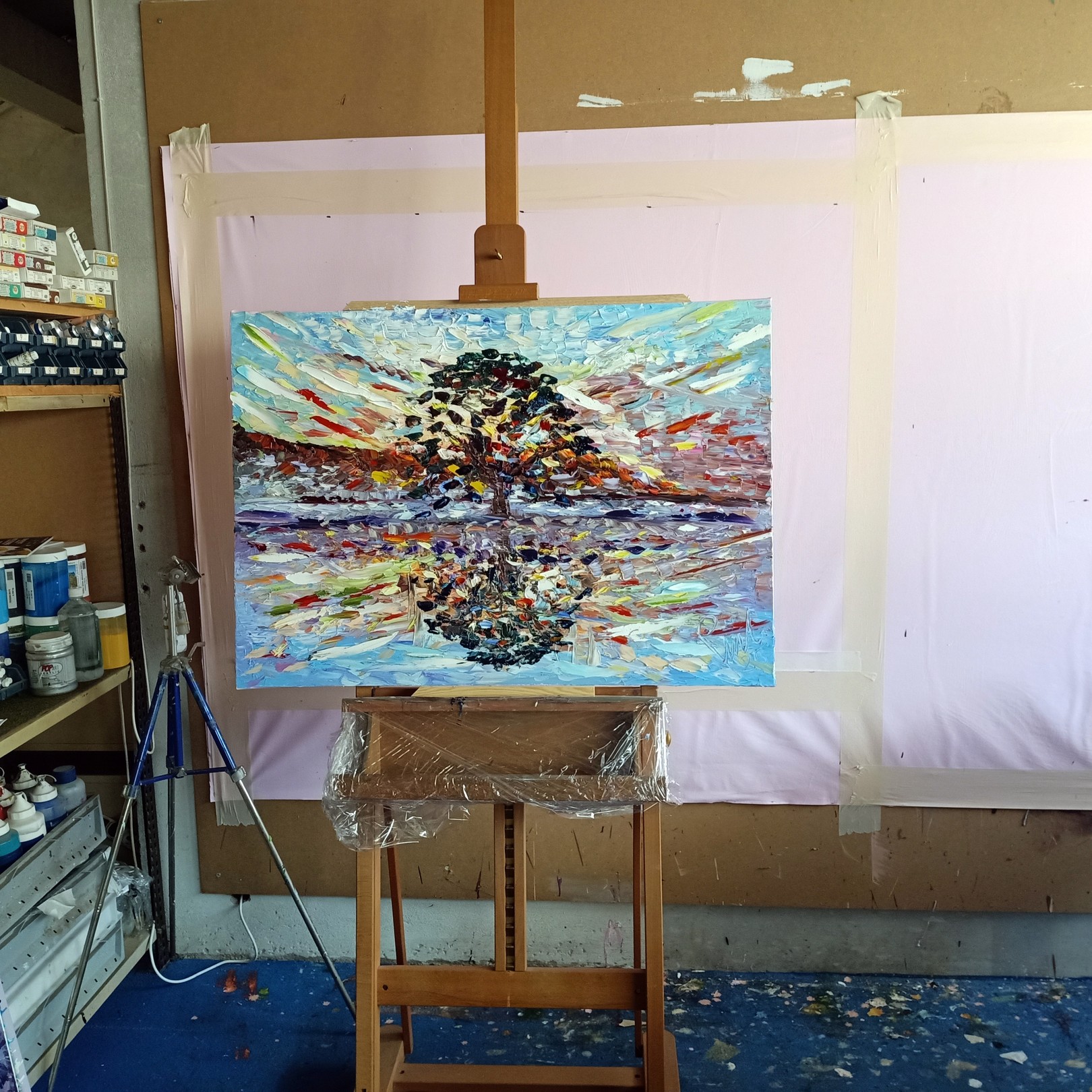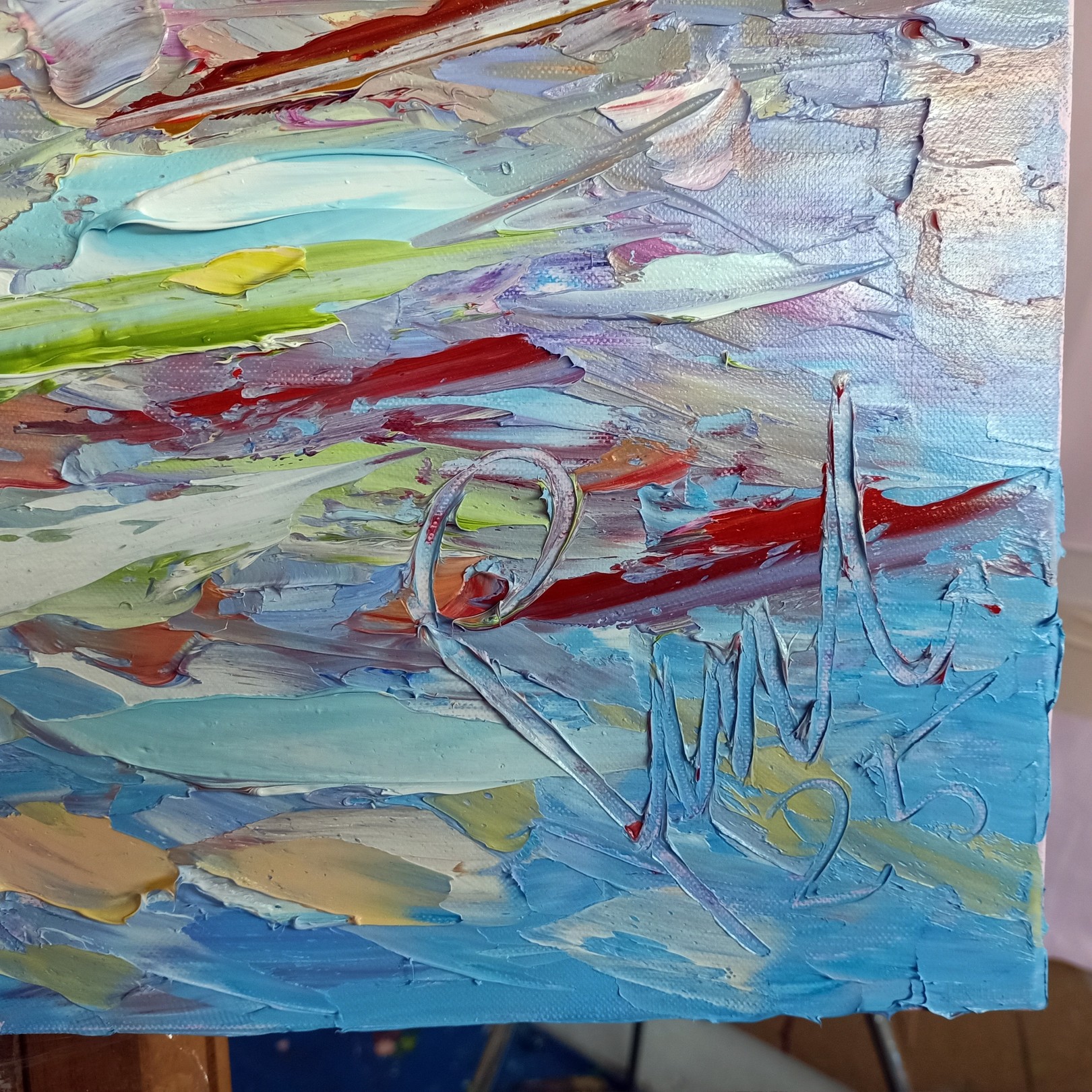 Professional DI VOLO oil colors applied with palette knife on Gesso-primed cotton canvas for maximum adhesion and long-term impasto durability.