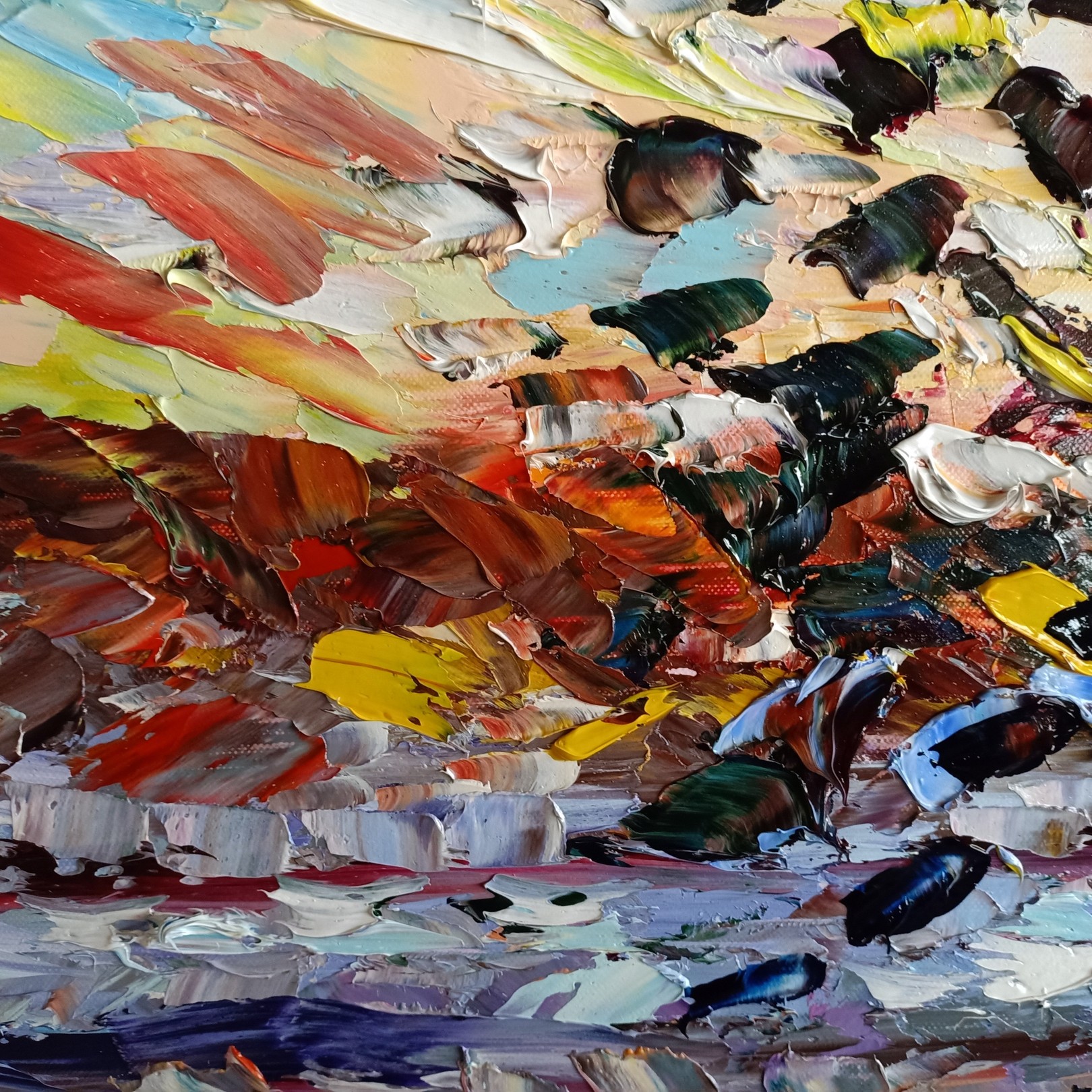 The reflection below is not a simple duplicate: it transforms into an abstract echo, fragmented and vibrant, as if the water were translating light into pure chromatic energy. Thick impasto layers give the surface a sculptural feel, allowing viewers to experience the artwork from multiple angles as light shifts across the paint.