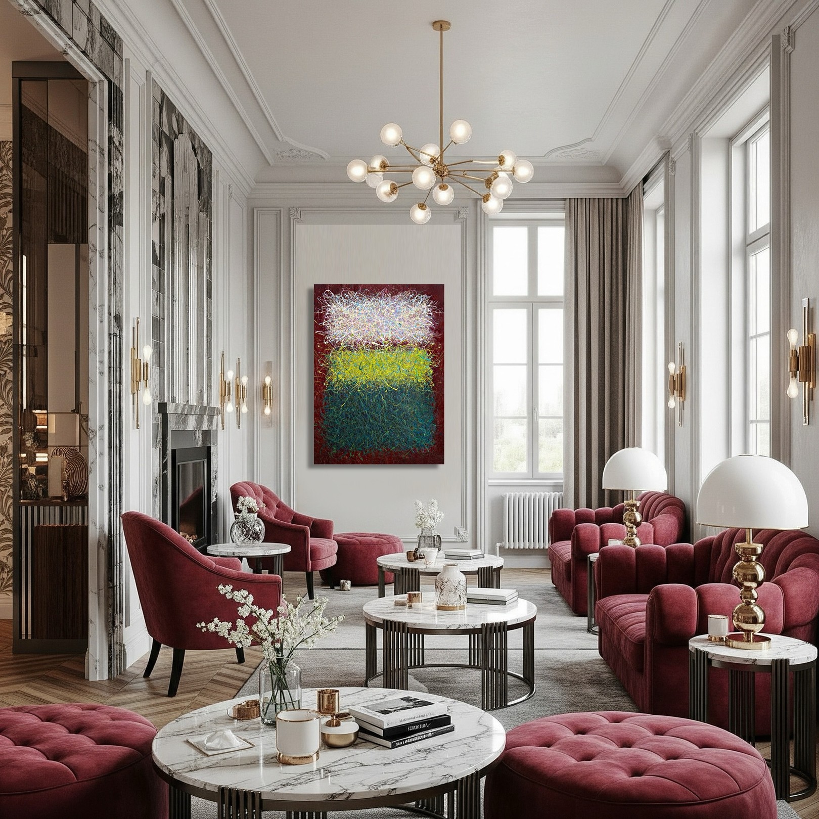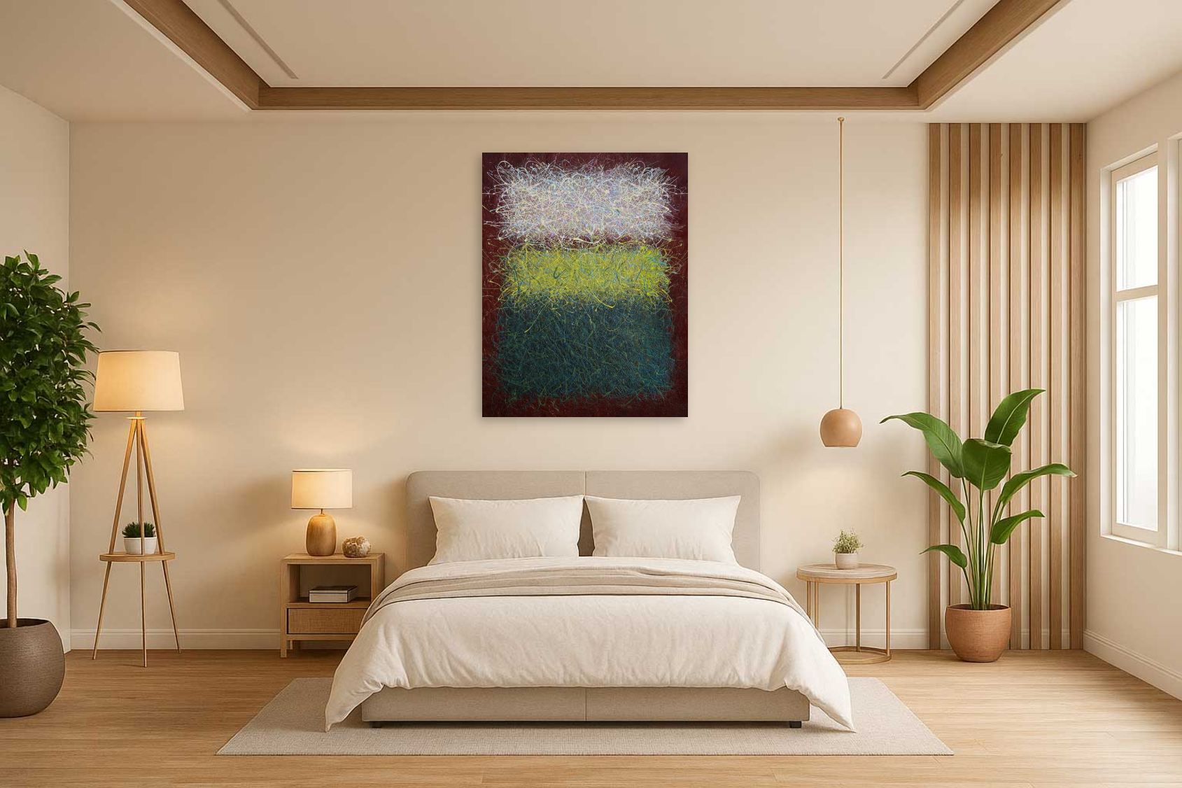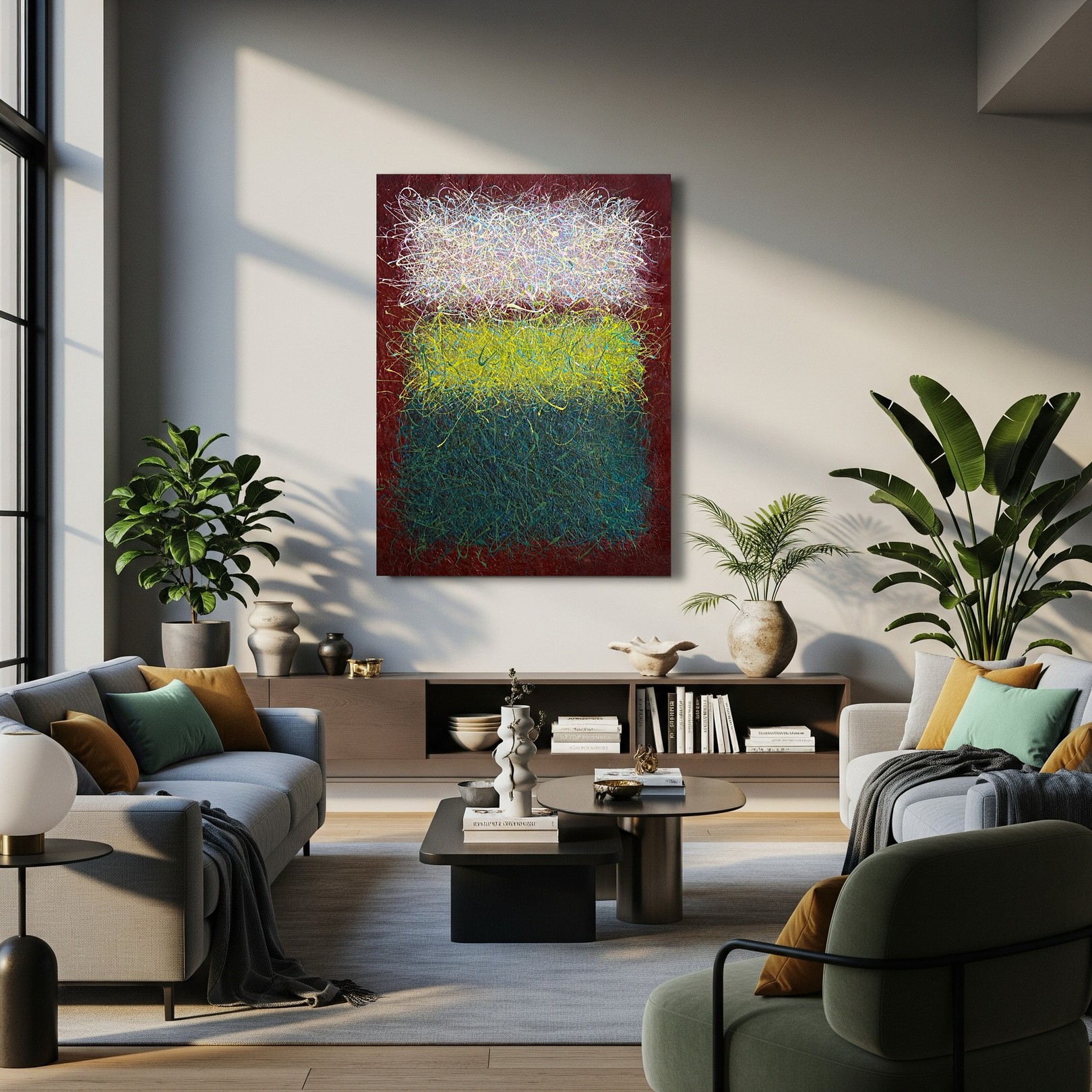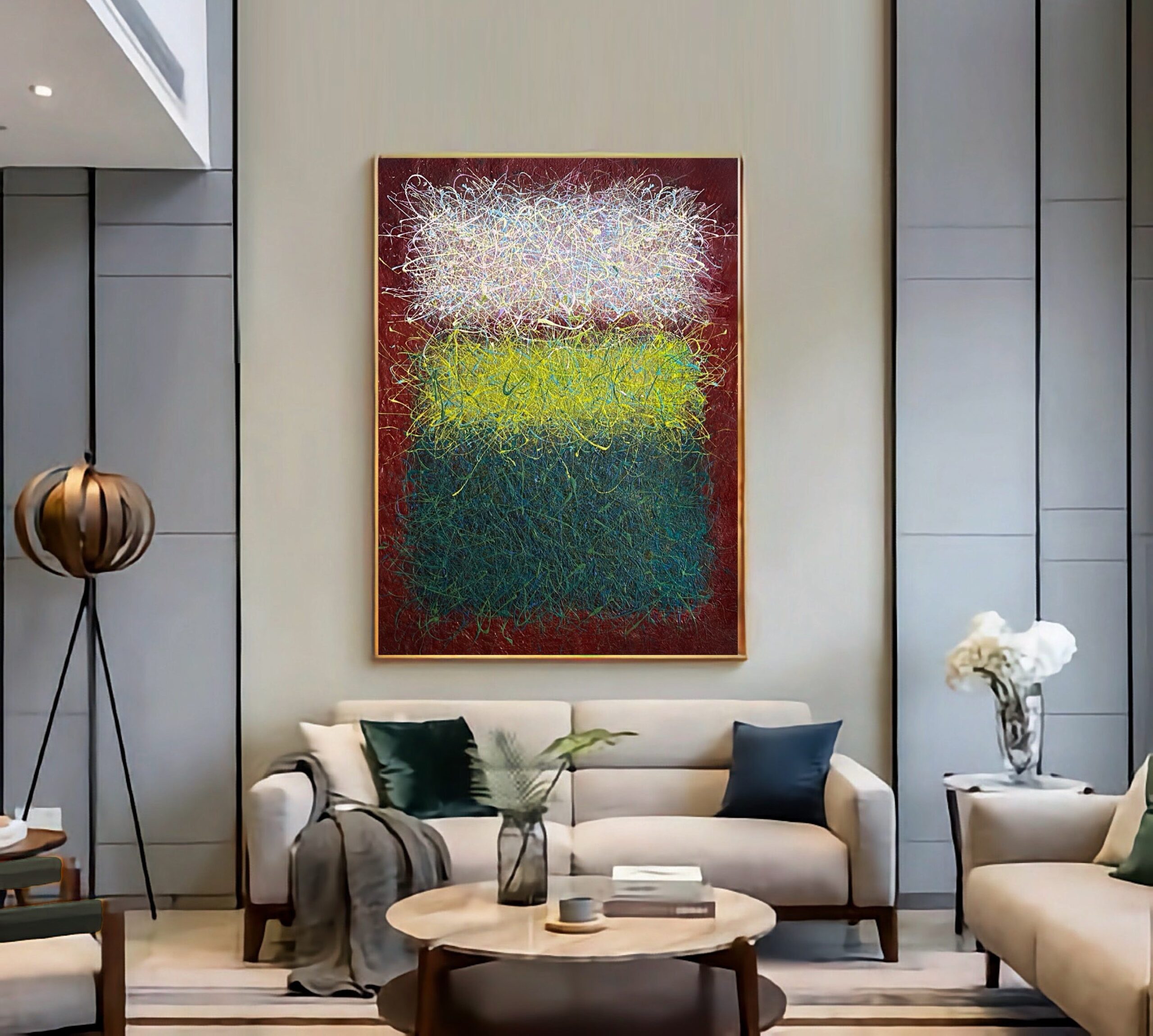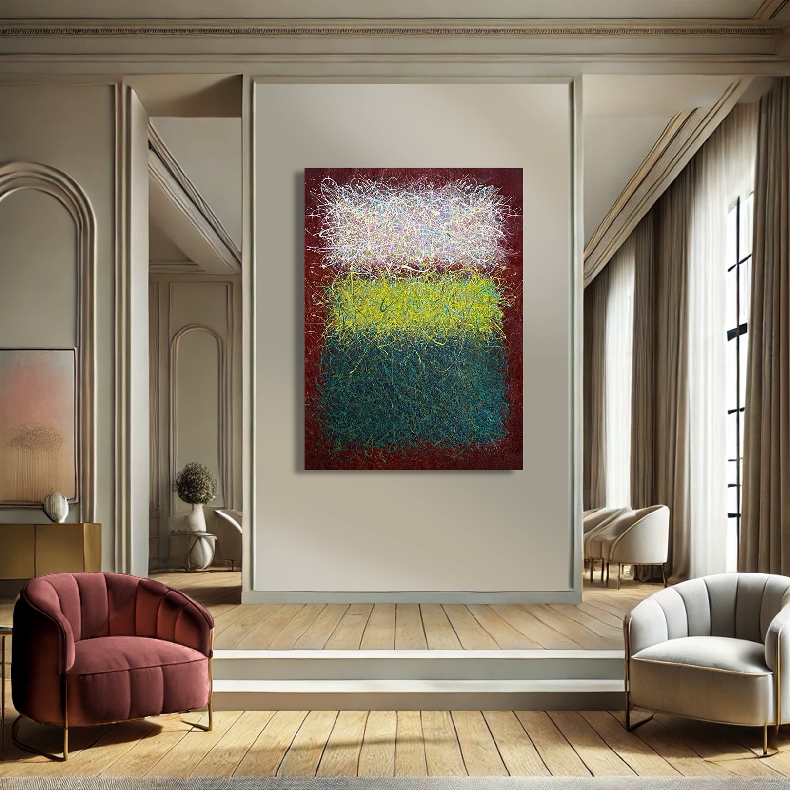 Experience emotional depth through color with Splashes. Green and Chocolate, a large original abstract painting inspired by the meditative compositions of Rothko and the expressive splatter techniques of Pollock.
