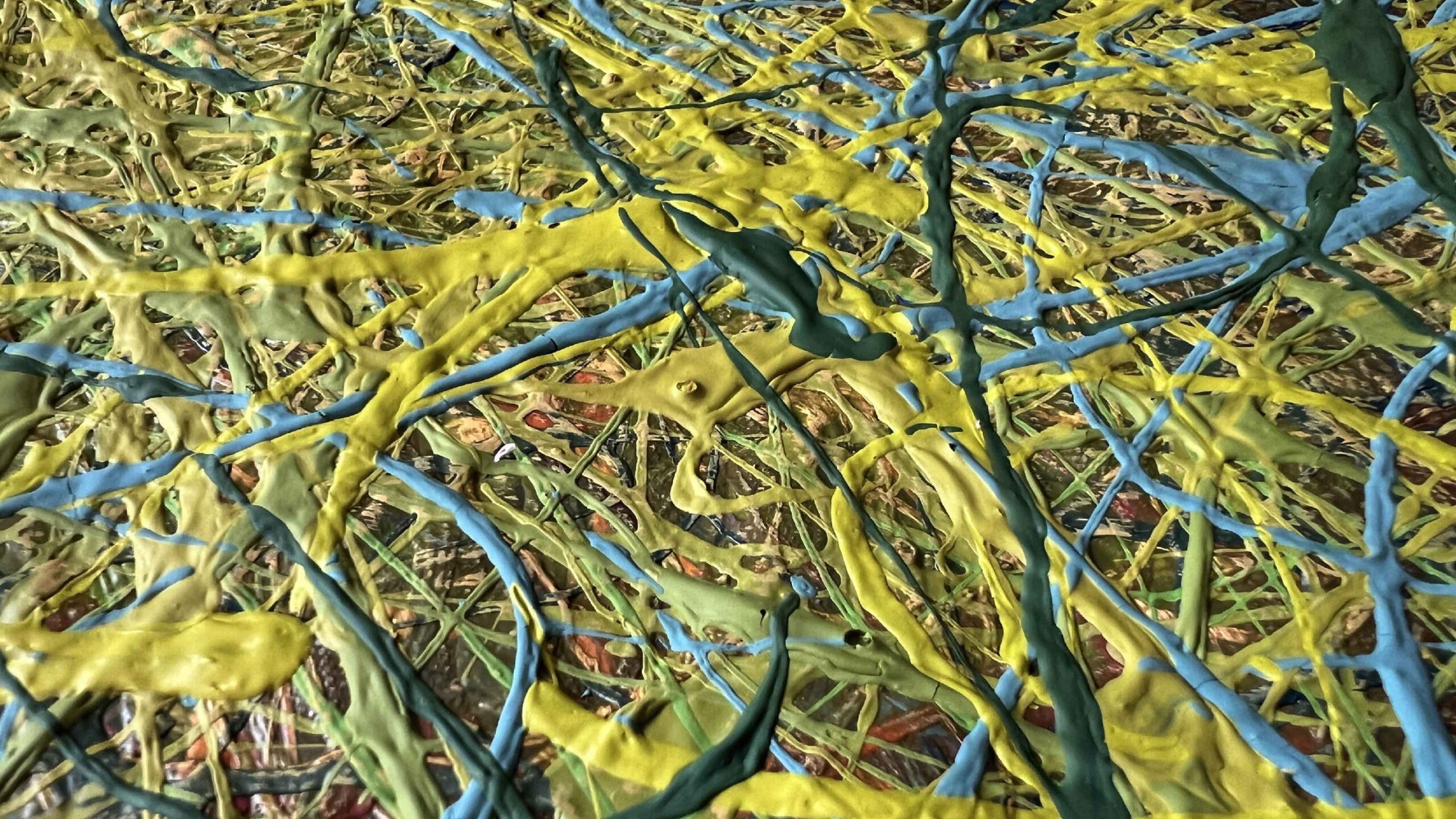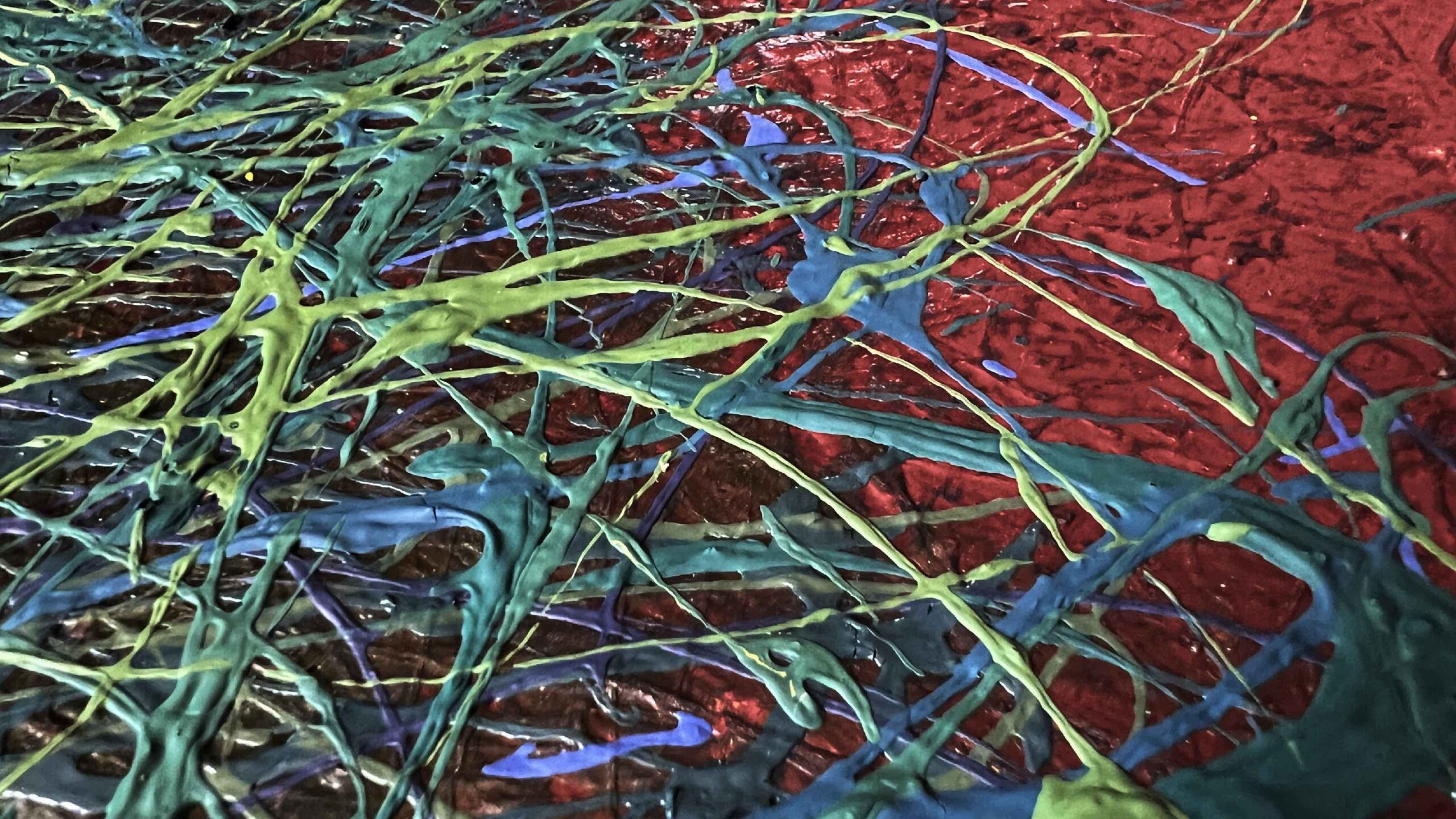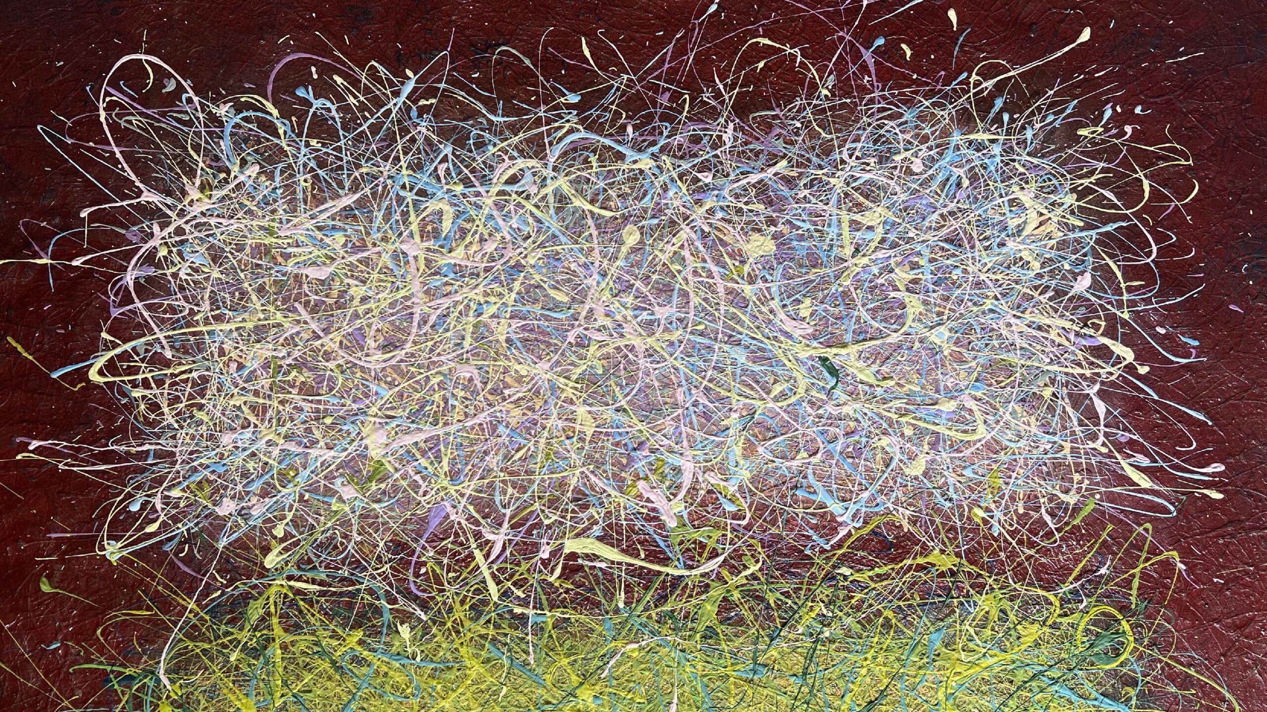 Countless multicolored splashes are layered one upon another, weaving a canvas of paint that plays with light and shadow — creating a surface alive with quiet movement and bold energy.