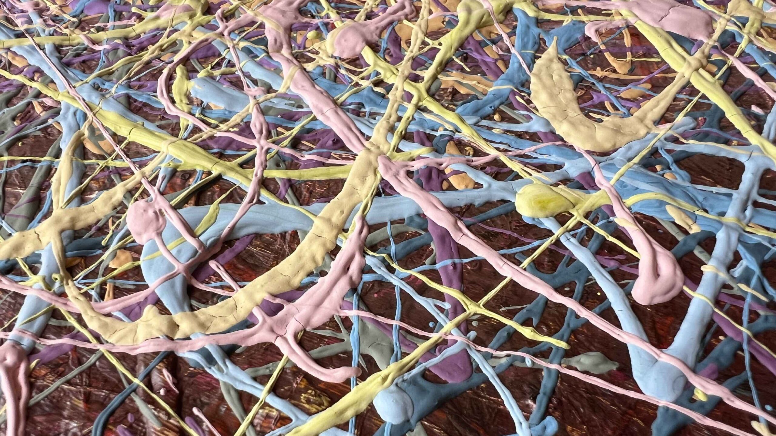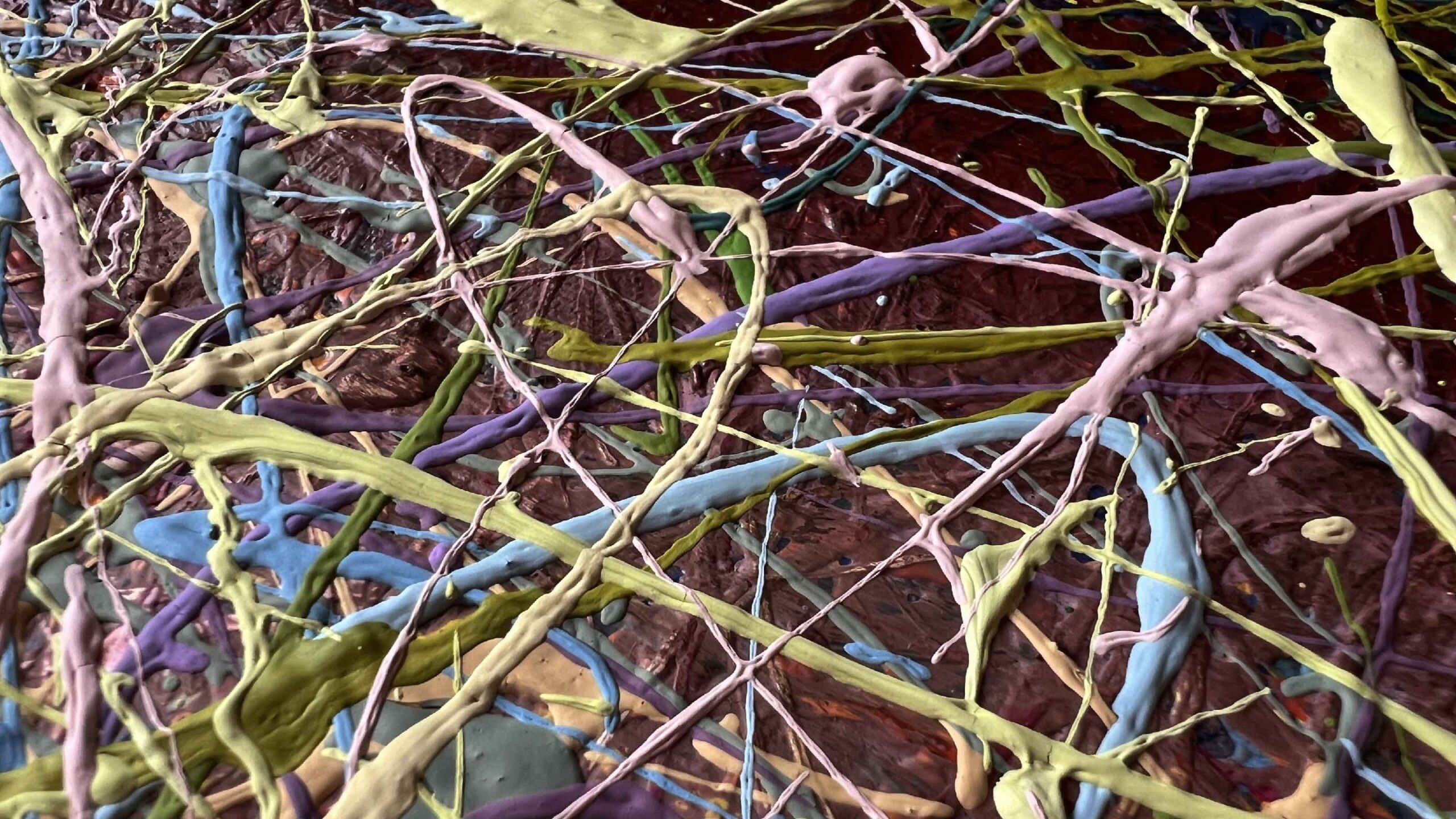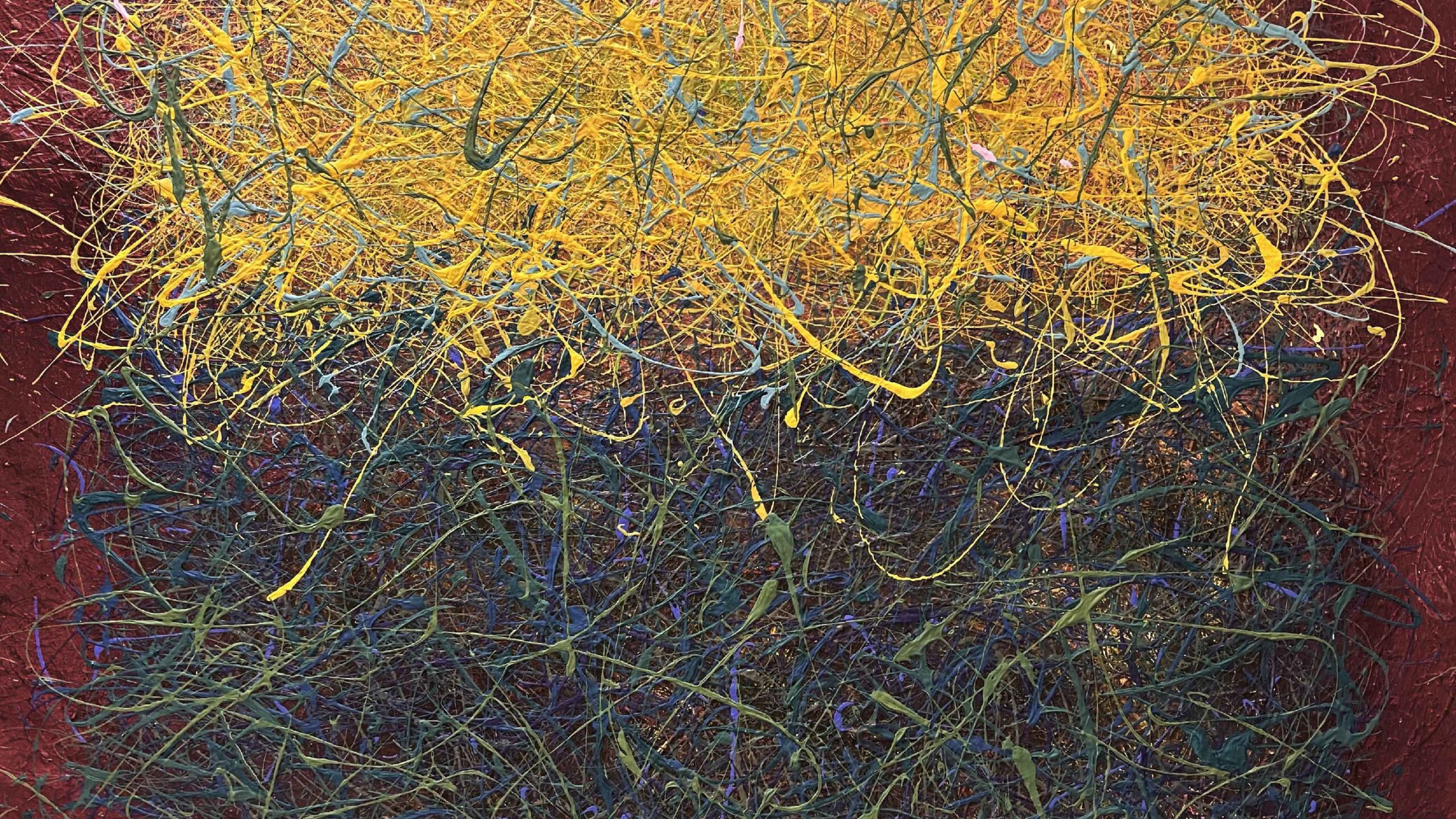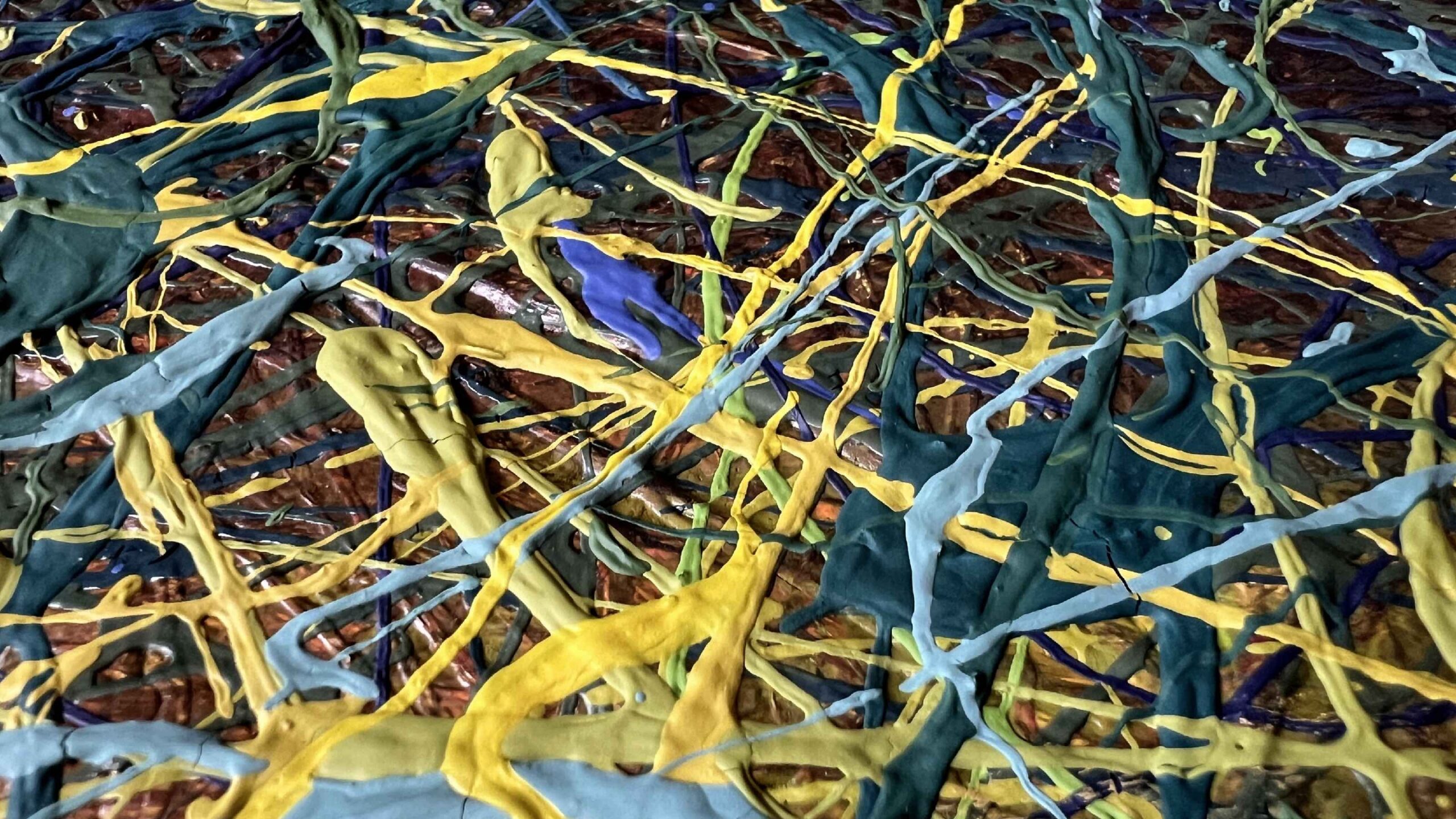 Countless multicolored splashes are layered one upon another, weaving a canvas of paint that plays with light and shadow — creating a surface alive with quiet movement and bold energy.