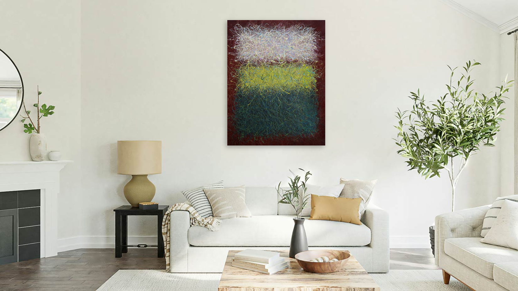 “Splashes. Green and Chocolate” by Nadine Antoniuk is inspired by Mark Rothko and the dynamic energy of Jackson Pollock.