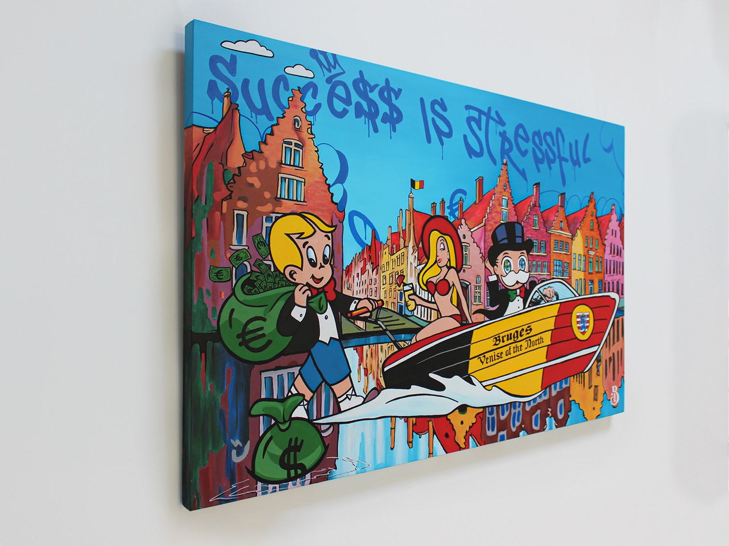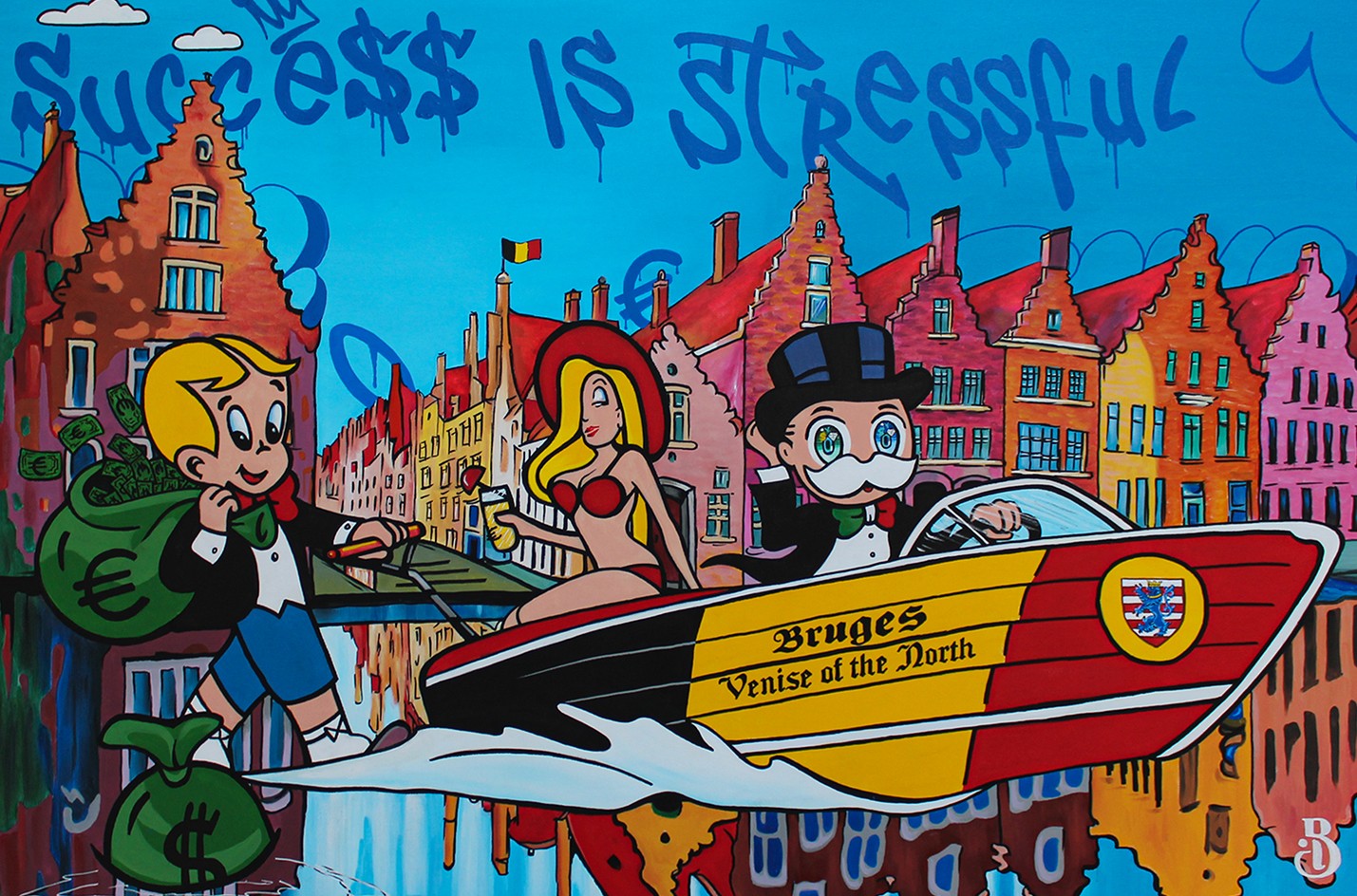 Mr Monopoly cruising on Lake Bruges, also known as the “Venice of the North”, the iconic character is depicted sailing on a luxurious yacht, surrounded by the trappings of wealth and success. Richie Rich, meanwhile, joins the adventure with a relaxed assurance, ignoring all money worries. Yet the title of the work, “Success is Stressful,” is an ironic message that underscores the often hidden costs of wealth and power. Despite the glitz and glamor of the scene, there is an underlying tension and unease. The exaggerated features and cartoonish imagery of the characters serve to highlight the absurdity and excess of the situation. The painting invites viewers to question the nature of success and the costs associated with the pursuit of wealth and power.