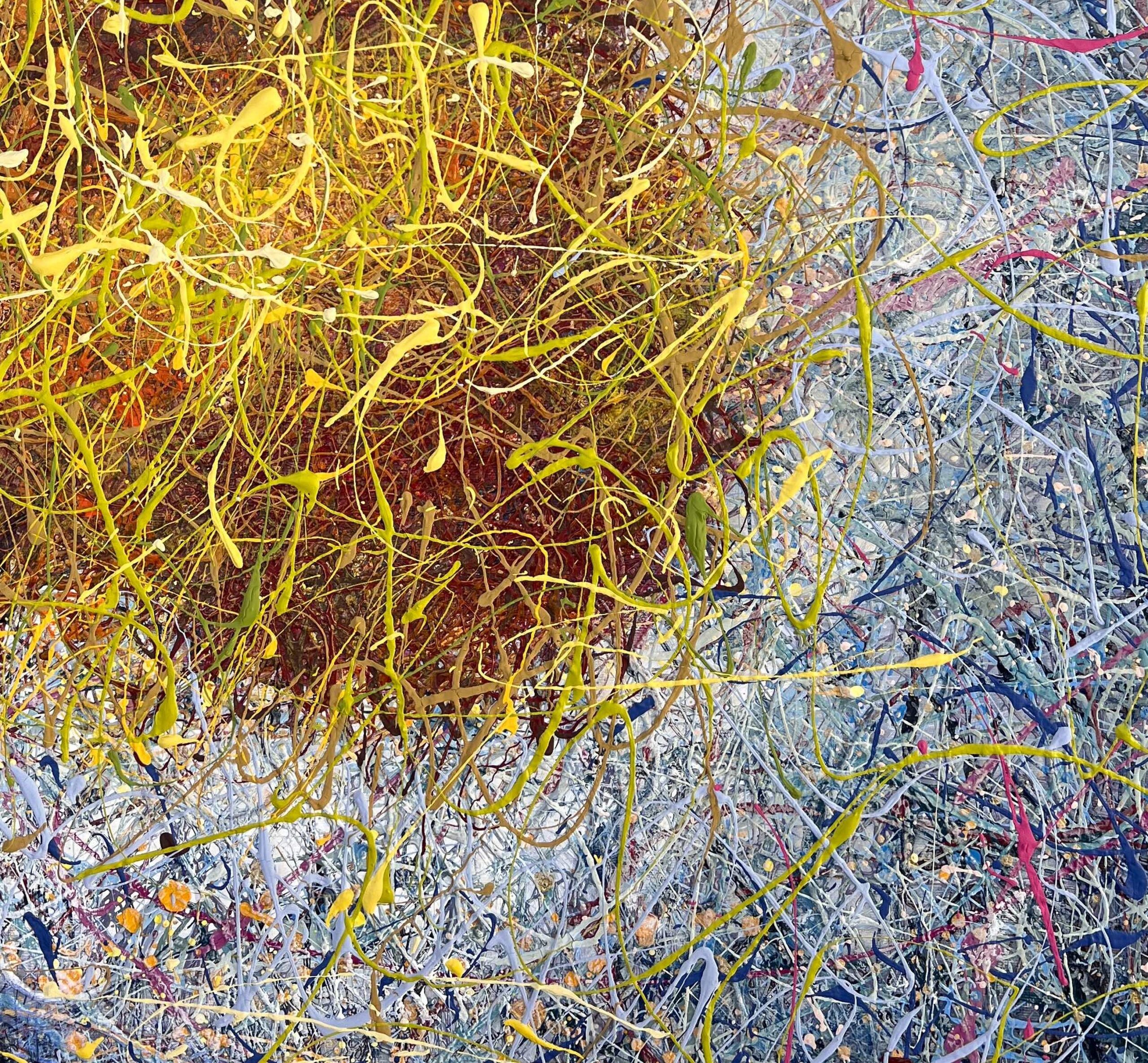 Crafted in my signature multilayer thread-paint technique, this piece carries over 50 layers of vibrant splashes and fine textures. The result is an immersive artwork that radiates from every angle, full of detail, nuance, and movement.