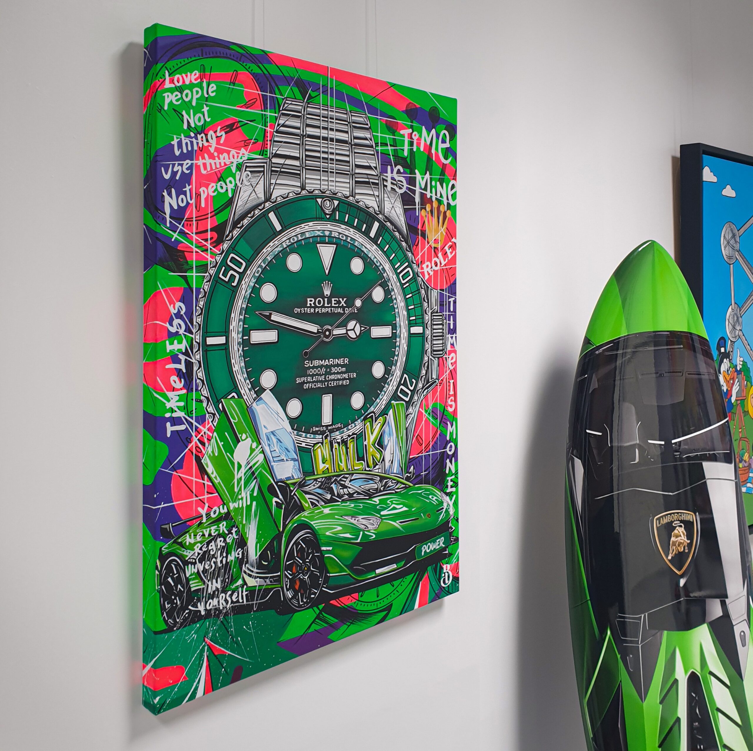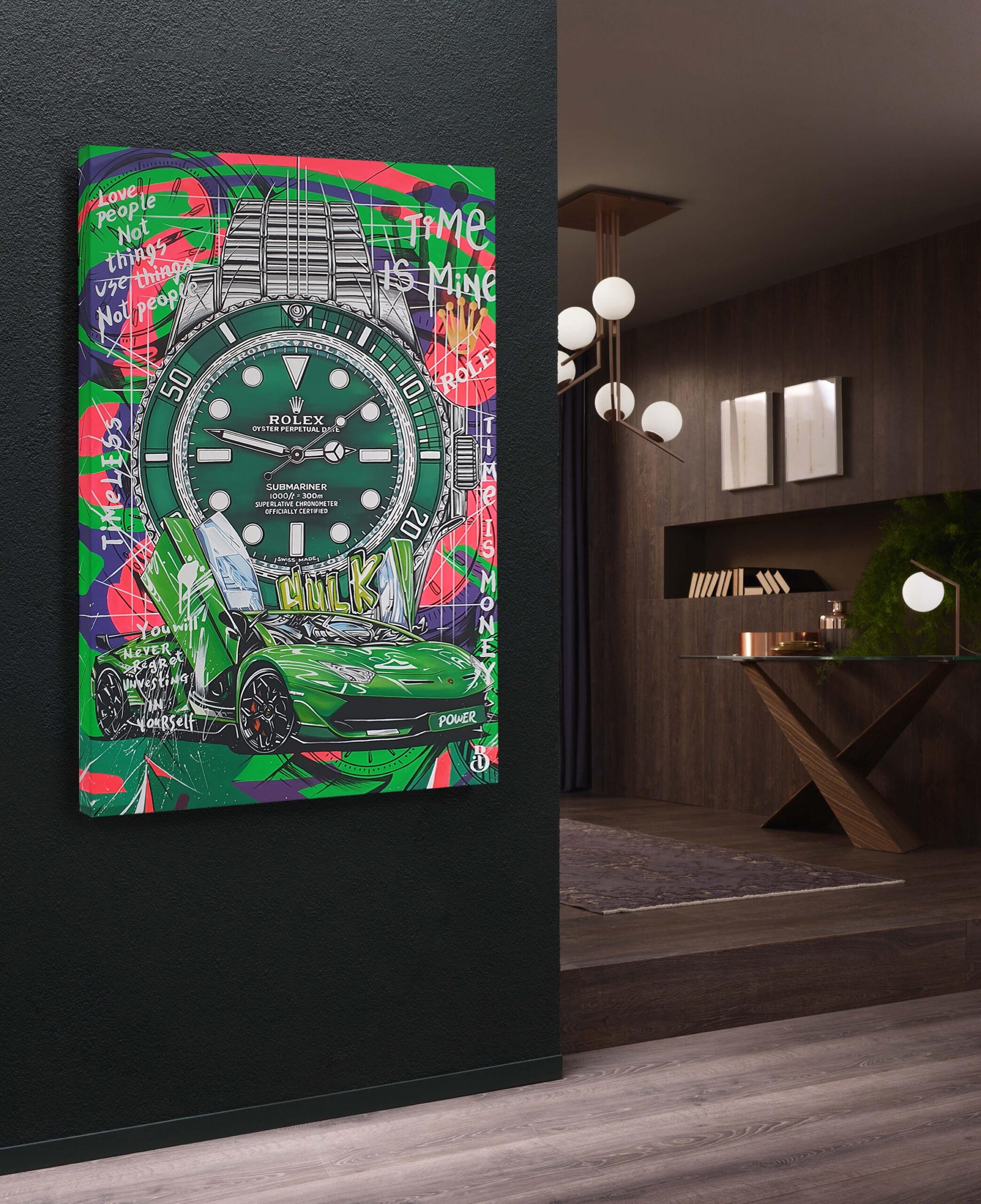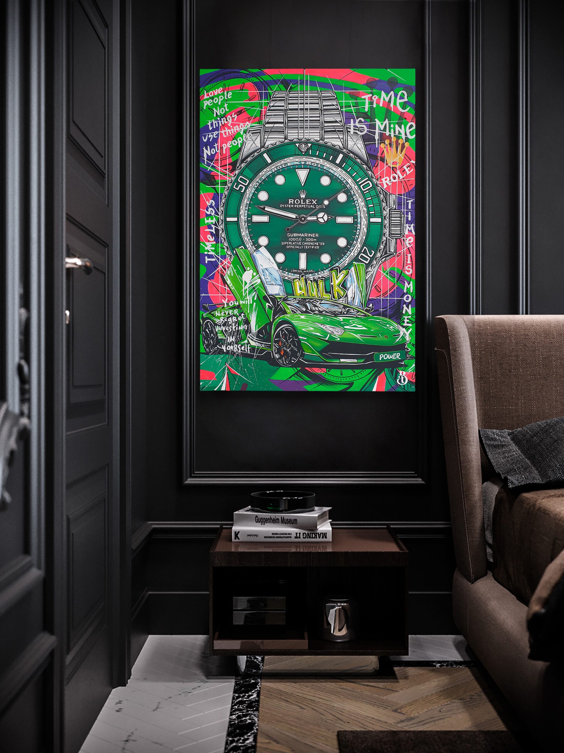 The Rolex Hulk Submariner is an iconic luxury watch known for its precision and durability. Paired with the green Lamborghini, a symbol of speed and power, the artwork conveys a sense of achievement and determination.