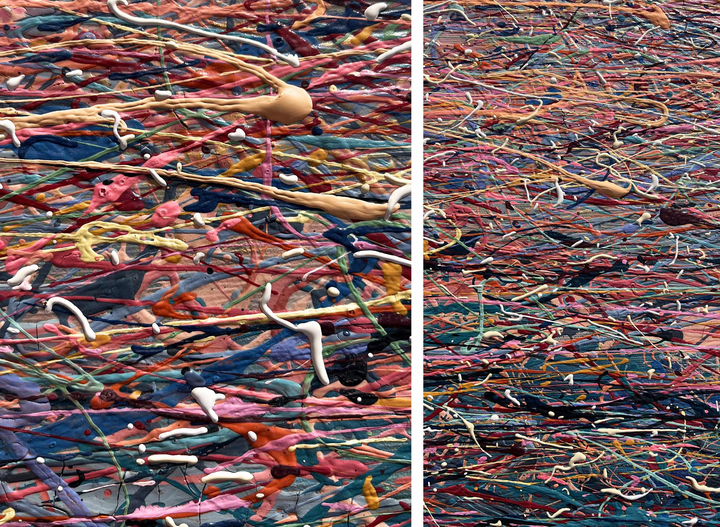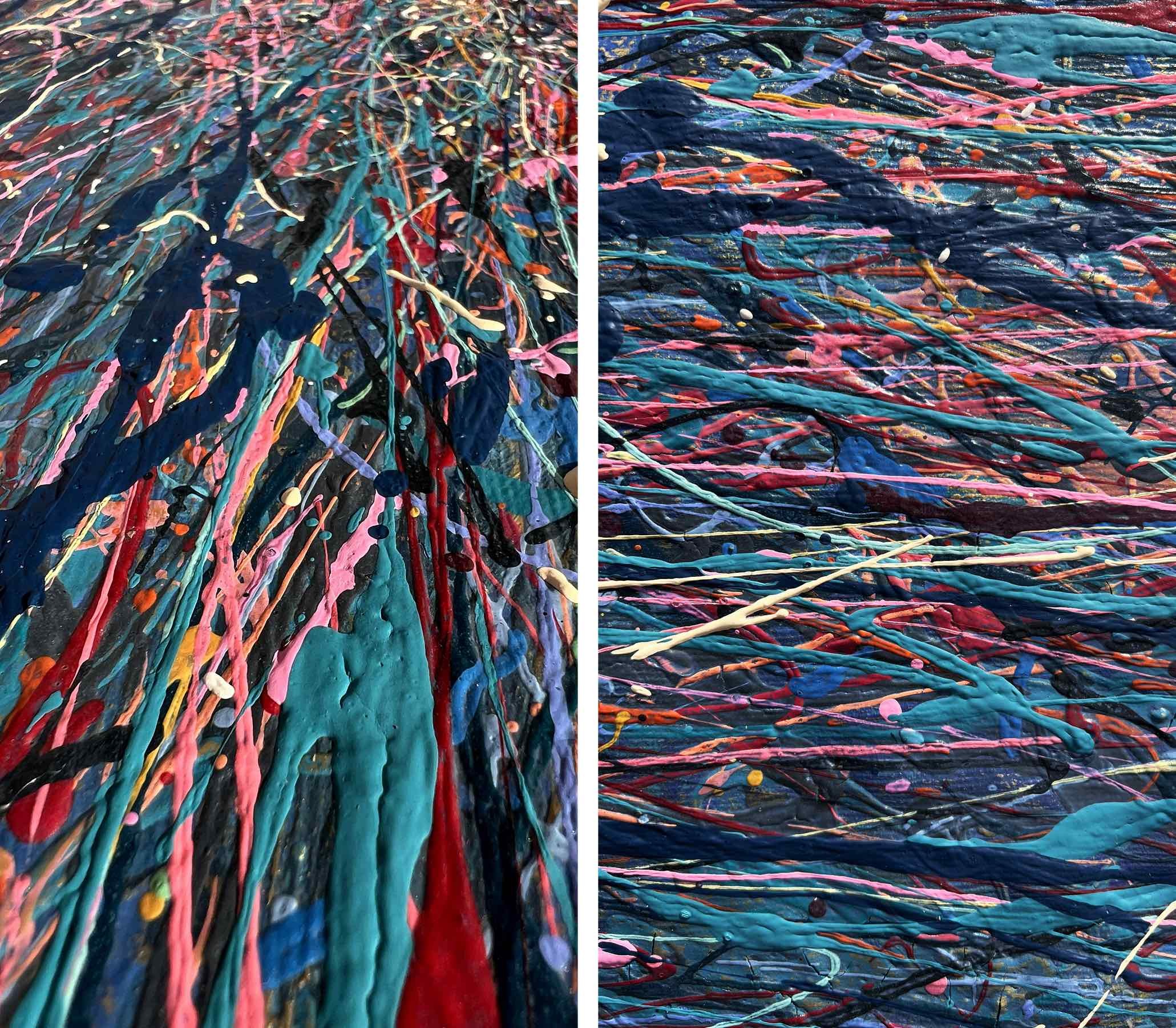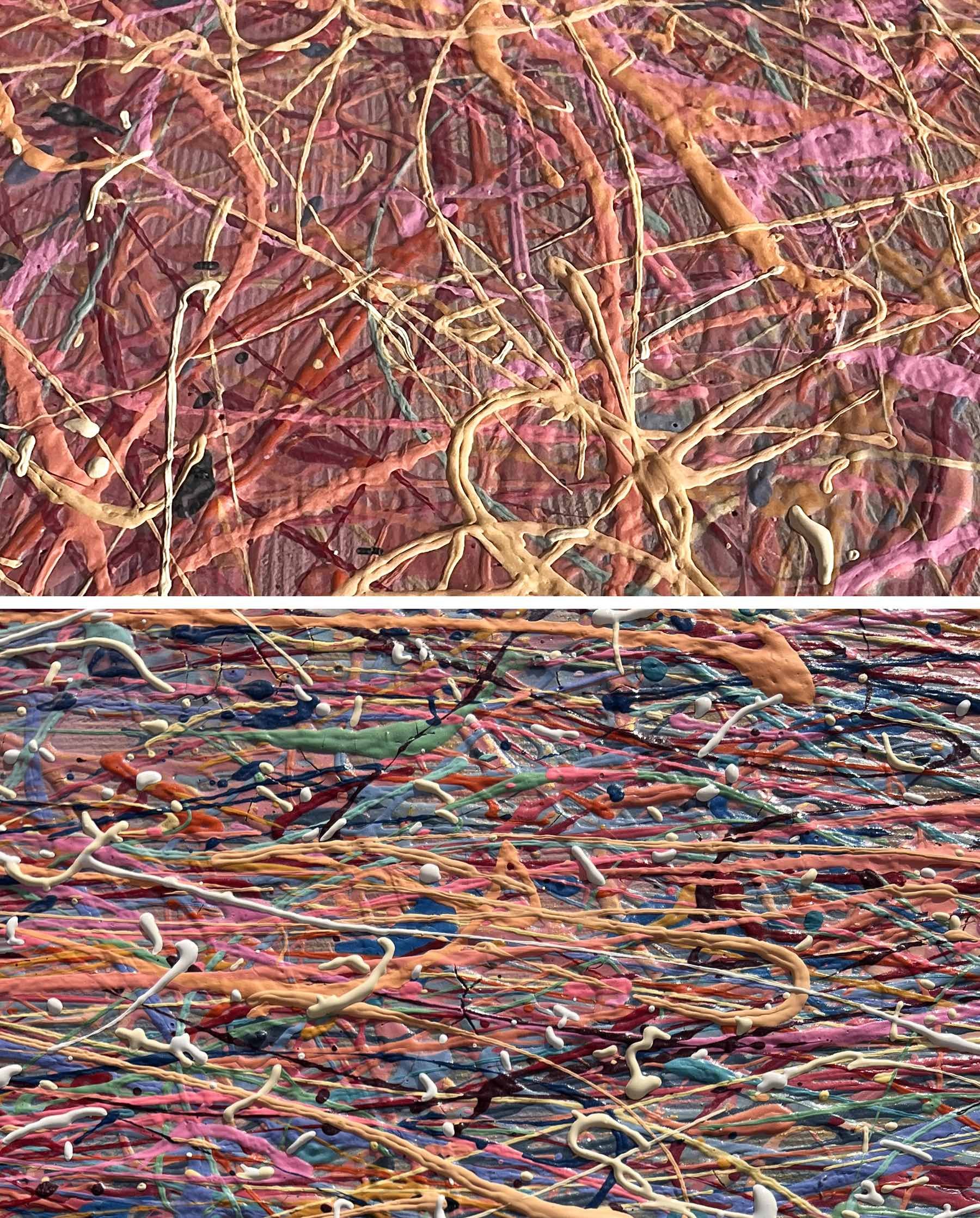 Painting style – the paint is applied in threads. The threads of paint seem to intertwine, creating their own canvas. Painting is made using multi-layer paint technique. A million multi-colored splashes dry before each subsequent coat of a colored the threads of paint is applied. In general, the painting has more then 50 layers of the application of colourful splashes.