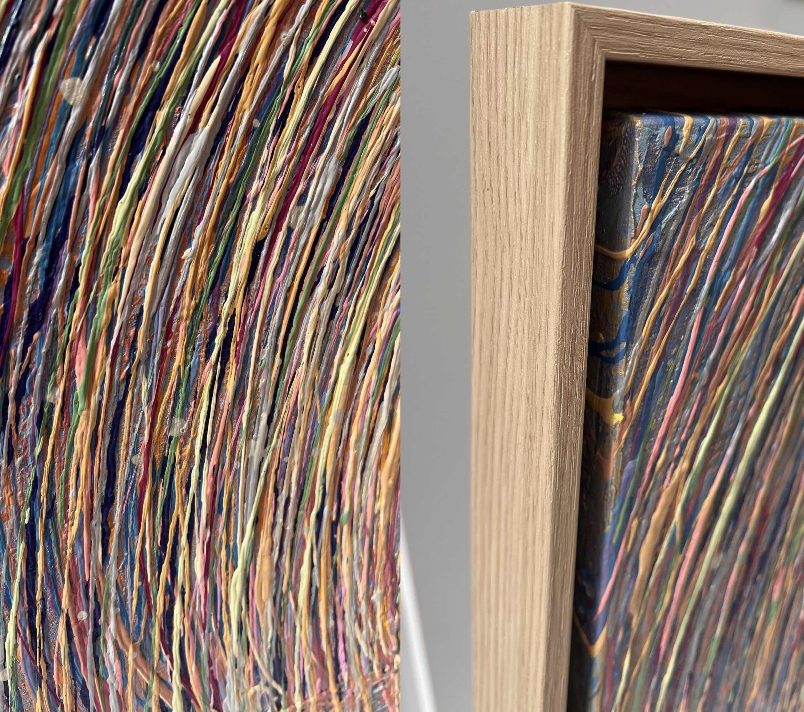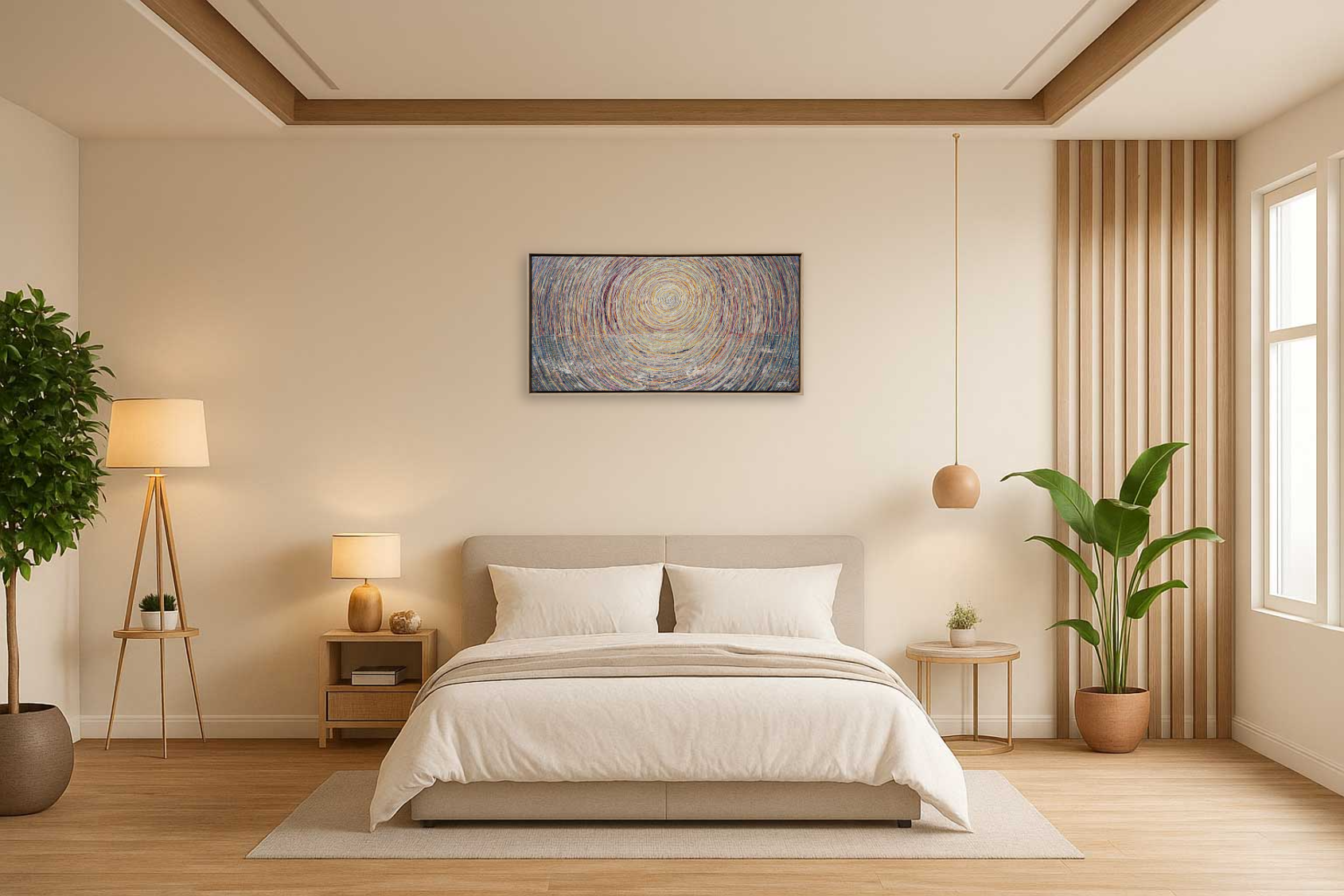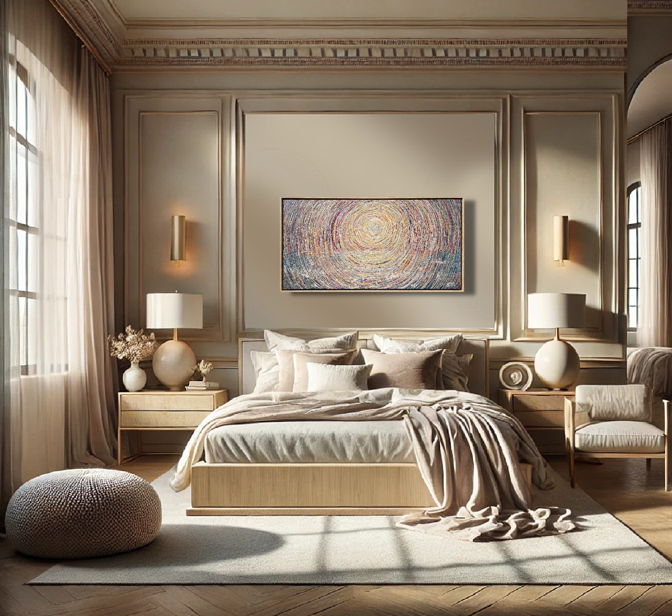 This luminous original painting (Threads of Sunlight by Nadin Antoniuk) captures the warmth of golden sunlight in soft beige and nude tones, layered with over 30 intricate applications of color. Created using a unique multi-thread paint technique, each stroke appears like woven strands of radiant light. Ideal for collectors seeking serene, high-end contemporary art that glows with quiet luxury.