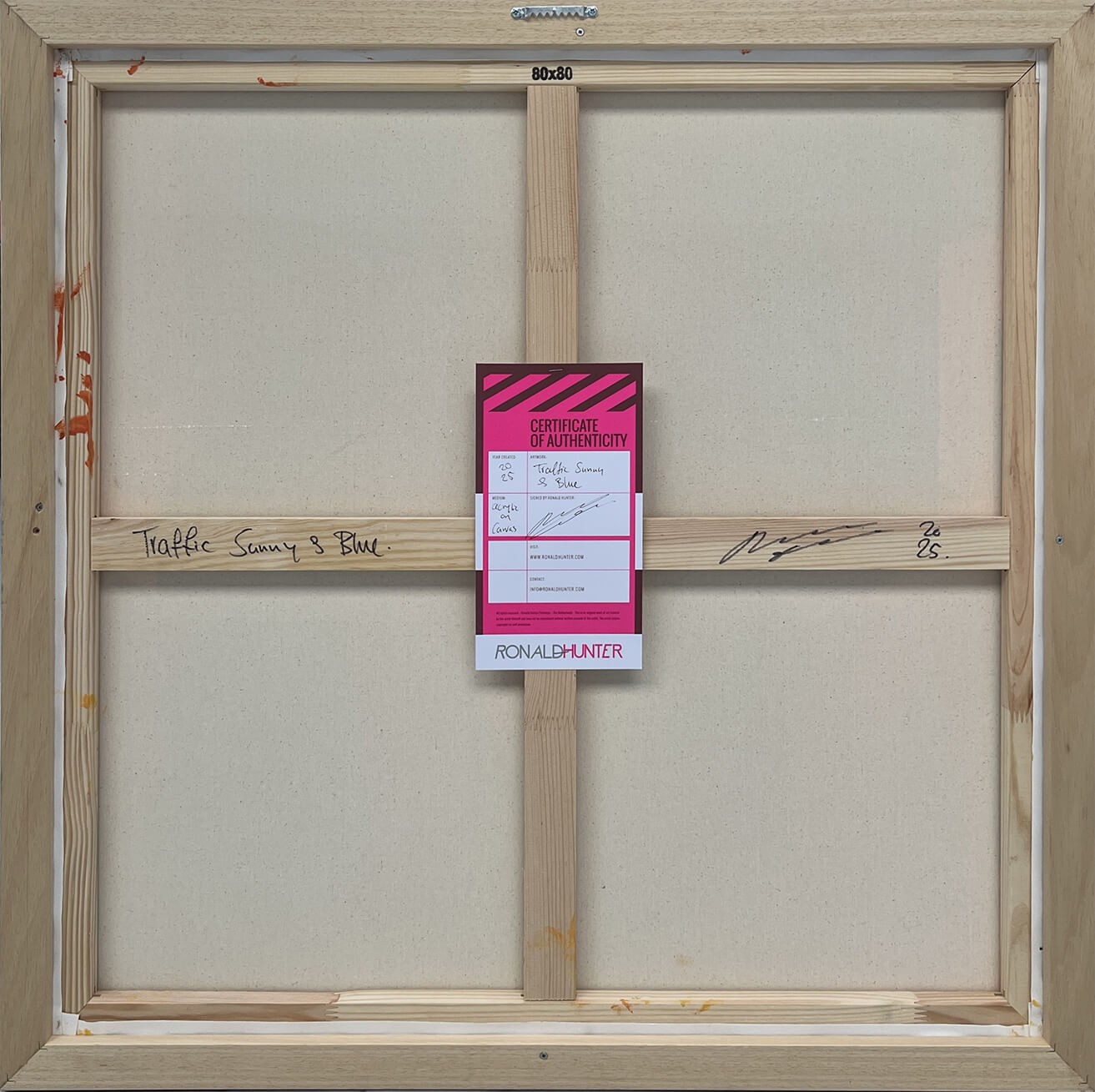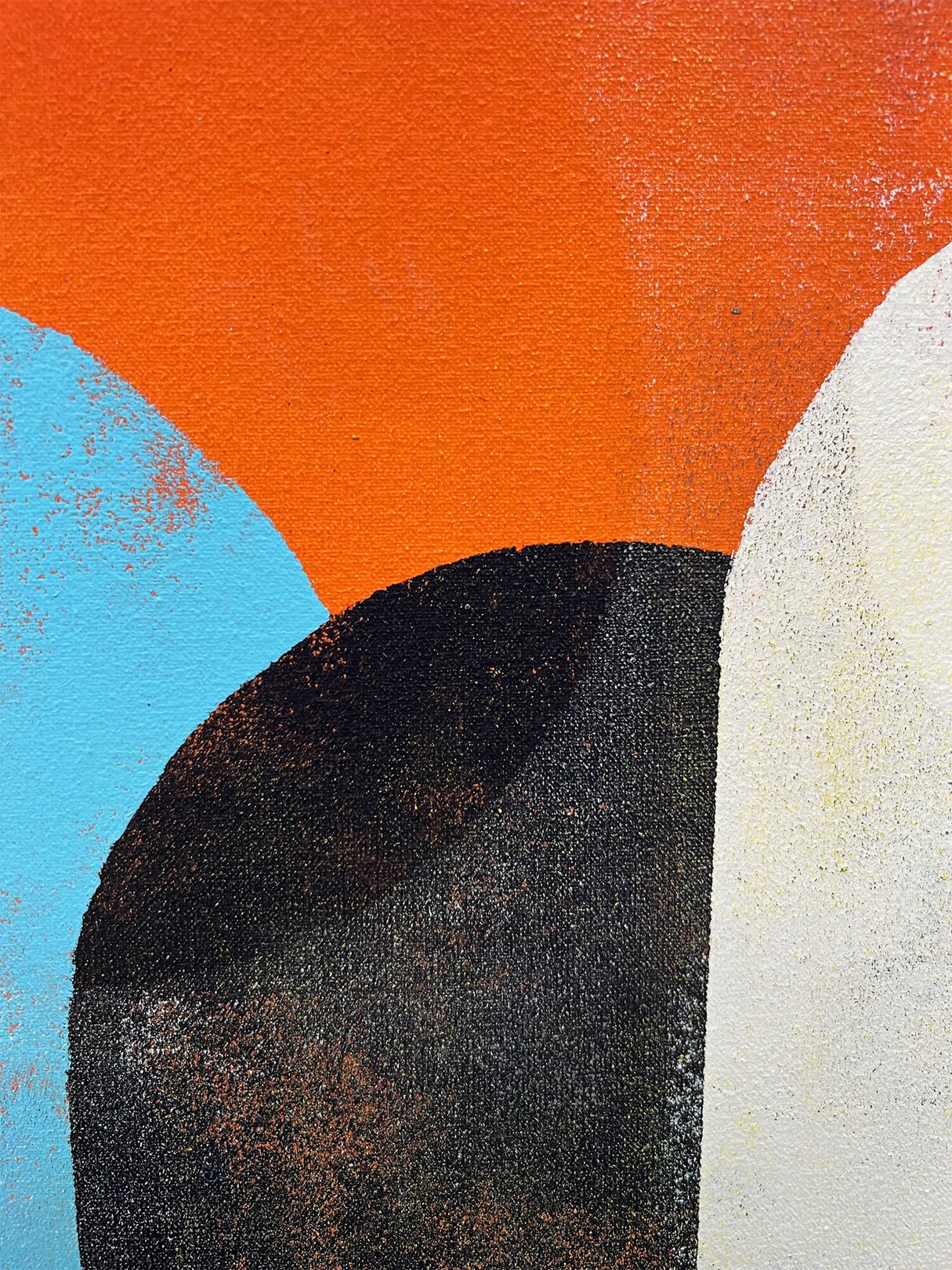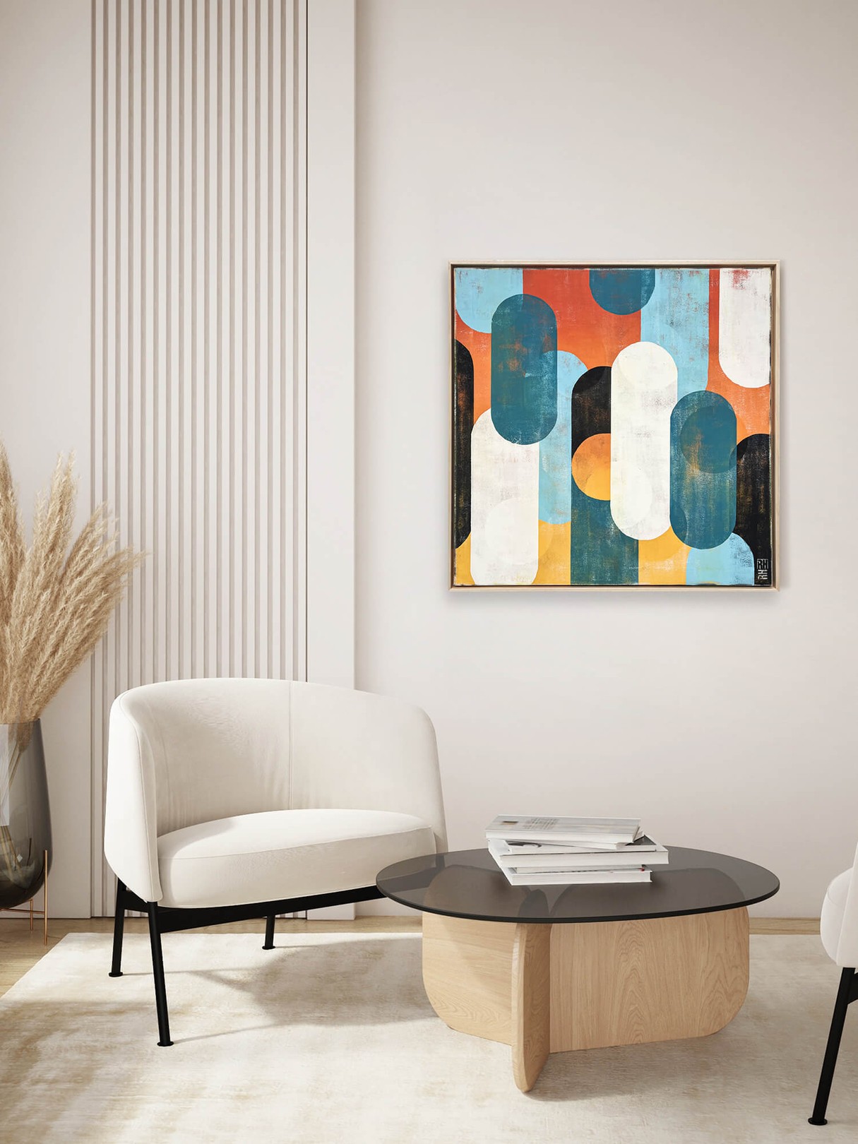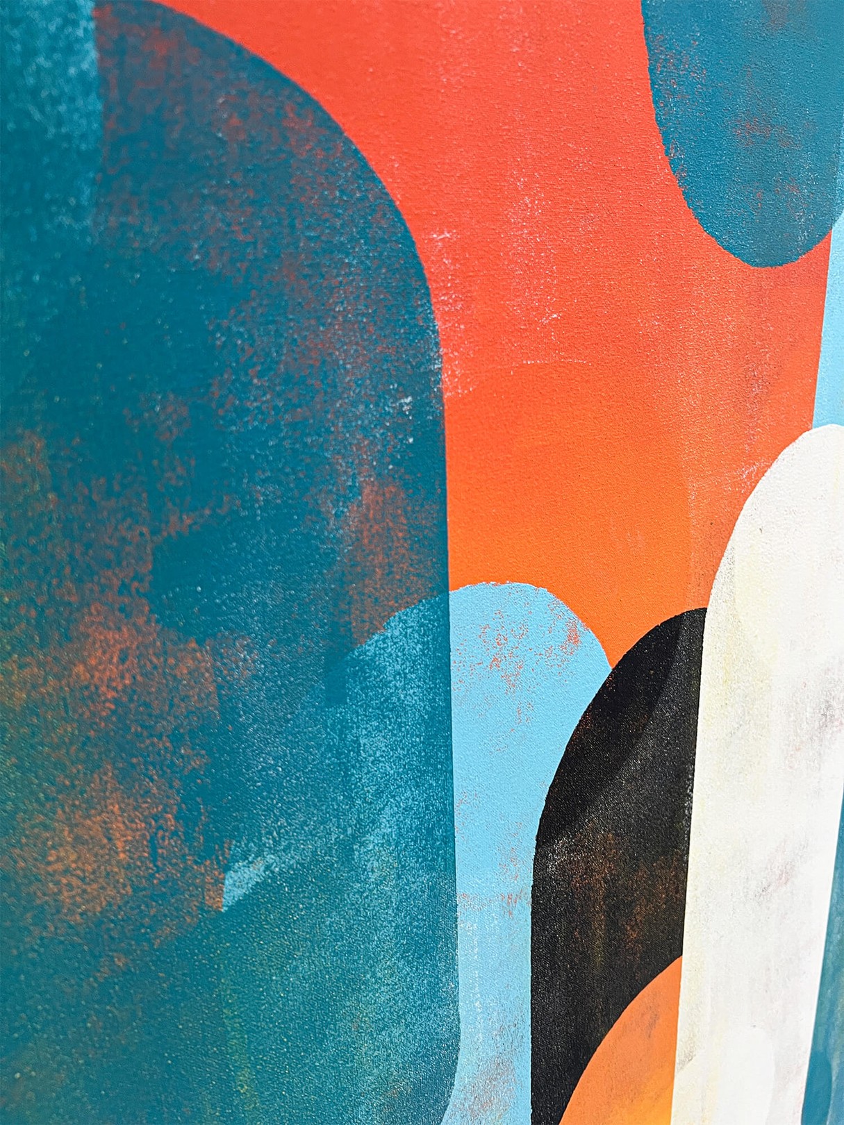 This artwork (Traffic Sunny & Blue by Ronald Hunter) features an abstract geometric composition, characterized by a harmonious arrangement of elongated oval shapes. The palette is a vibrant blend of turquoise, burnt orange, mustard yellow, and muted white, creating a dynamic contrast that captures attention. The textured application of paint suggests a vintage, distressed aesthetic, adding depth and interest. The interplay of overlapping forms creates a sense of movement and fluidity, inviting viewers to explore the intricate relationships between colors and shapes. Each oval appears both part of a cohesive whole and as an individual element, illustrating the balance between unity and diversity. The artist’s signature is subtly placed, underscoring the work’s authenticity. This piece is a compelling representation of modern abstract art, showcasing bold design and evocative color contrasts.