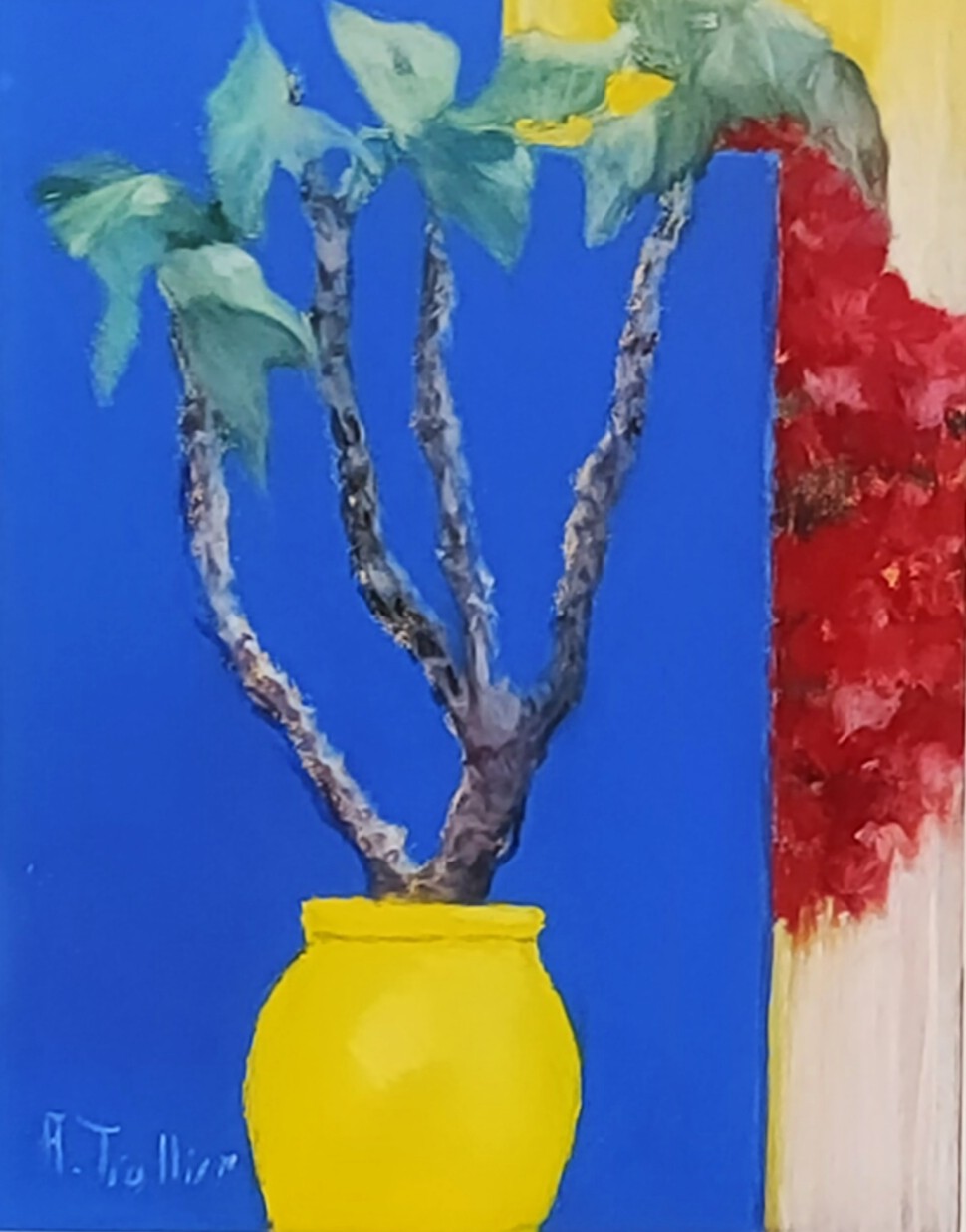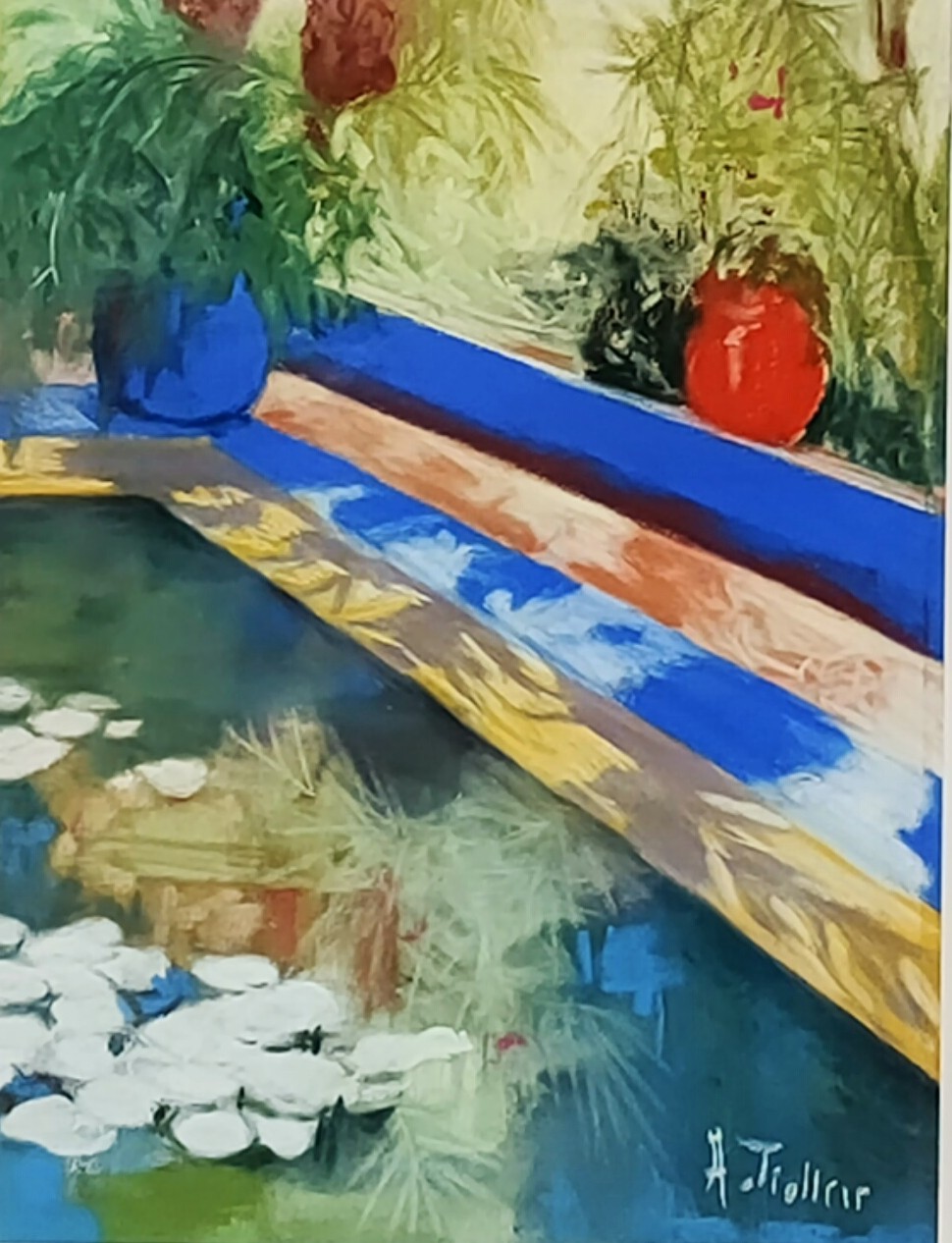 This vibrant triptych juxtaposes three exquisite floral scenes, united by a bold color palette. On the left, a bright yellow vase holds lush green foliage, contrasting with a deep blue background. The central scene captures a tranquil pond where delicate water lilies float, surrounded by lush vegetation. A playful red pot rests on the edge, adding a touch of warmth and vibrancy. On the right, bright red flowers bloom, rising gracefully against a cobalt blue backdrop. The artist masterfully handles color harmony, internalizing contrasting forces to create a composition that is both dynamic and balanced. The varied textures and meticulous details invite the viewer to immerse themselves in each panel, revealing a world of tranquility and radiant beauty. This work celebrates nature with passion, capturing the very essence of a lush garden in full bloom.