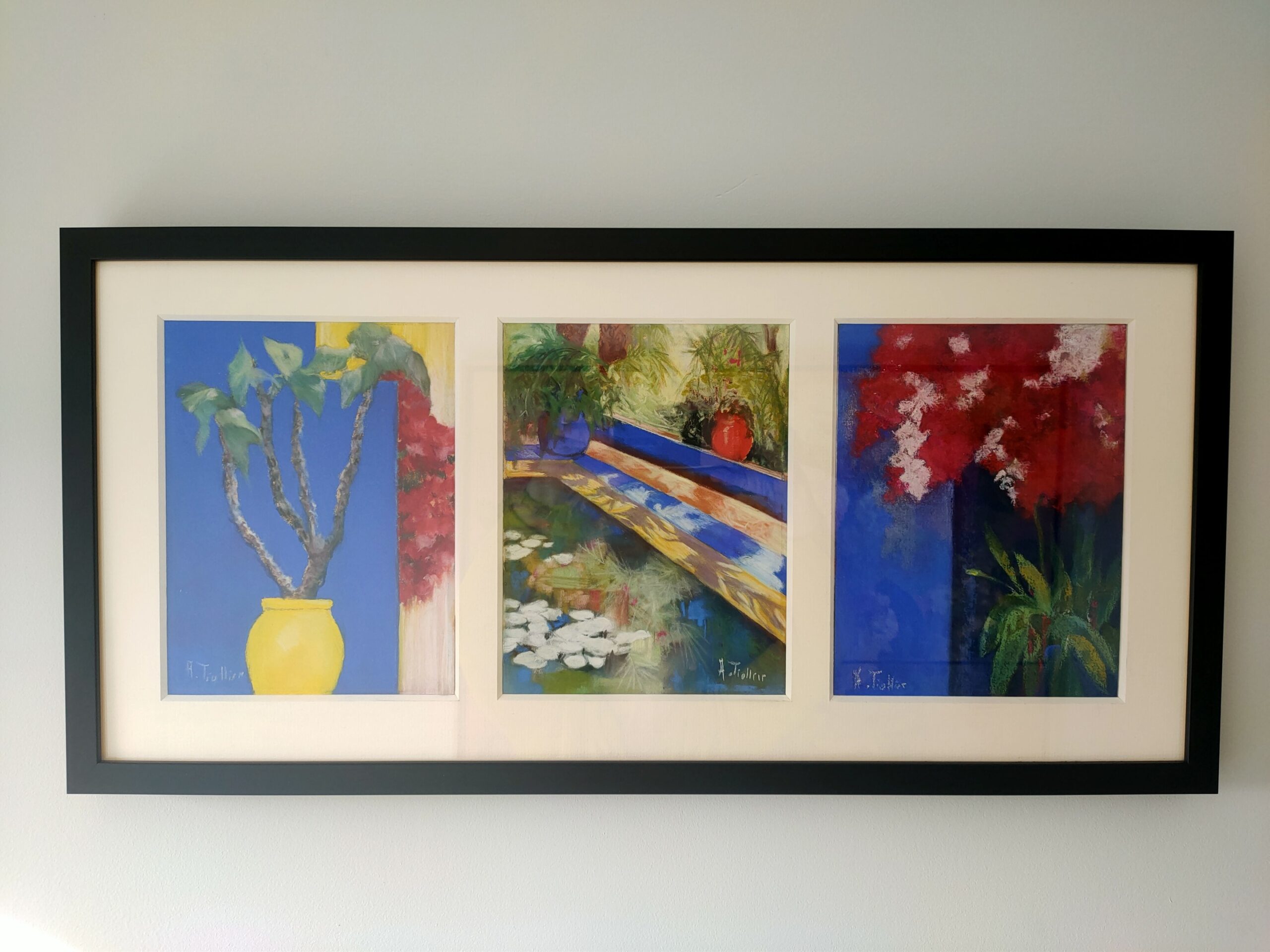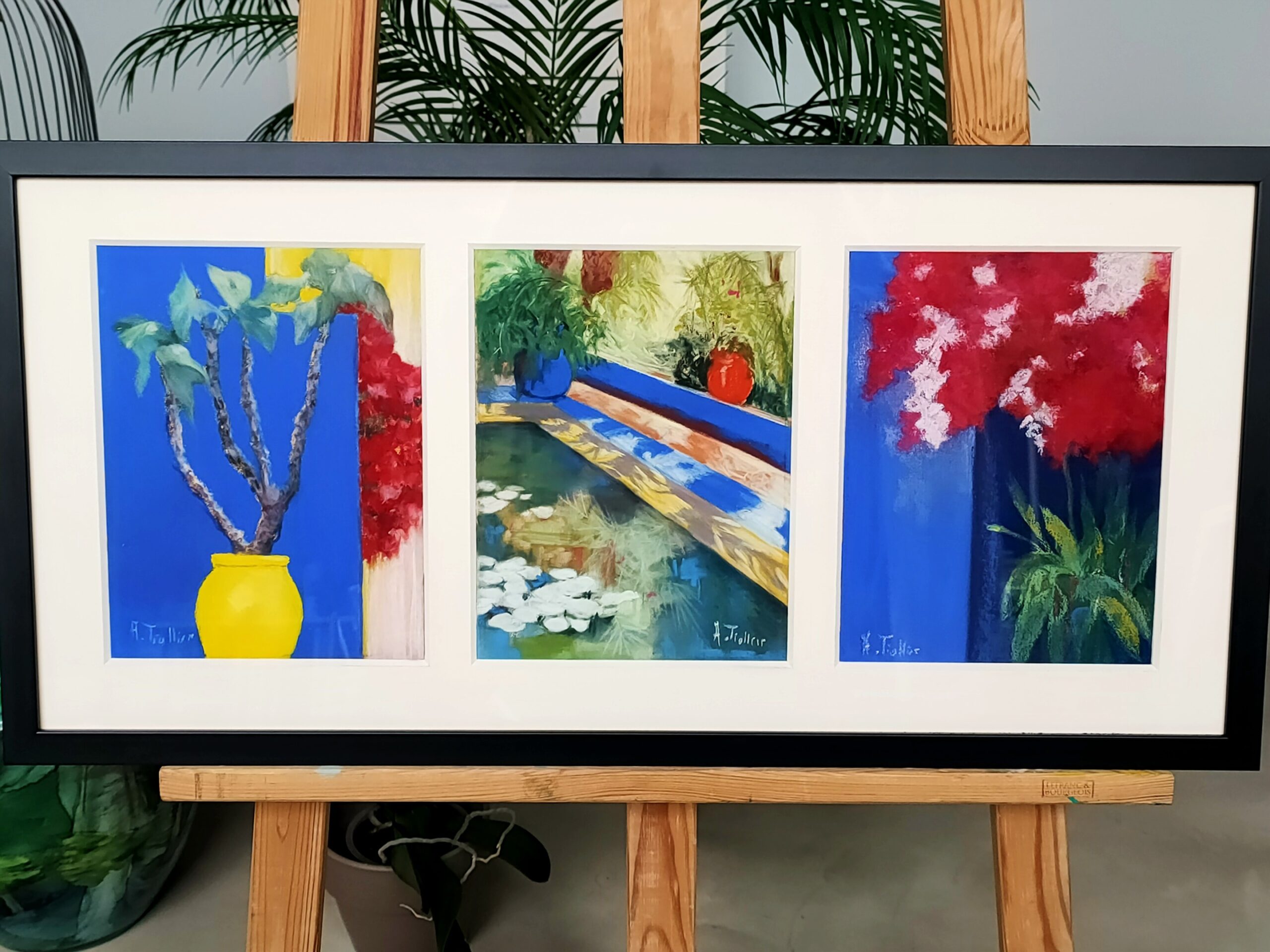 The artwork (Trilogie Majorelle by Agnès Tiollier) is available for pickup at BelArt Gallery in Brussels, Belgium, or it can be delivered to the address of your choice within 2 to 3 weeks after your order is confirmed. The artwork is insured during transportation, so there’s no risk. Origin: Belgium.