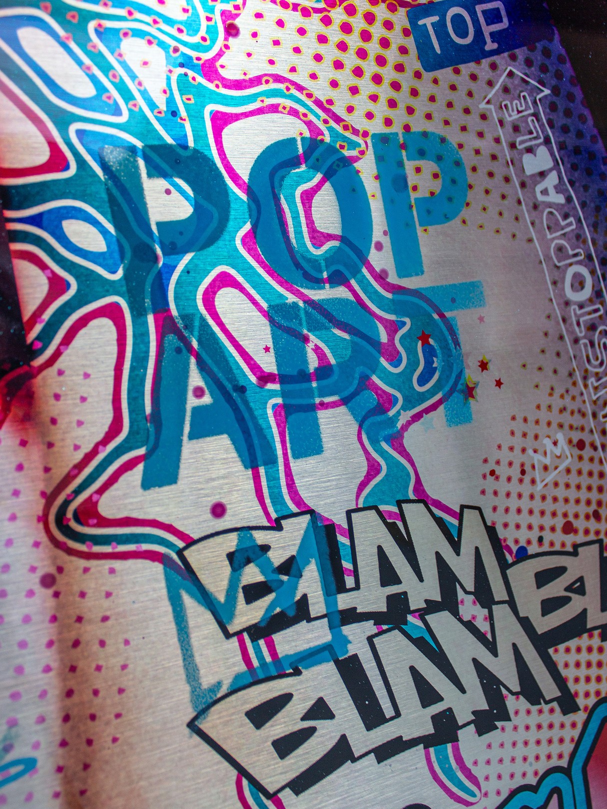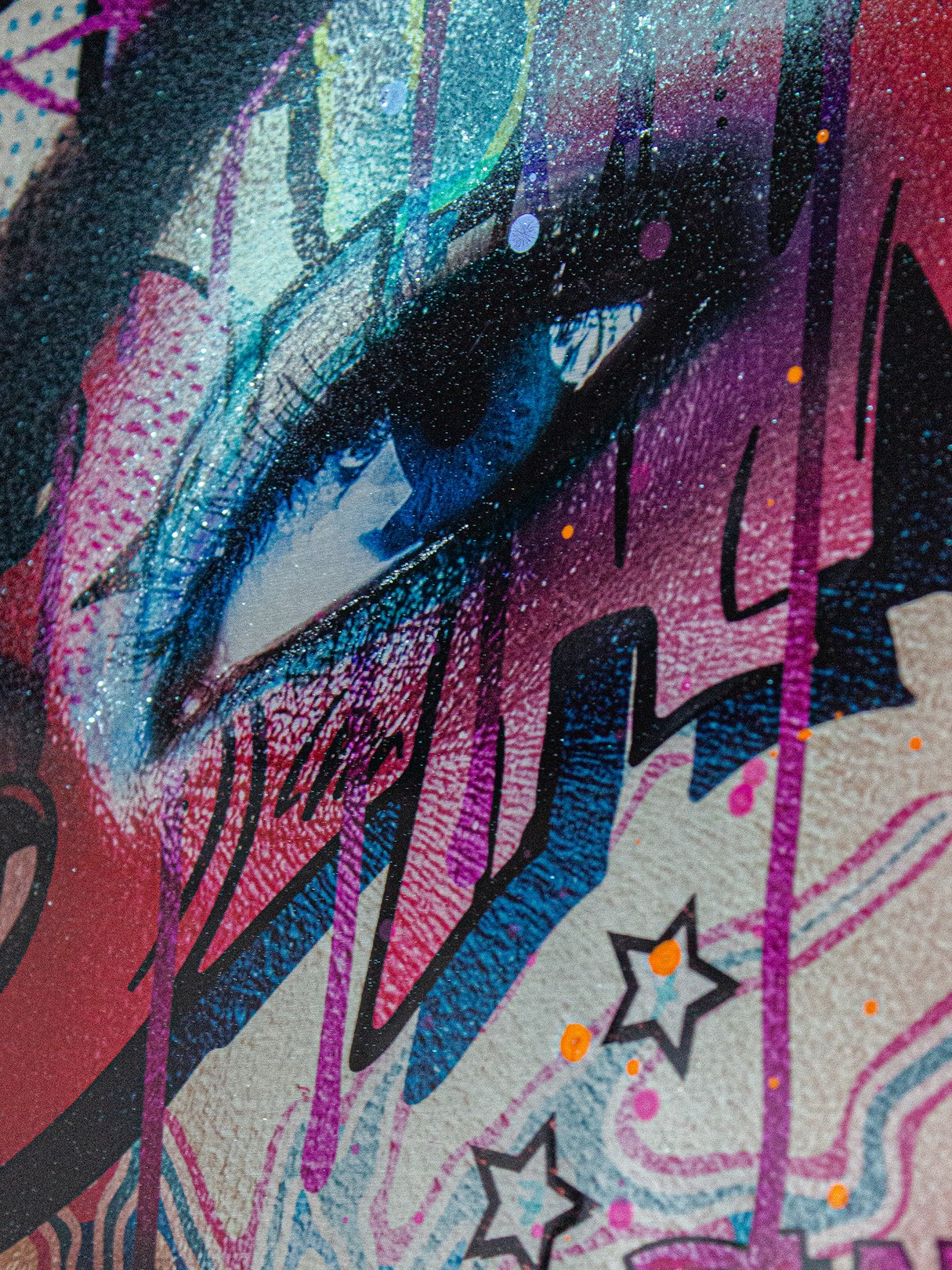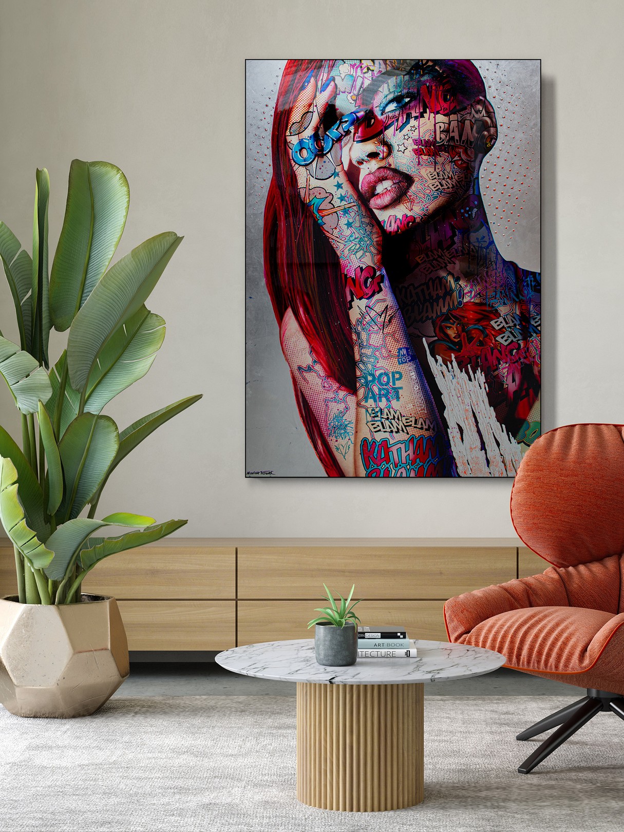 This artwork by Monika Nowak is a striking fusion of pop art and urban aesthetics, featuring a hyper-stylized female portrait overlaid with vibrant graffiti-inspired elements. The subject’s expressive gaze and red hair are accentuated by bold comic book-style typography—“BANG!”, “POP ART”, and “BLAM”—that explode across her skin like tattoos. Using a mixed-media approach, Nowak creates a layered narrative of empowerment, rebellion, and cultural commentary. The metallic background adds a contemporary edge, while the saturated colors and dynamic lines embody the energy of street culture and modern femininity.