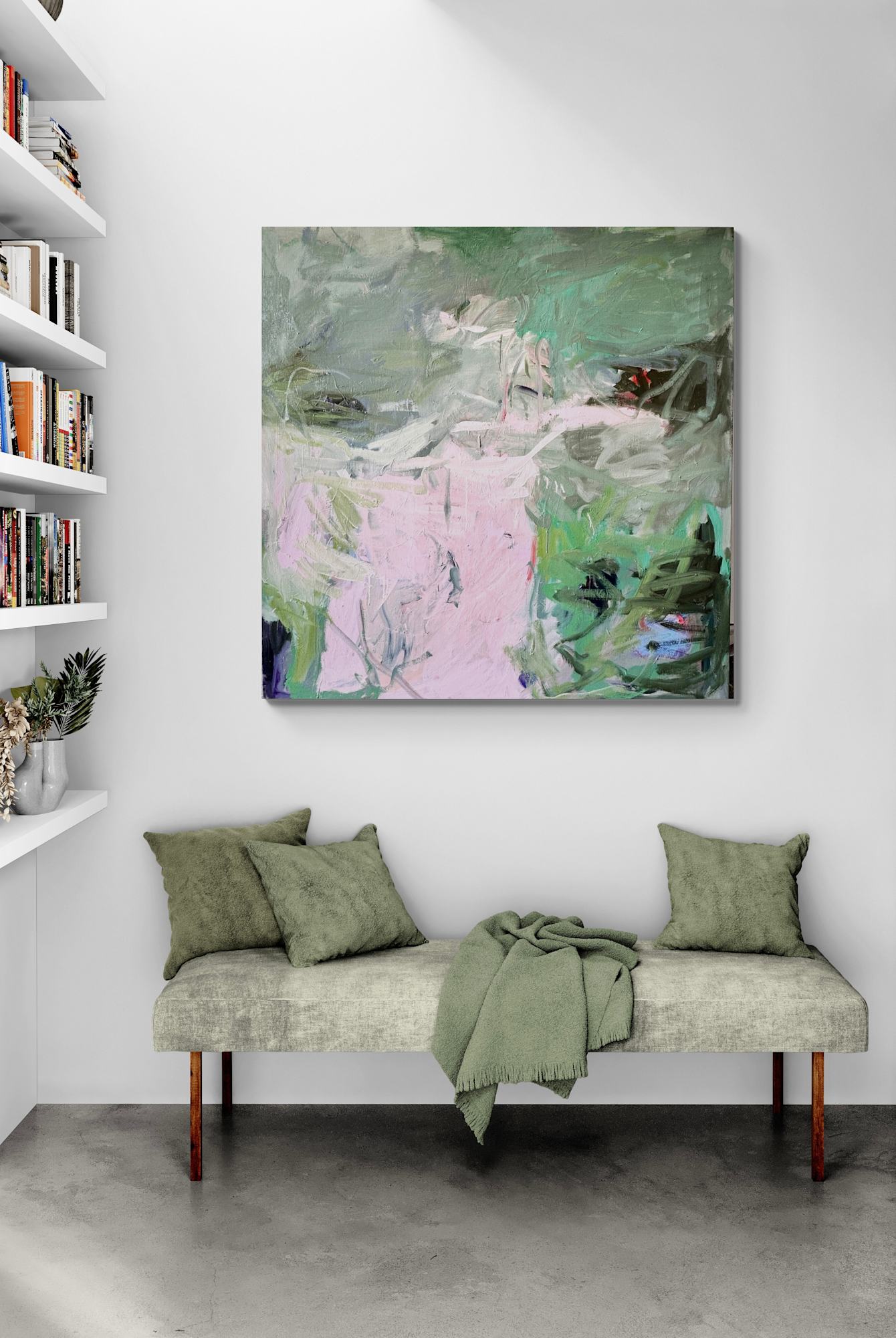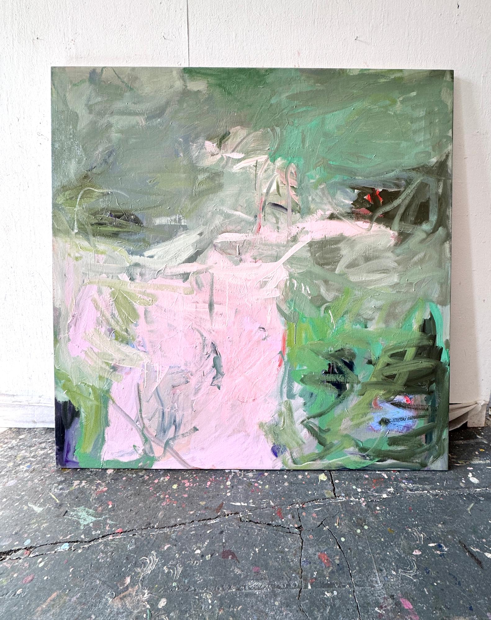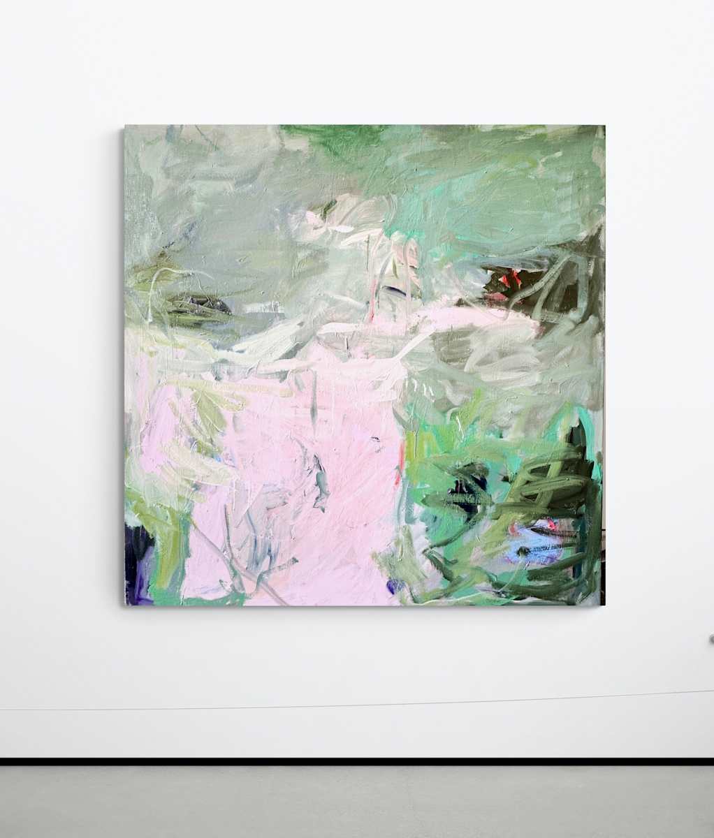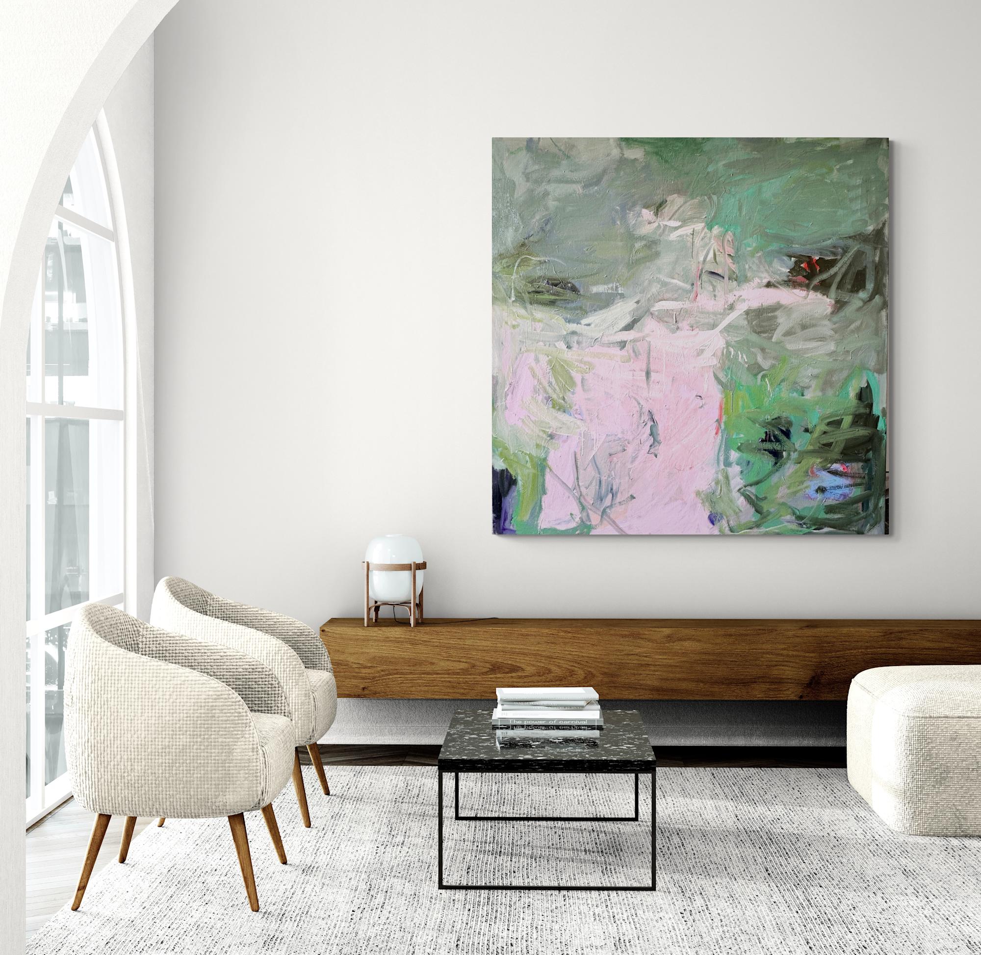 This artwork (We Danced (II) by Petra Schott) presents a captivating blend of abstract forms and muted color tones. Dominated by hues of soft pink and various shades of green, the piece is a striking exploration of color and texture. Dynamic brushstrokes create a sense of movement and depth, drawing the viewer into a complex visual experience. The interplay of light and shadow is skillfully executed, adding a three-dimensional quality to the canvas. Intriguing patterns emerge from the abstract chaos, inviting interpretations of nature or emotion. This artwork stands out for its emotional resonance, achieved through its bold yet harmonious composition. The subtle interaction of colors and textures creates a compelling visual narrative, making it a distinctive and thought-provoking piece.