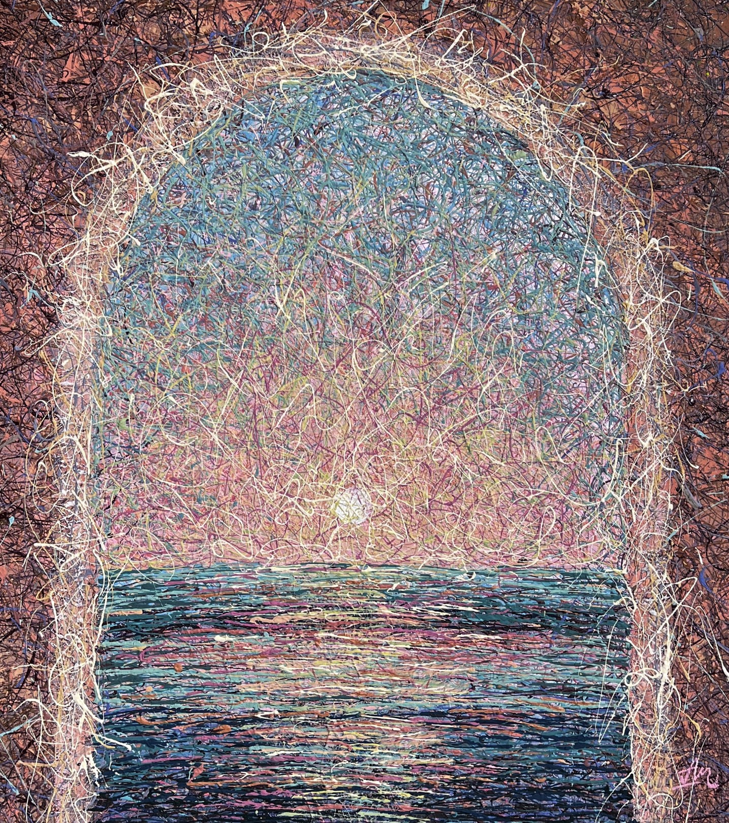 This large textured artwork is a visual meditation on transformation and renewal. The world holds its breath as the first light spills gently over the horizon. It’s not just a sunrise—it’s a quiet revolution. The sky, once cloaked in silence, awakens with strokes of amber, rose, and gold, as if the universe itself remembers to hope again.